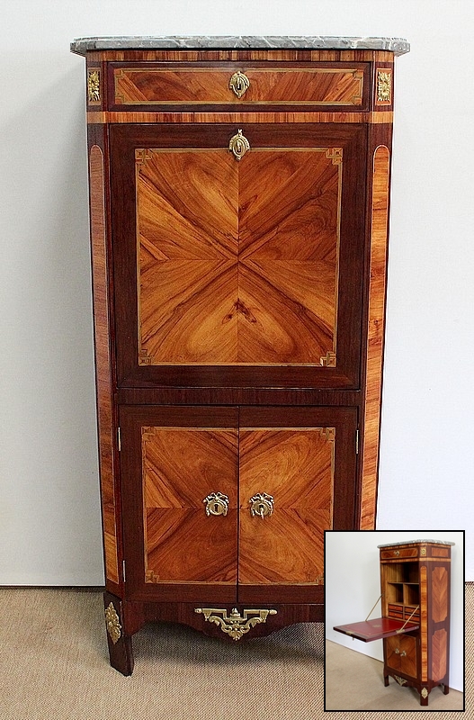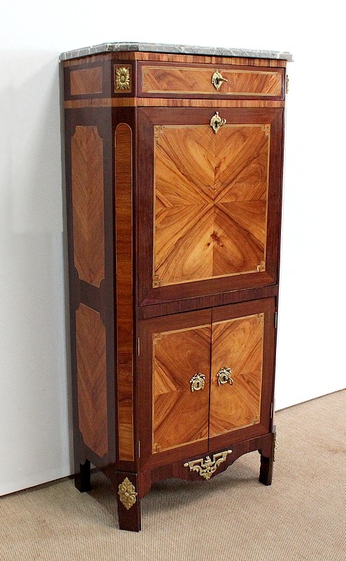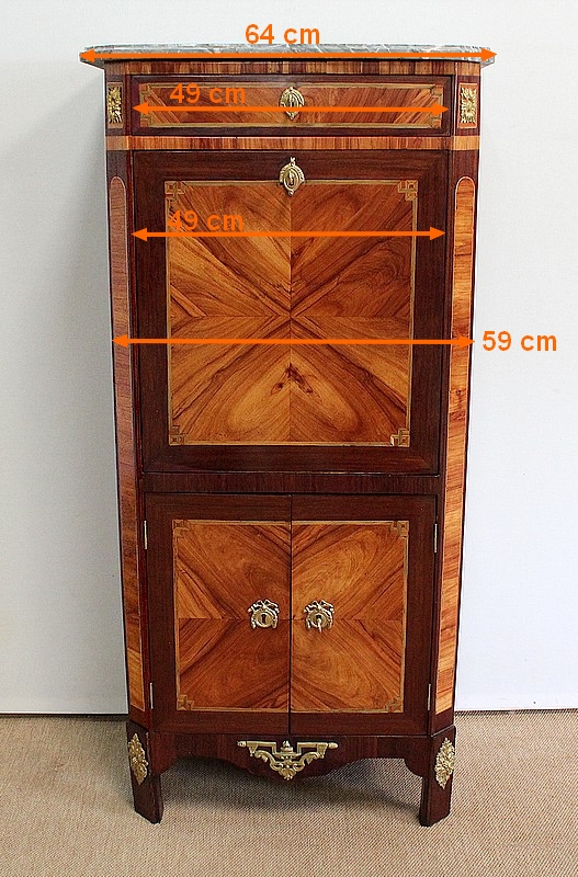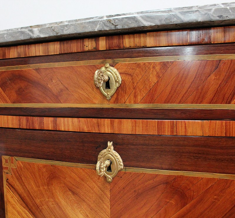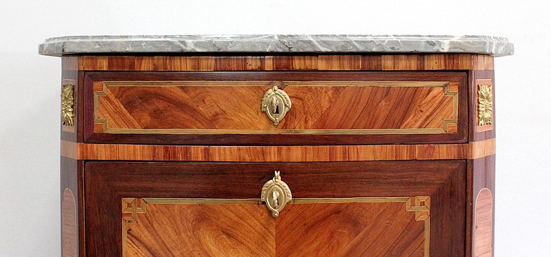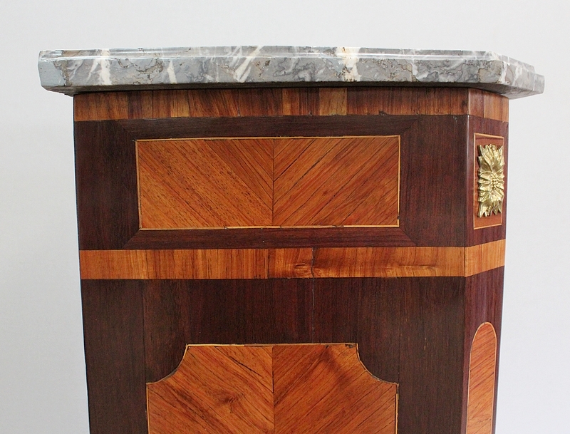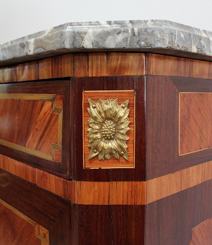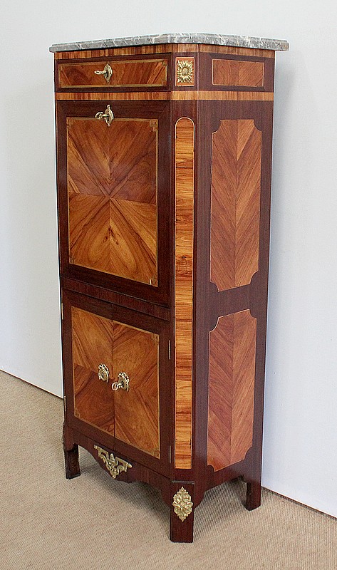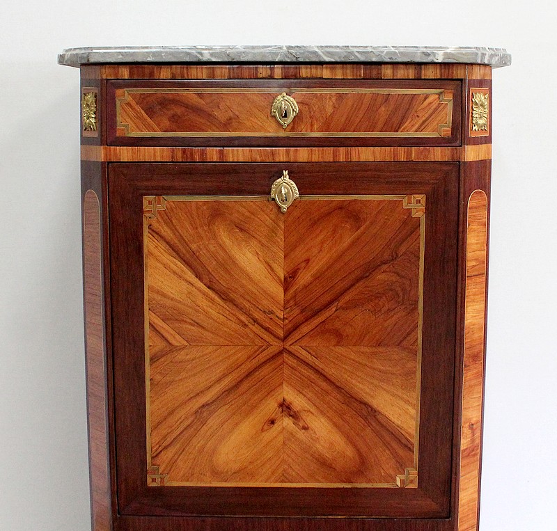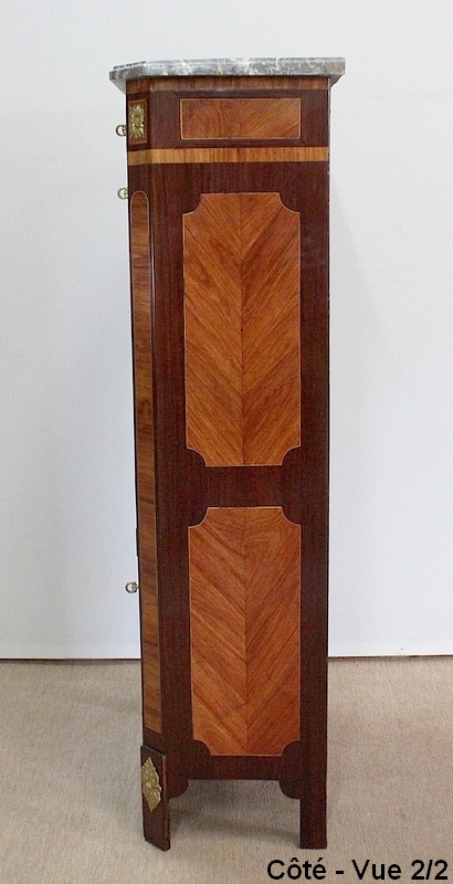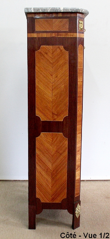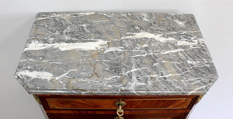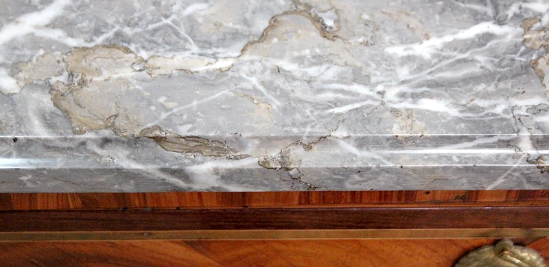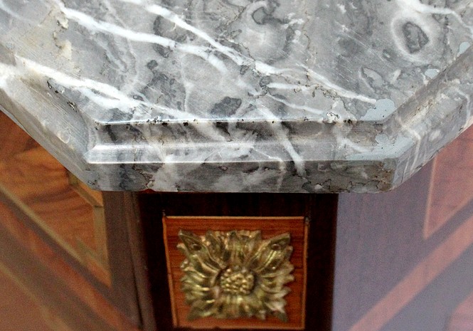 Raffiné, ce meuble en marqueterie est sommé d’un marbre des Pyrénées alliant nuances de gris et de blanc. D’une large épaisseur, ce marbre est muni d’une gorge en son pourtour et de pans coupés à l’avant.