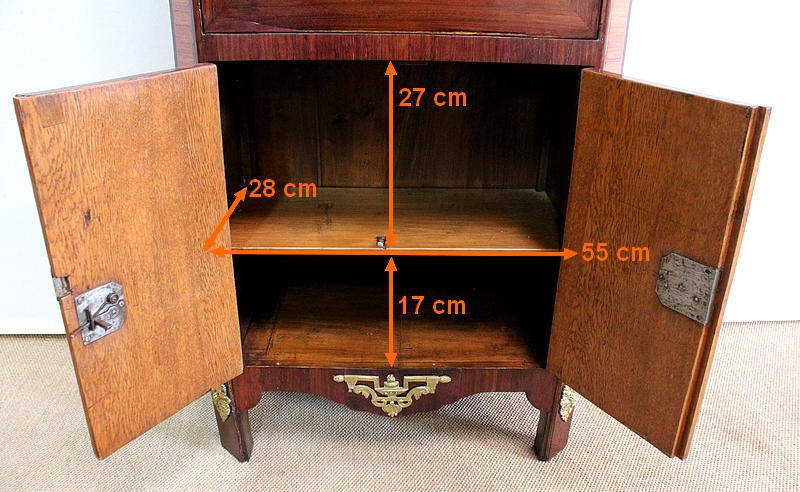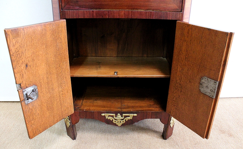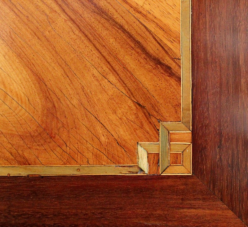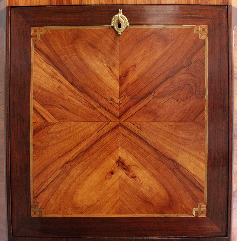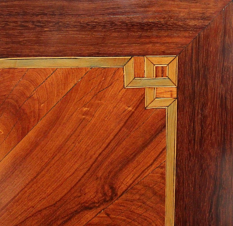 Ce petit mobilier est pourvu d’un grand tiroir en partie haute, d’un abattant et de deux portes basses. Ces ouvrants présentent tous un encadrement en amarante à coupe d’onglet et sont ornés en partie intérieure de bois de rose bénéficiant d’un frisage en ailes de papillon. Des filets de bois clair et teinté, formés d’angles à la grecque, viennent en souligner les contours.