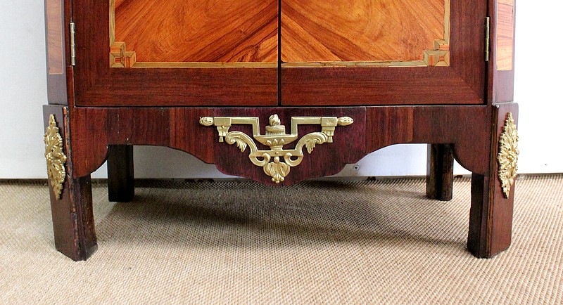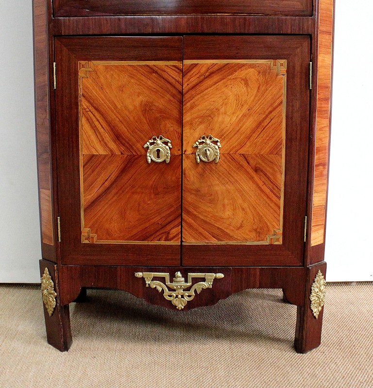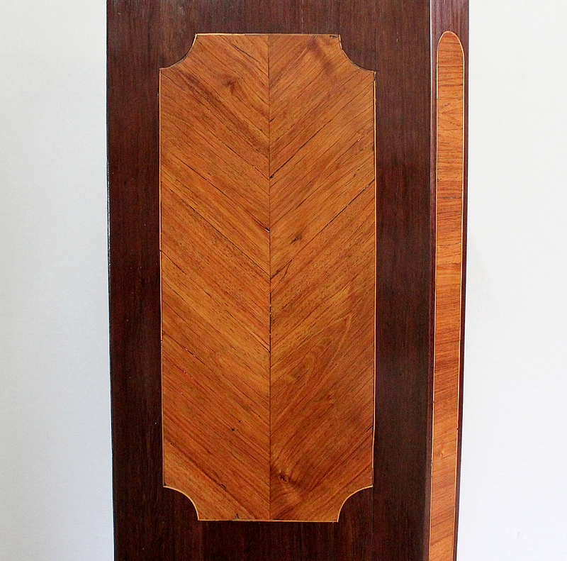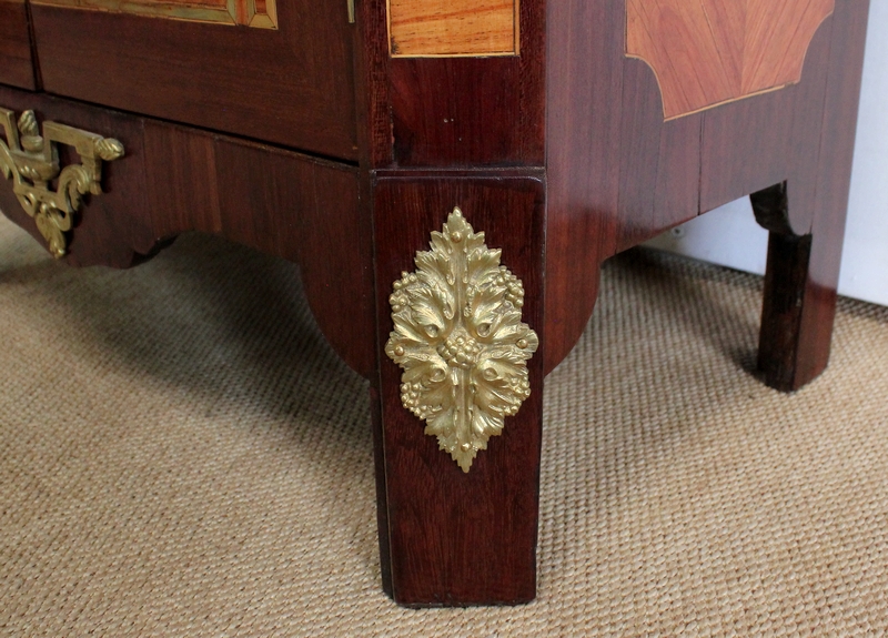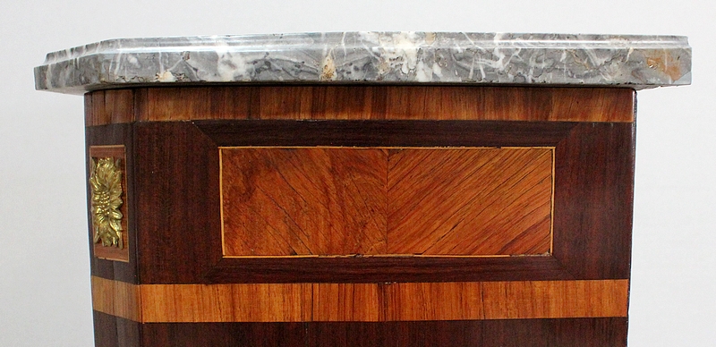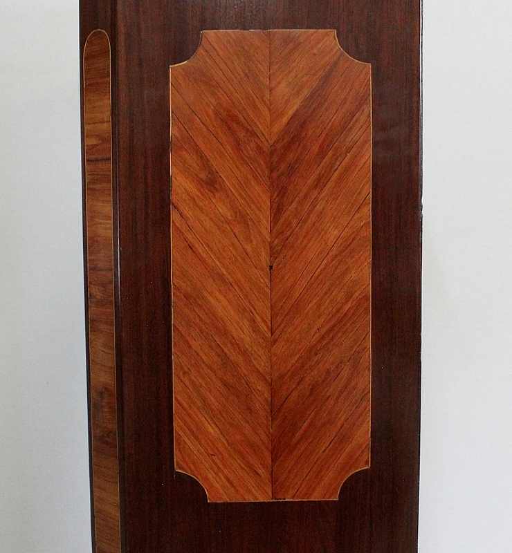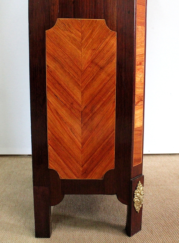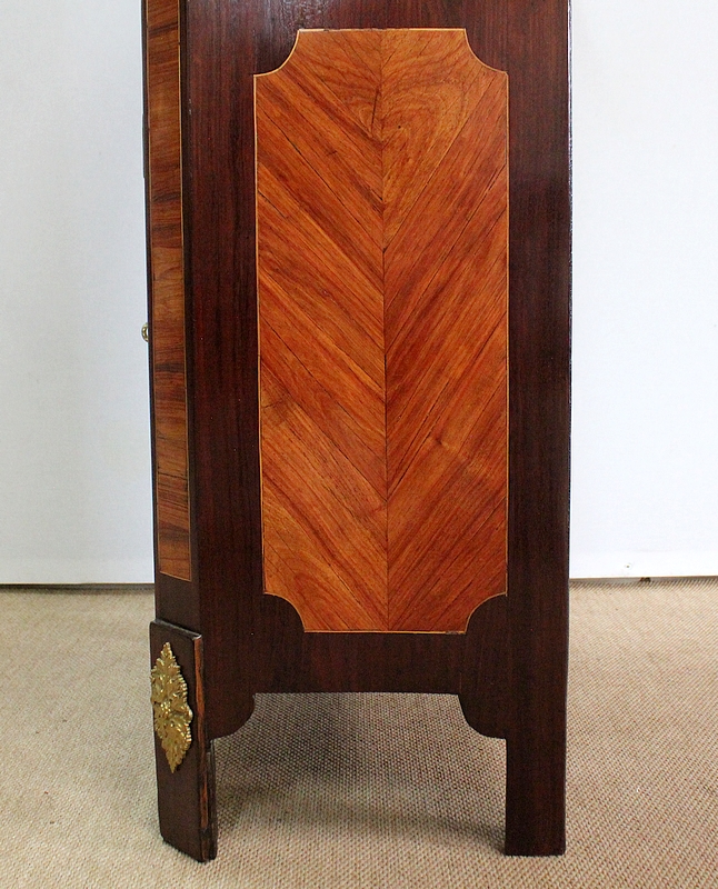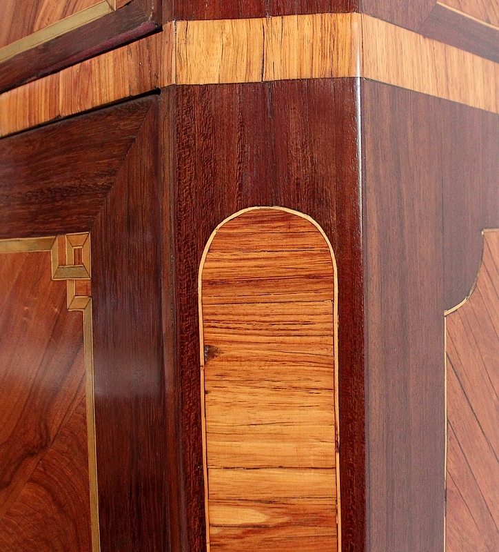 Les côtés à pans coupés et les flans bénéficient également de panneaux de marqueterie en bois précieux. Ils sont agrémentés de médaillons de bronze délicatement ciselé en partie haute et basse.