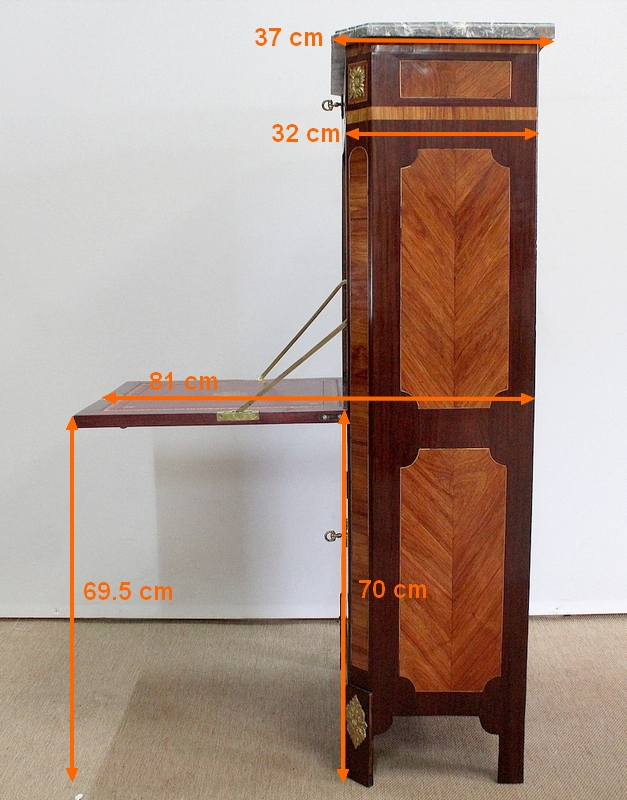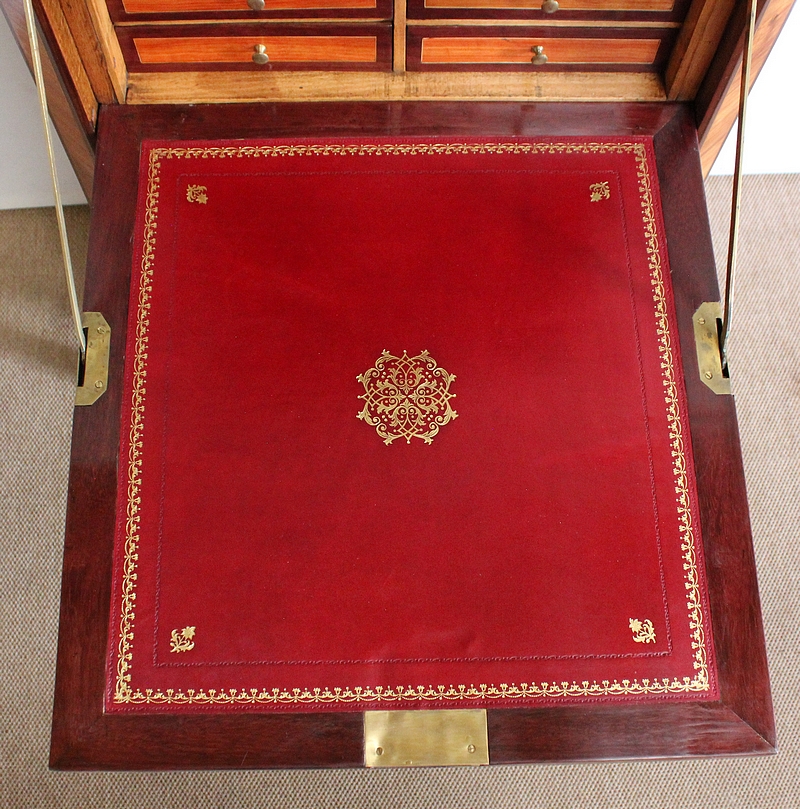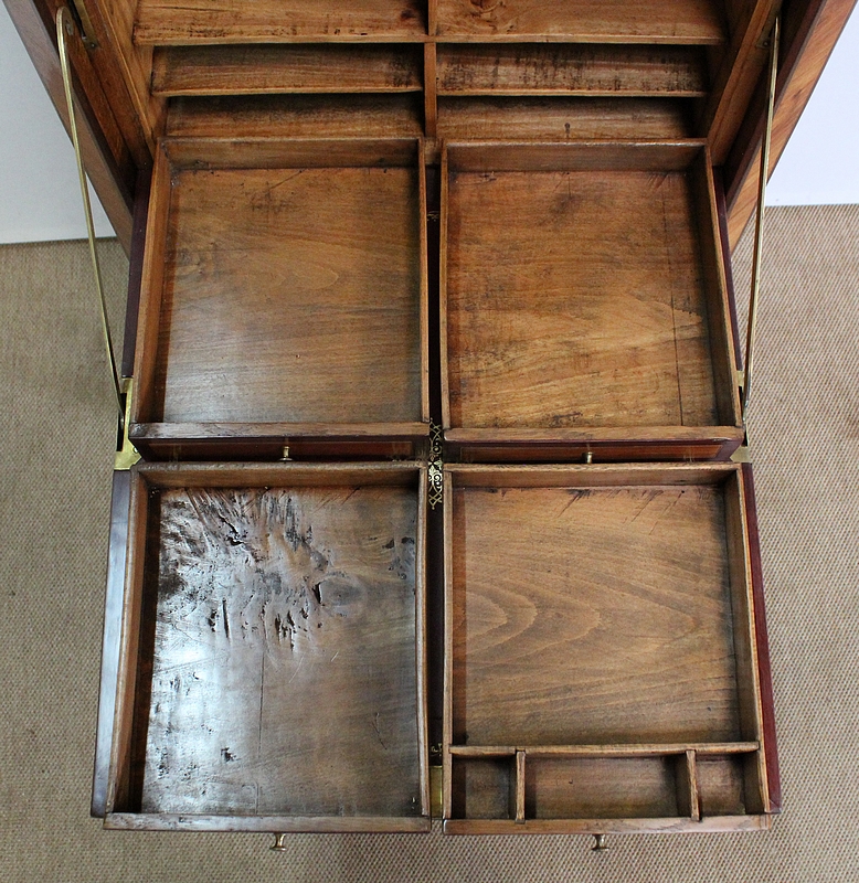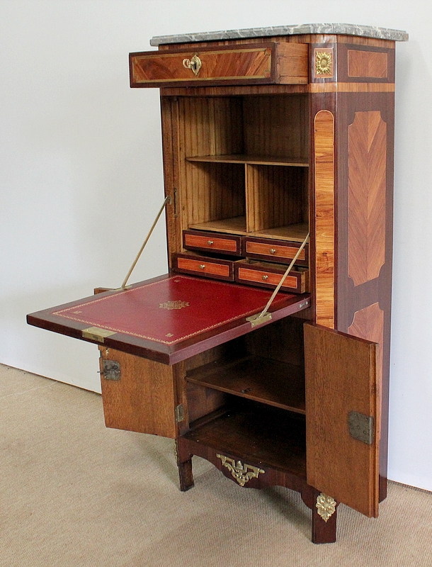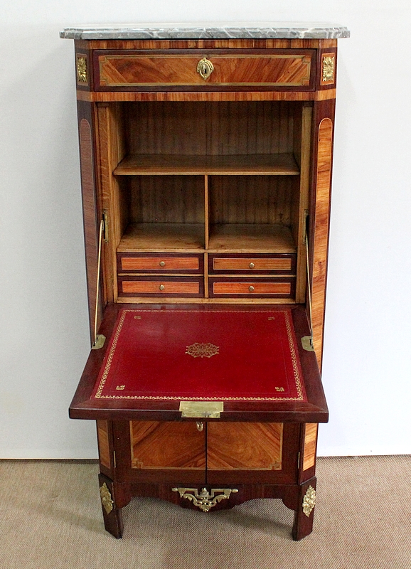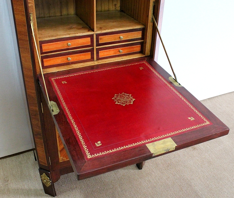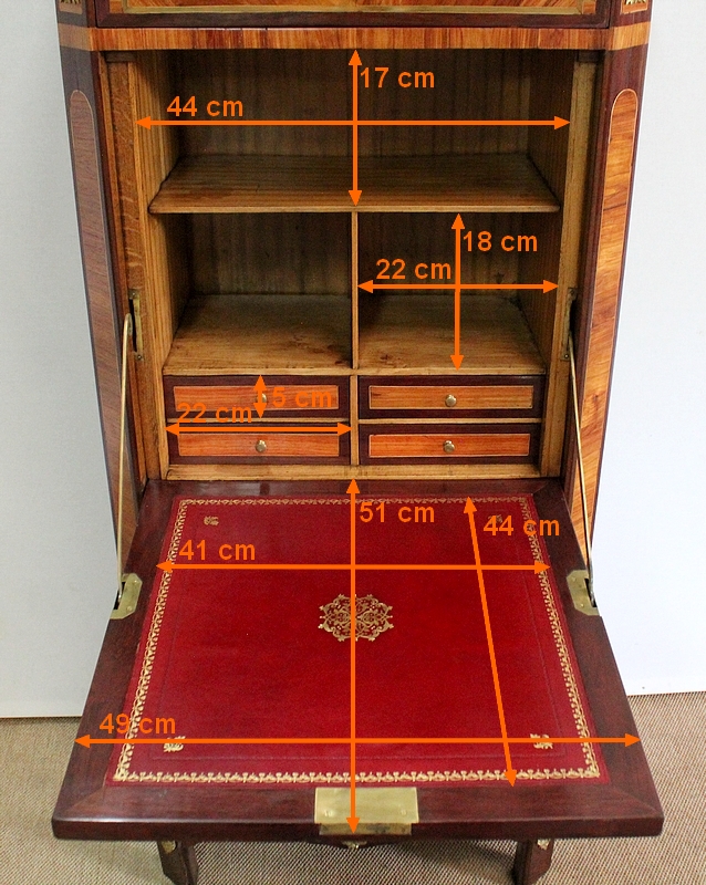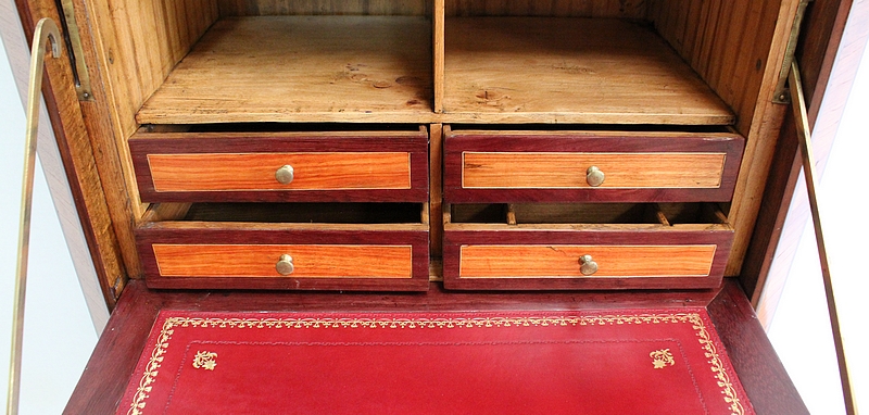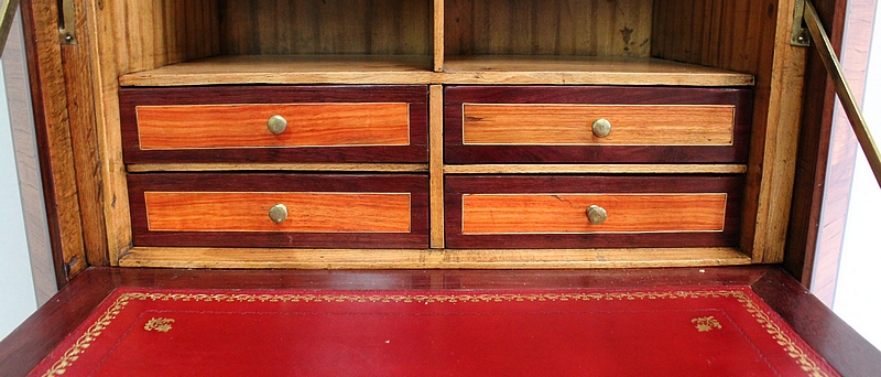 Soutenu par deux compas d’origine, l’abattant de ce secrétaire est garni d’un cuir d’agneau de couleur rouge, avec vignettes dorées aux angles et en partie centrale. L’intérieur est sobre comme à l’époque de Louis XVI. Il présente une étagère, deux casiers et quatre tiroirs en amarante et bois de rose, accompagnés de boutons de tirage en laiton d’origine.
