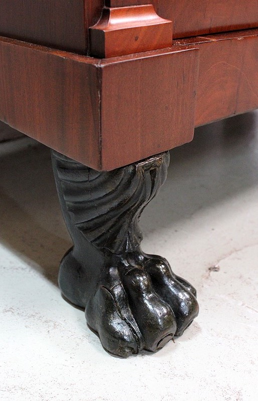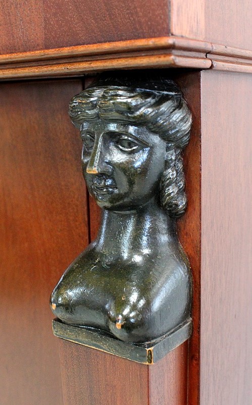 Les montants avant sont en Pilastres gainés. Ils sont sommés de Bustes de femmes et terminés par des pieds Griffes, en bois, à Patine Brune / Verte. Les pieds arrière sont droits.