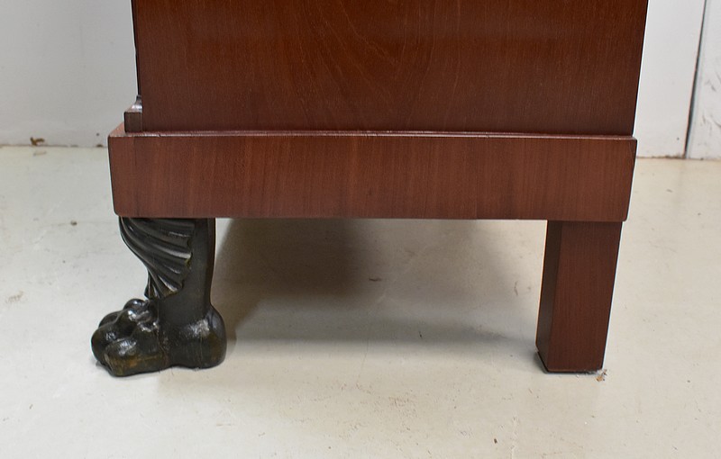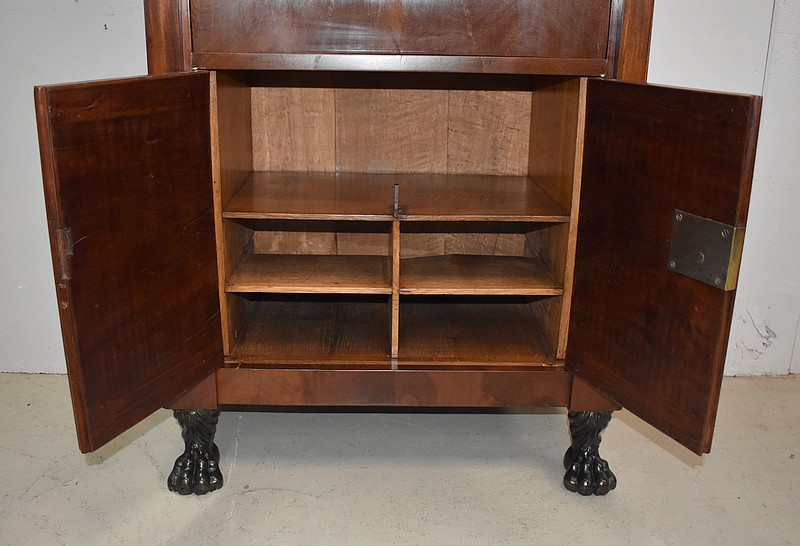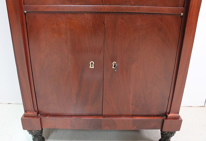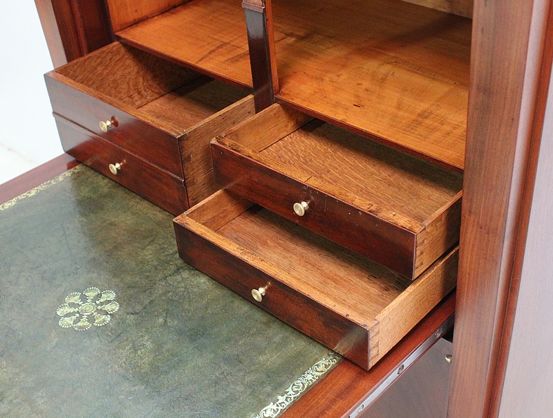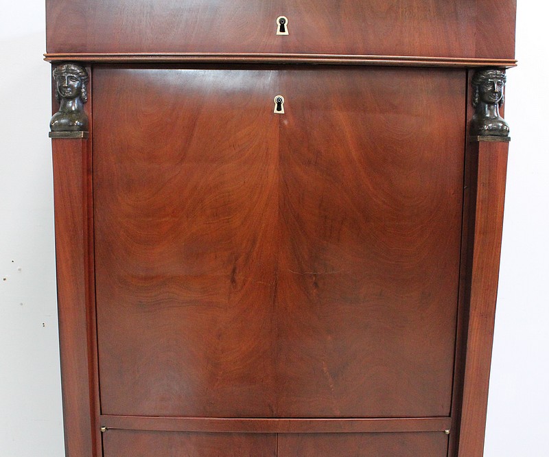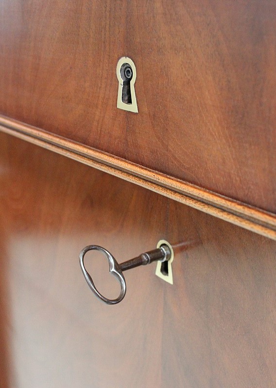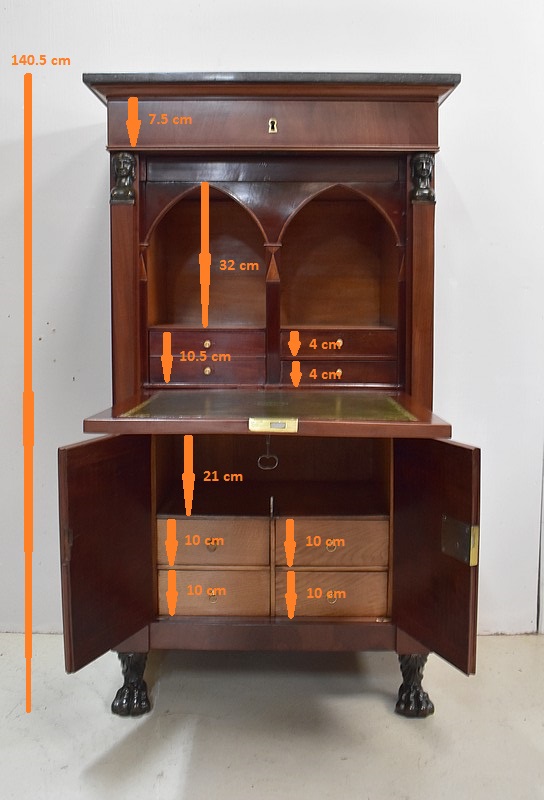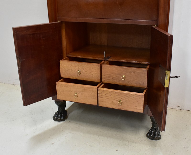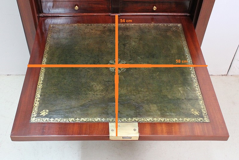 On appréciera les dimensions raisonnables de ce Secrétaire, ainsi que sa grande Sobriété, dû notamment à son Acajou de Fil, bois, par définition, très modestement veiné.
