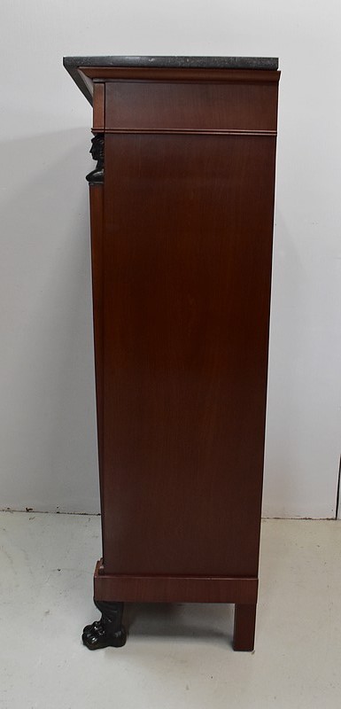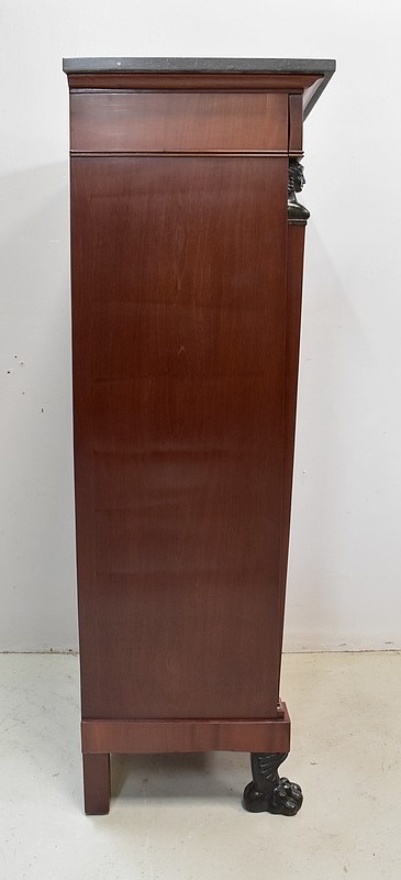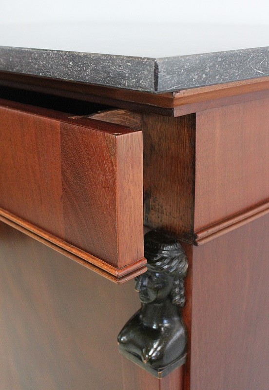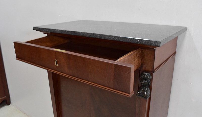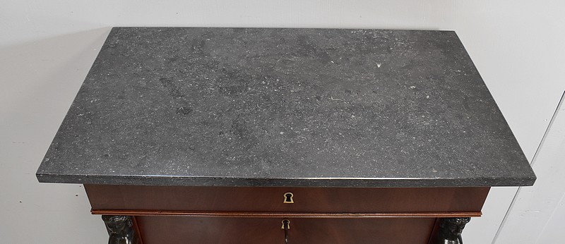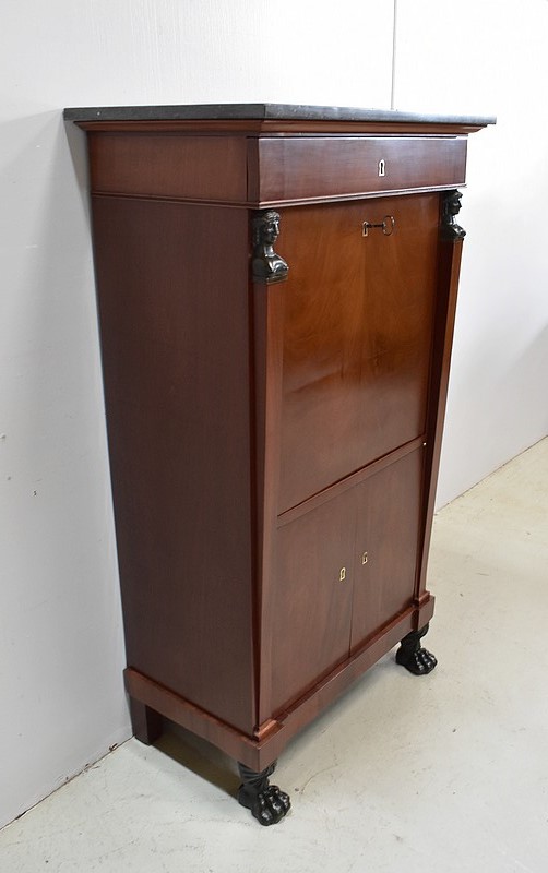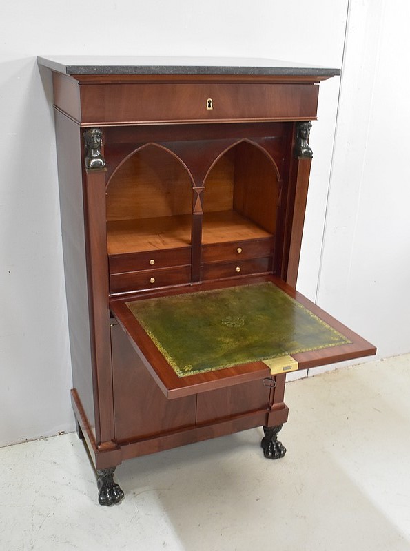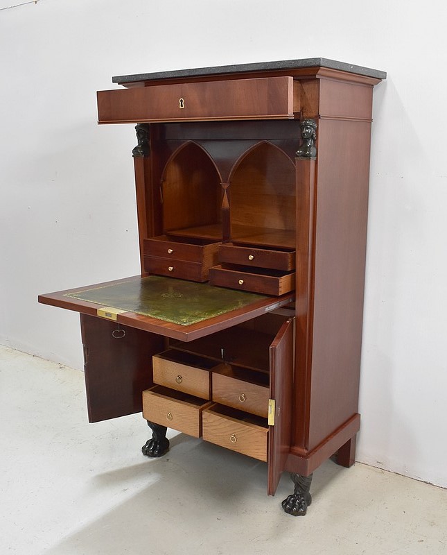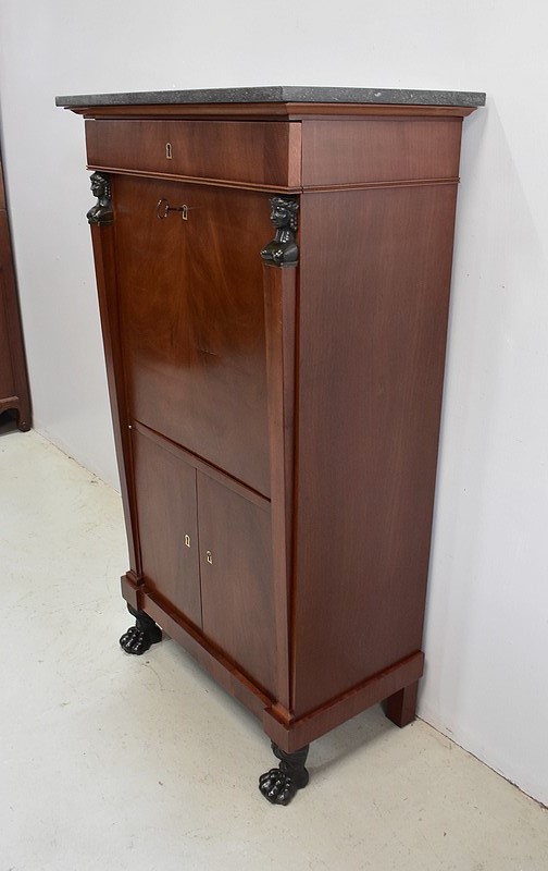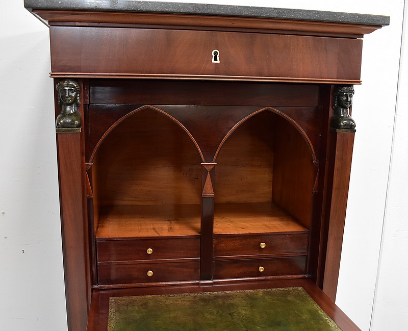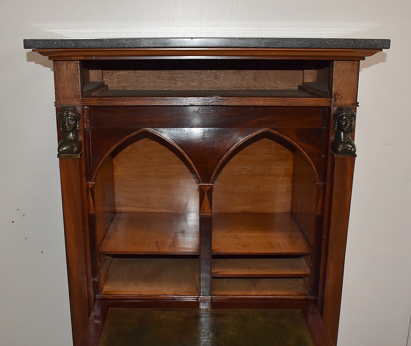 Petit Secrétaire en Placage d’Acajou avec dessus en Marbre Gris foncé.