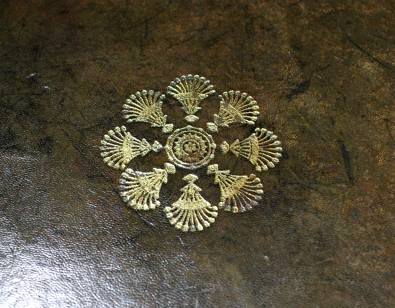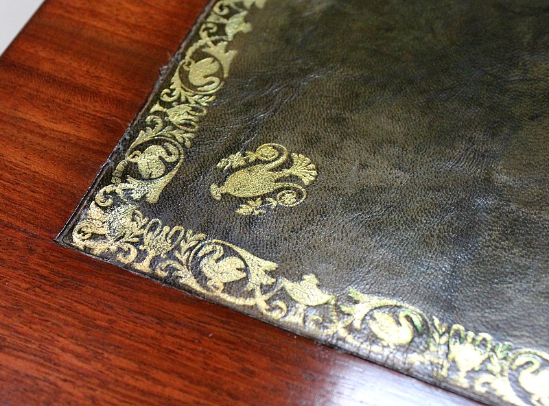 En dessous, un abattant découvre un Tabernacle avec aménagement en Chêne. Ce dernier se compose d’une niche enjolivée sur le devant par un panneau découpé en deux Ogives et soutenu au milieu par un pilier factice. Cet espace propose également trois tiroirs, dont les façades garnies de petits boutons de tirage en laiton ciselé donnent l’illusion qu’ils sont au nombre de quatre. La zone de travail est recouverte d’un cuir aux nuances de Vert, agrémenté d’une Vignette centrale, de Fleurons d’angles et d’une frise Dorée en bordure.