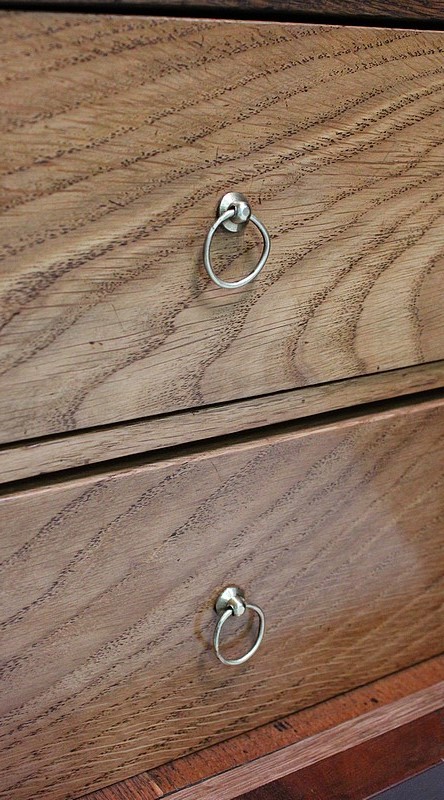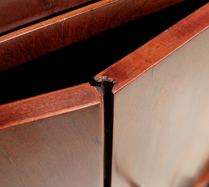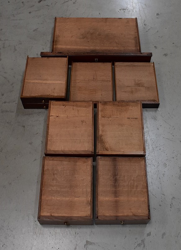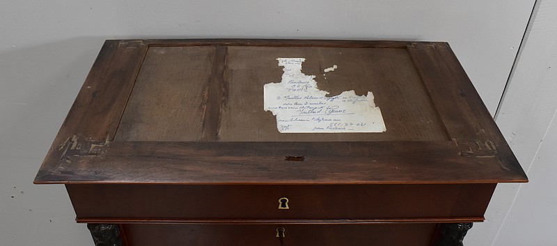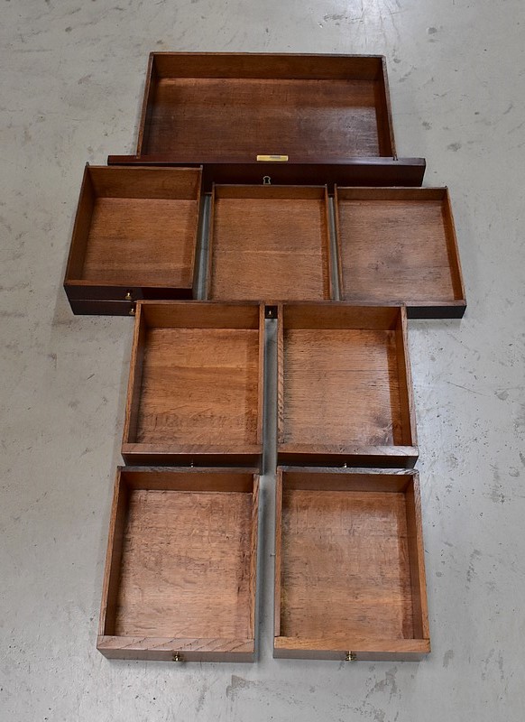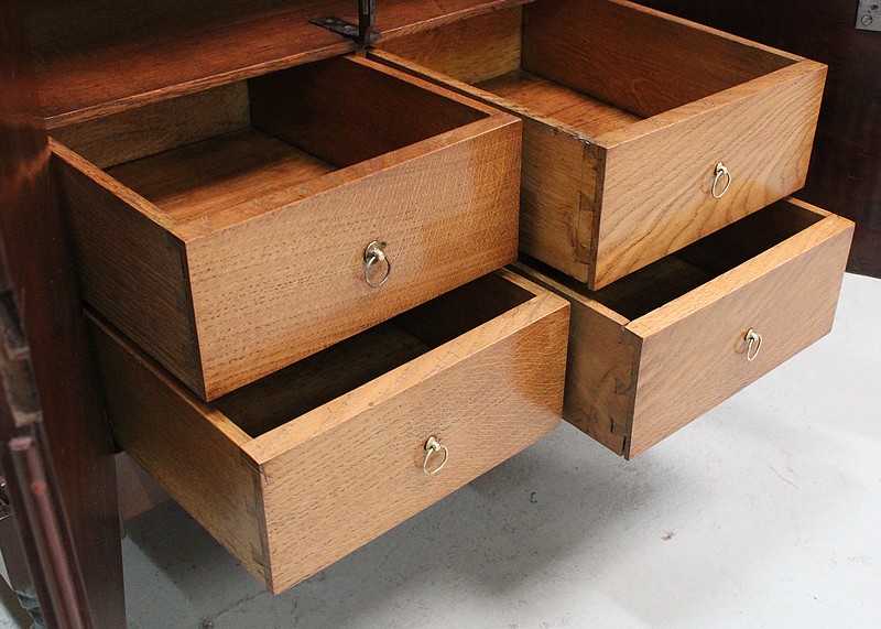 En partie basse, ce Secrétaire est pourvu de deux portes, à fermeture en Noix, évitant ainsi toutes déformations. Elles abritent quatre autres tiroirs, disposés sur deux rangs, composés de Chêne Clair et assemblés en Queues d’Arondes.