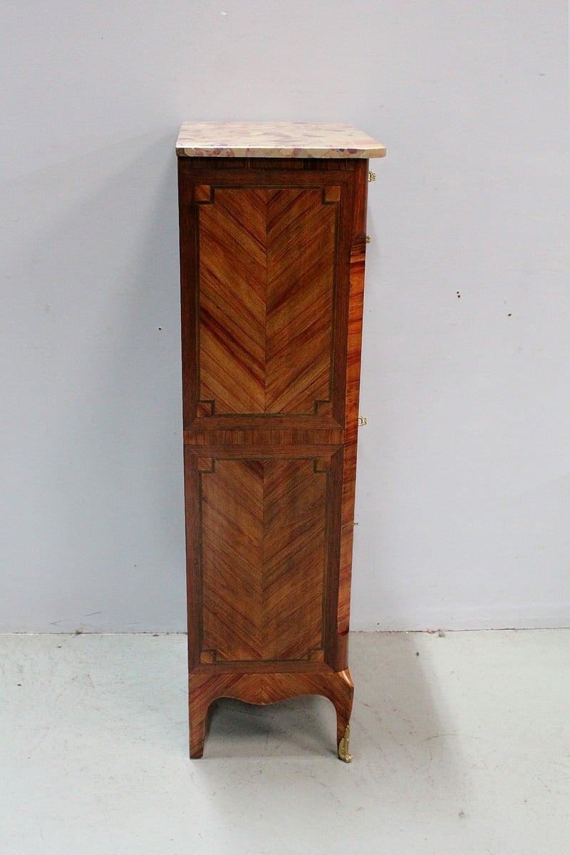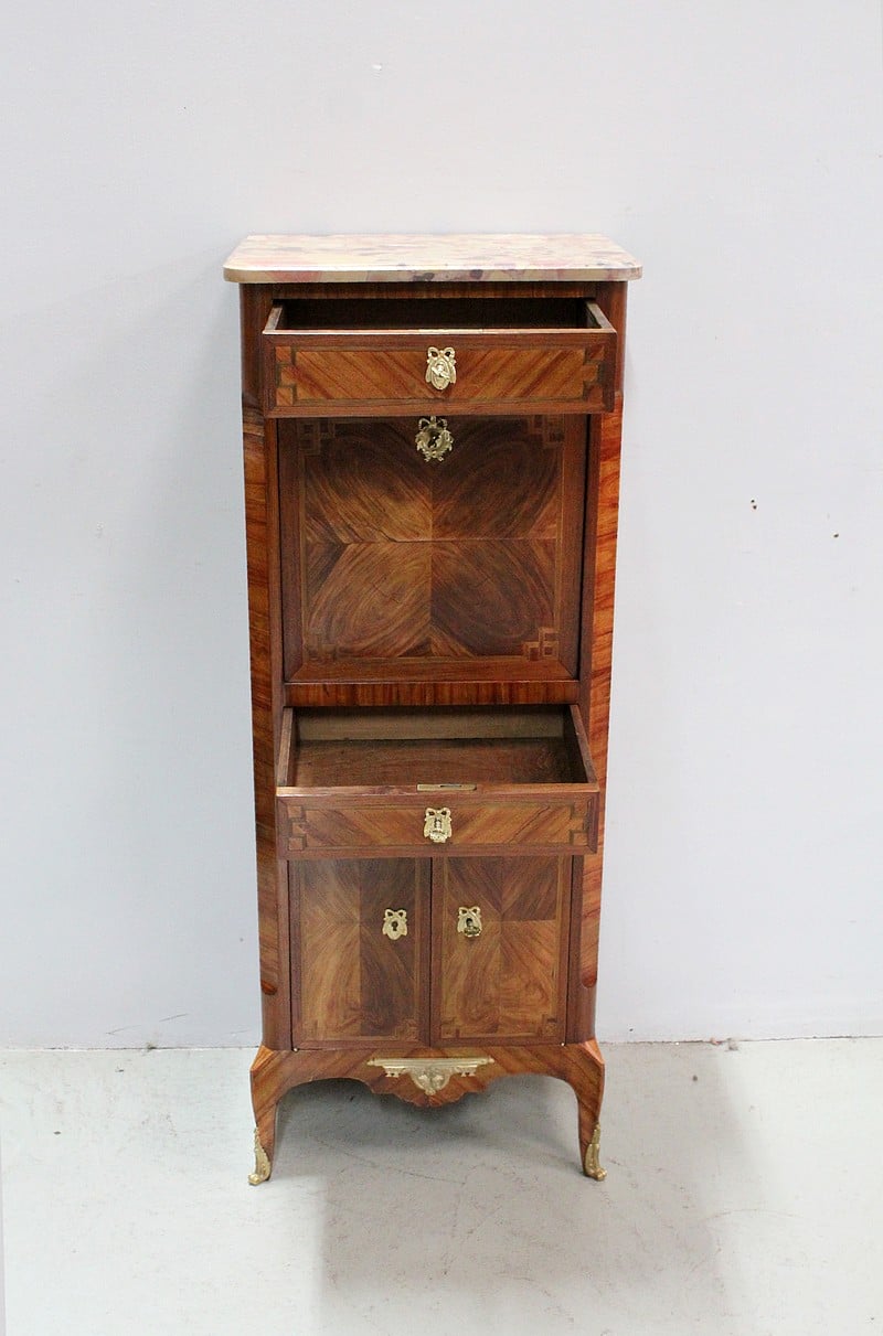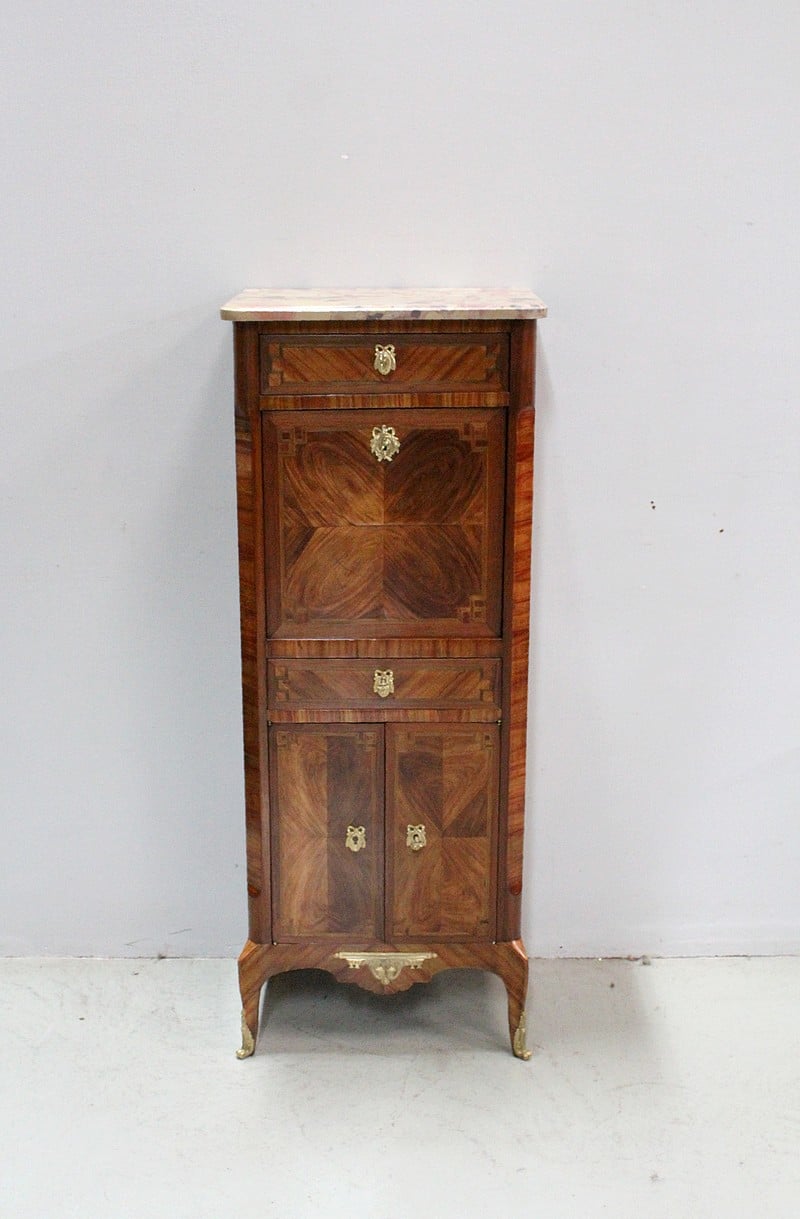 Petit secrétaire Transition Louis XV – Louis XVI en marquèterie de Bois de Rose et d’Amarante.