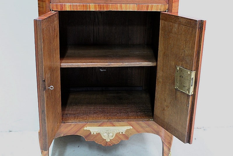 Enfin, en partie basse, il ouvre par deux petites portes marquetées en ailes de papillon fermant à clef et par un crochet intérieur, donnant sur un intérieur composé d’une étagère posée sur tasseaux fixes.