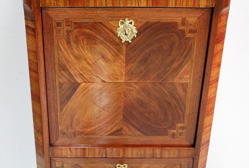 Également, il ouvre par un abattant marqueté en ailes de papillon en partie haute, lequel donnant sur un tabernacle composé d’une grande niche et de deux petits tiroirs à boutons. L’intérieur de l’abattant est quant à lui, recouvert d’un cuir vert refait orné d’un motif central et d’une frise dorés.