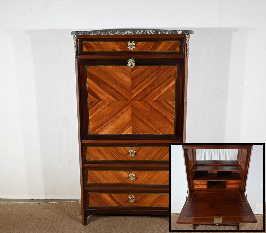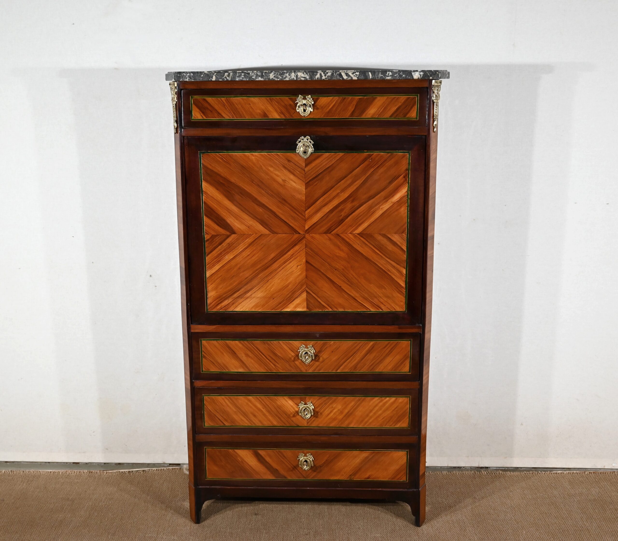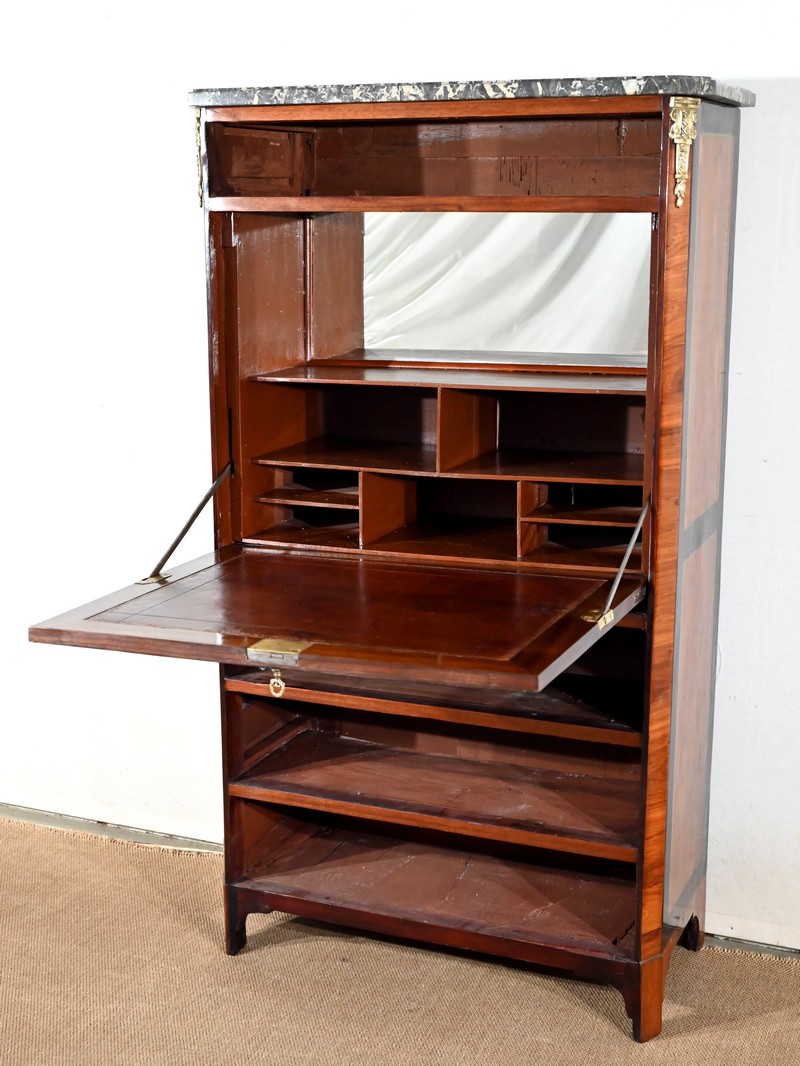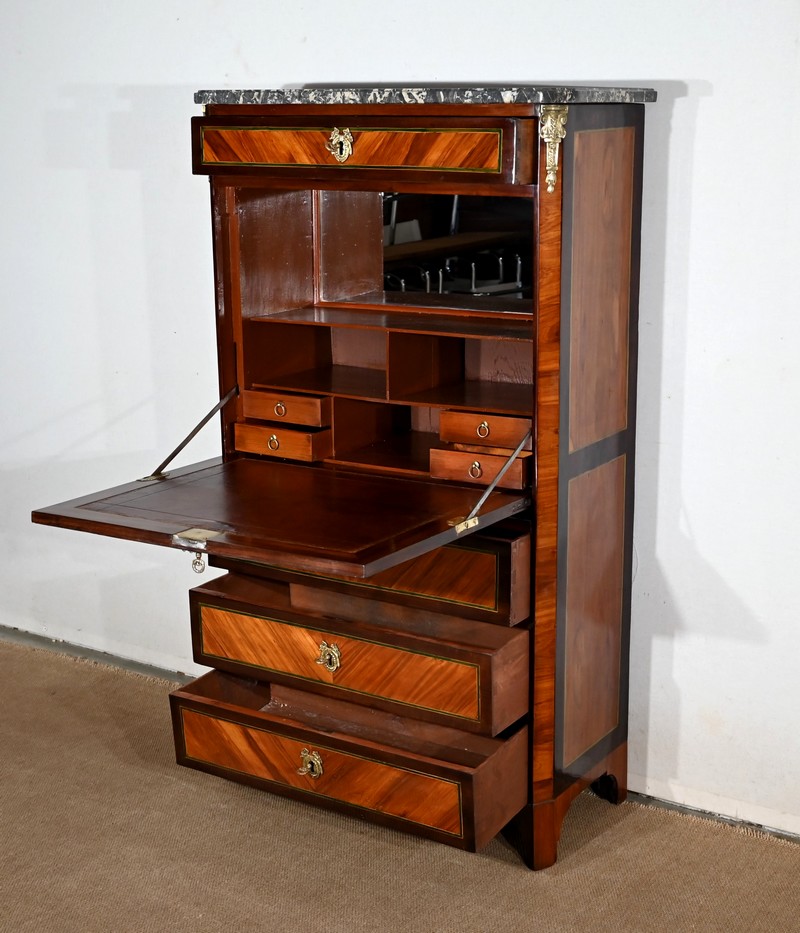 Secrétaire en placage de bois de rose surmonté d’un marbre « Sainte Anne des Pyrénées », à gorge, et d’époque.