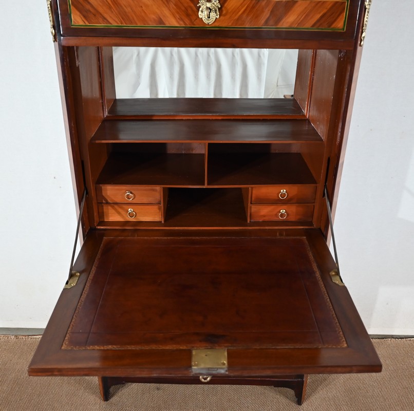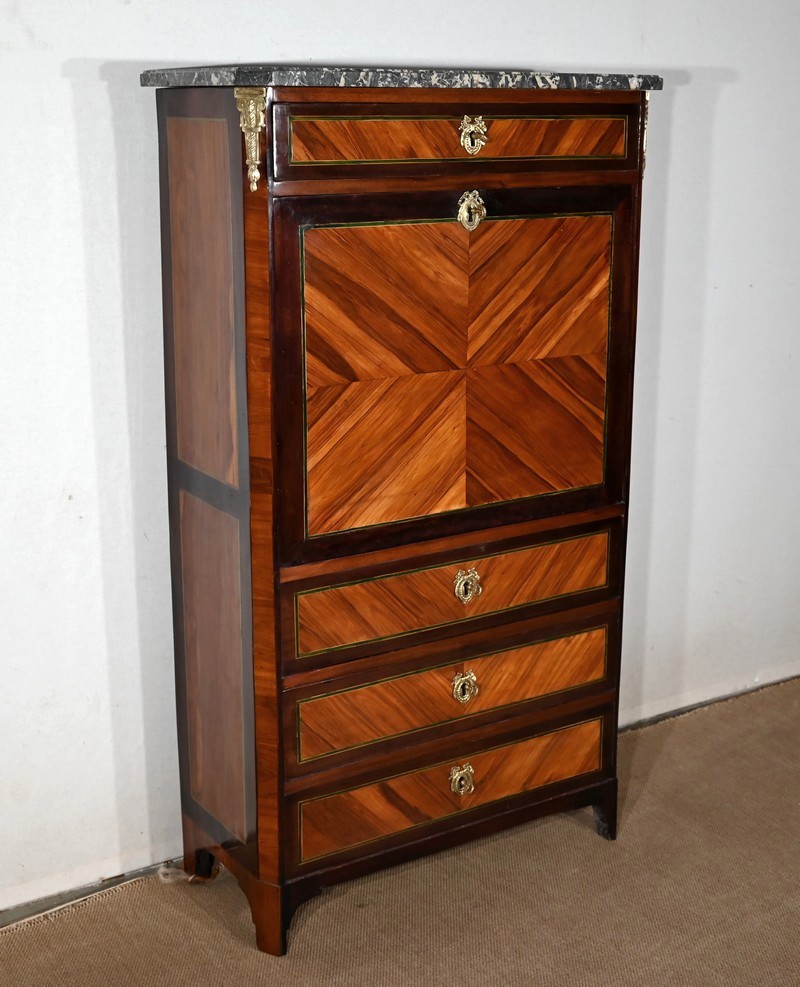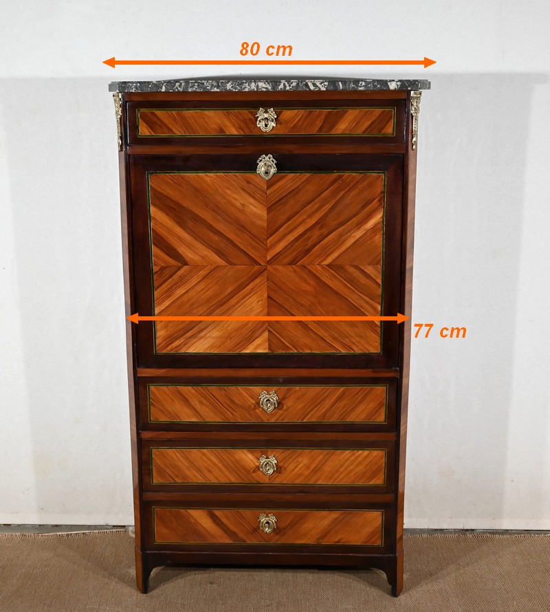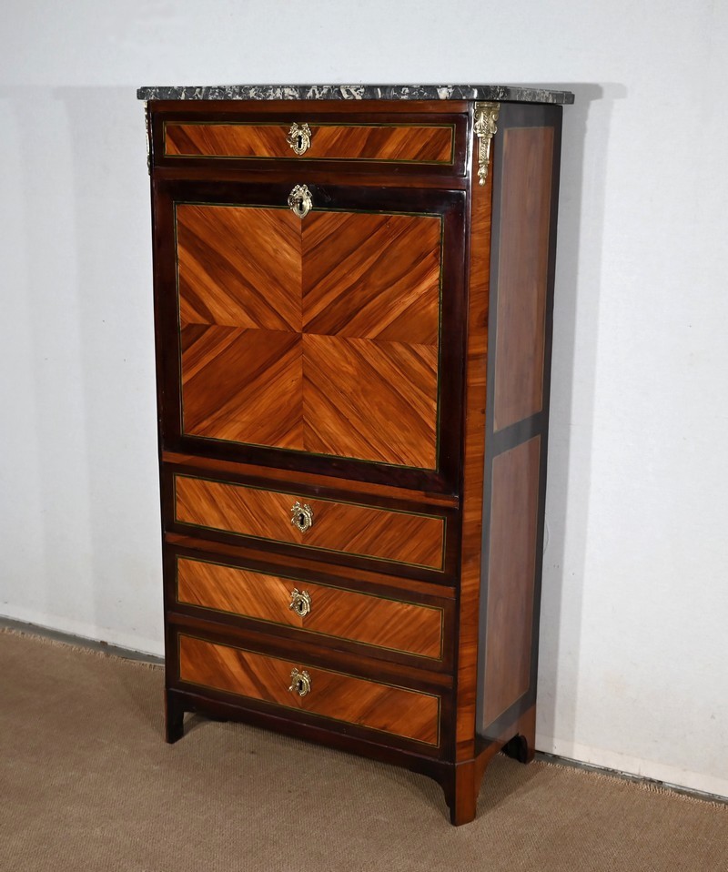 Secrétaire en placage de bois de rose surmonté d’un marbre « Sainte Anne des Pyrénées », à gorge, et d’époque.