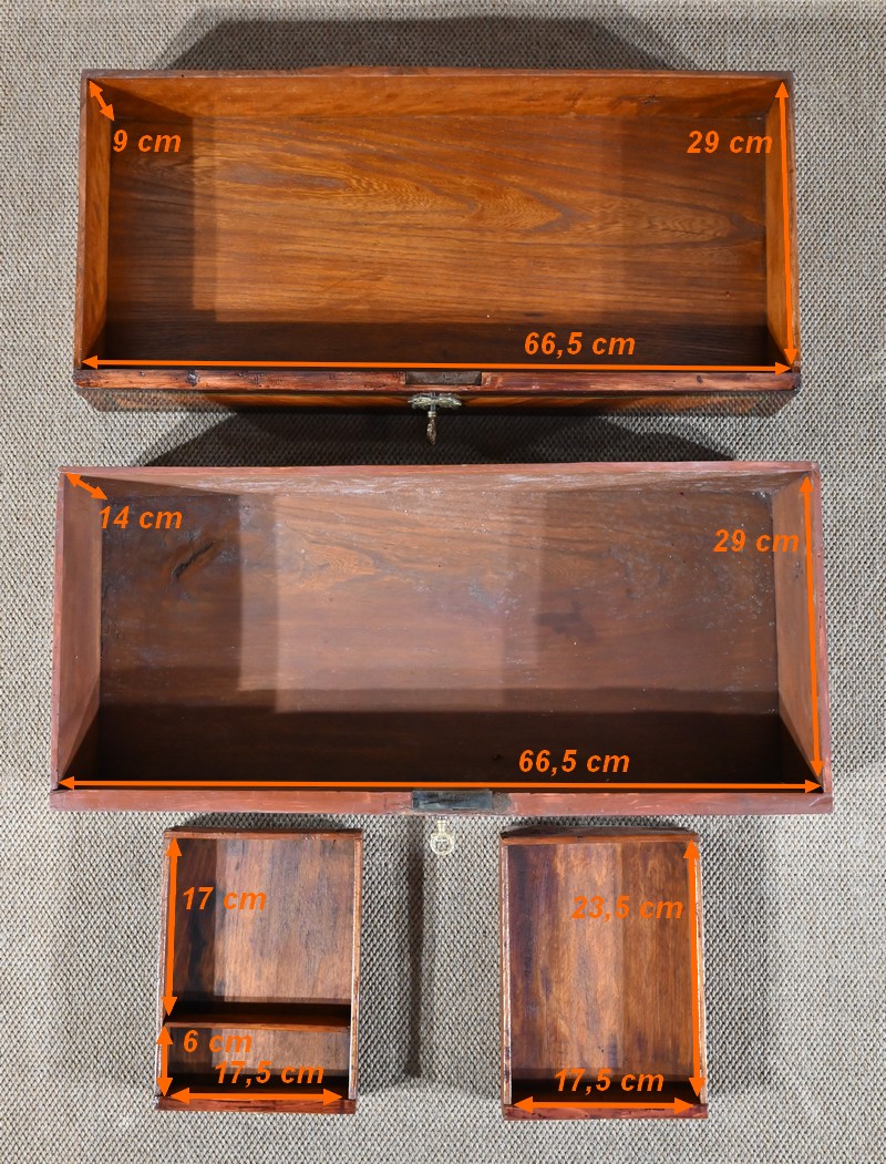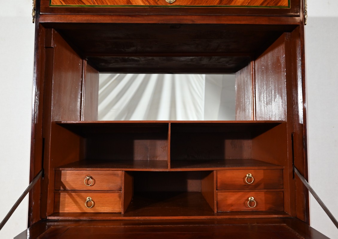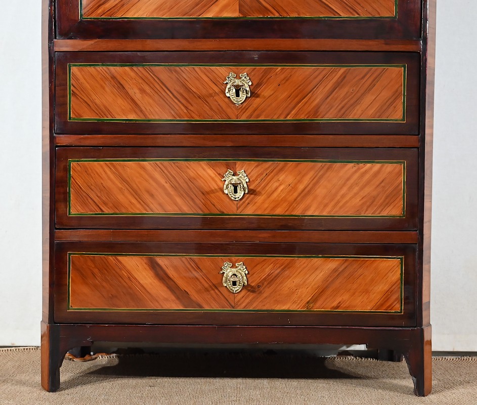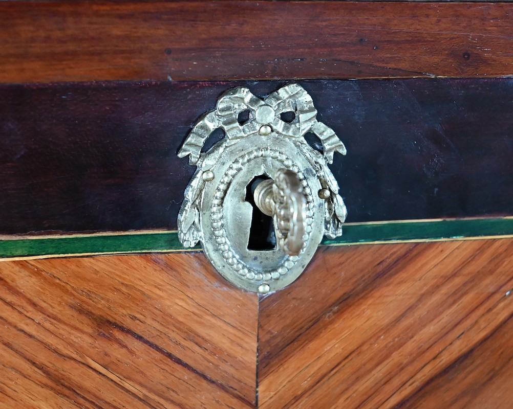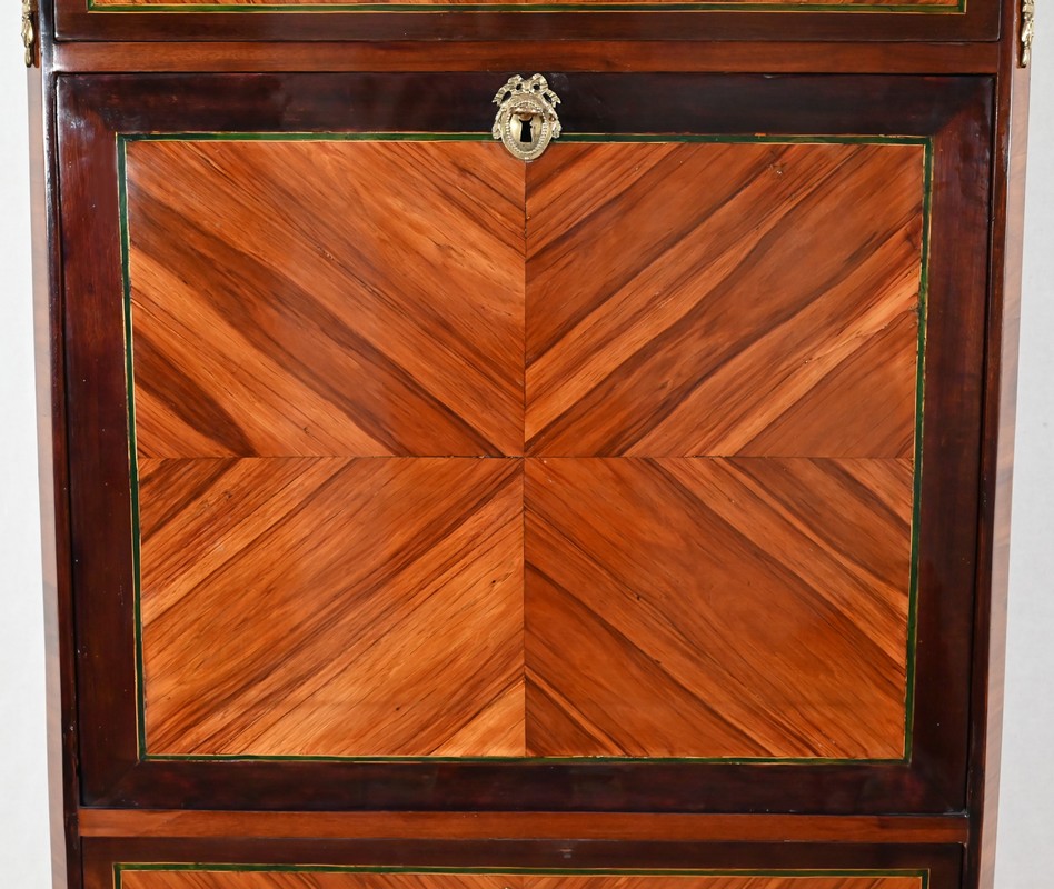 Ce meuble unique ouvre par un abattant, un tiroir en partie haute et trois identiques en partie basse. Chacun est muni d’une serrure fonctionnelle d’origine, d’une entrée en bronze ciselé et d’une clé postérieure. Les façades, en placage de bois de rose disposé en éventail, sont agrémentées de filets de bois teinté vert, de buis et d’entourages en acajou.