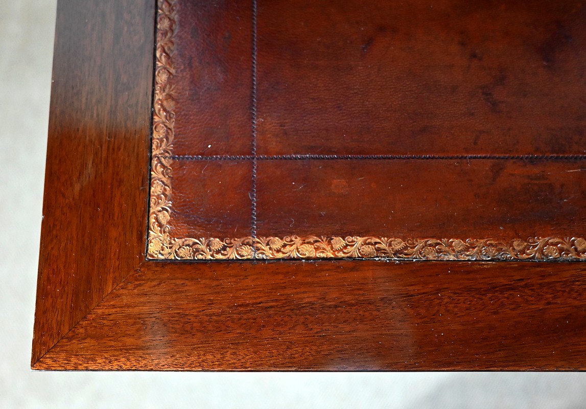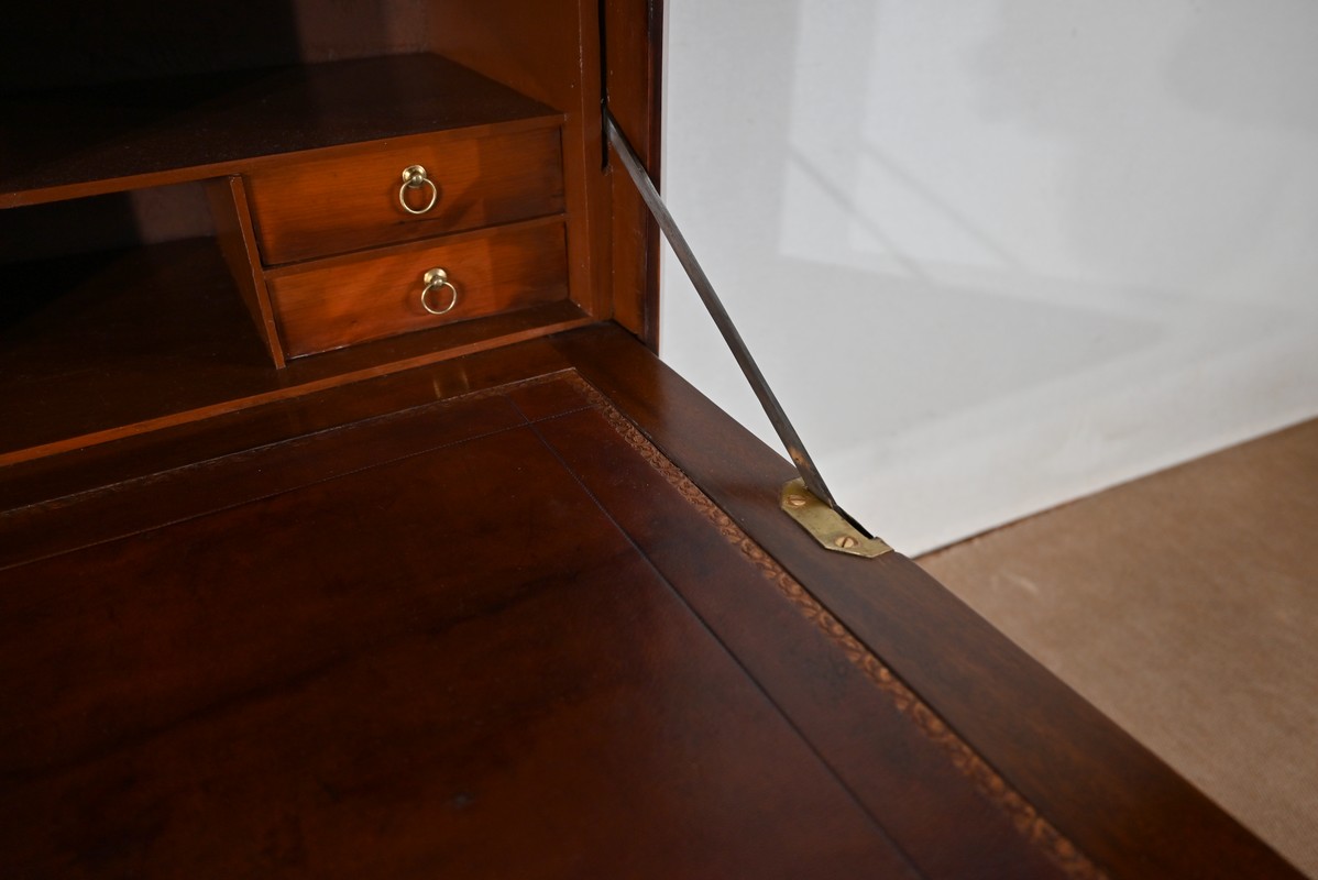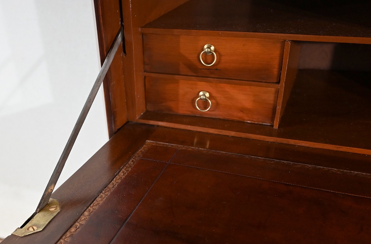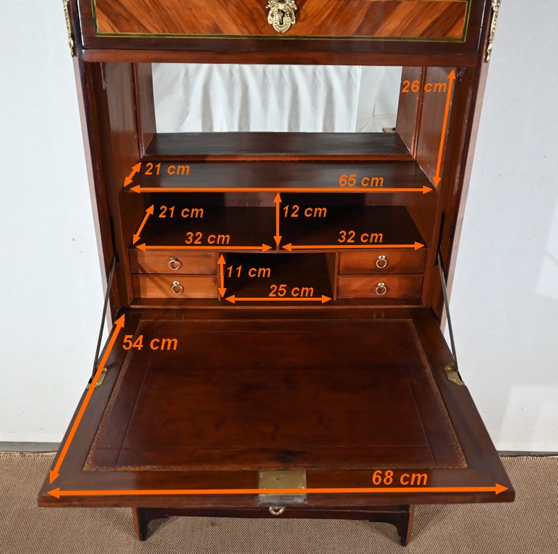L’abattant ouvre sur un espace de rangement composé de quatre petits tiroirs et d’une niche, sommés de deux casiers et garni d’un miroir. La partie écritoire offre un cuir rouge, avec vignette dorée et liseré à froid. Cet abattant est maintenu par des crochets fer et des platines laiton.