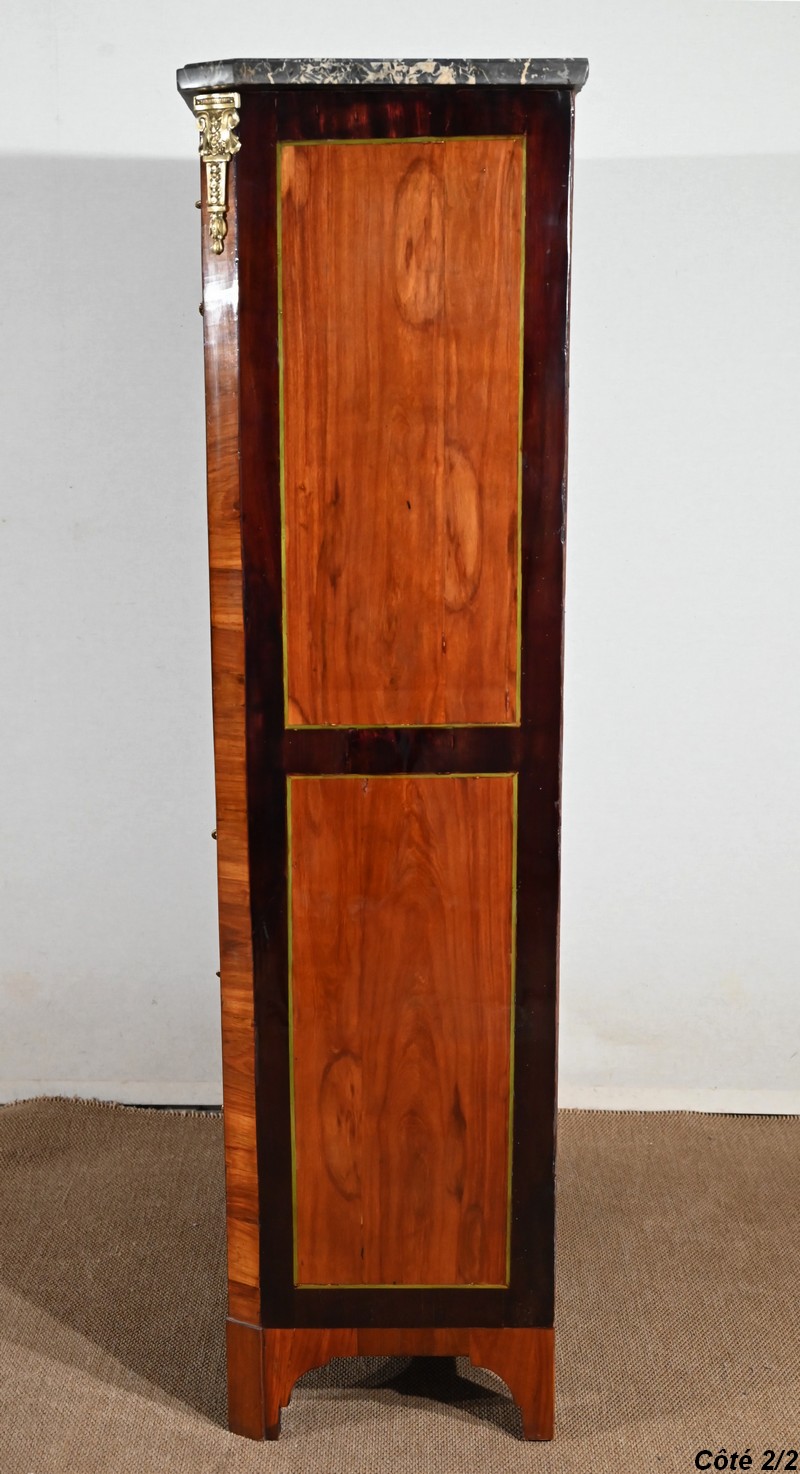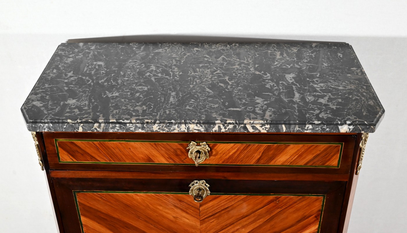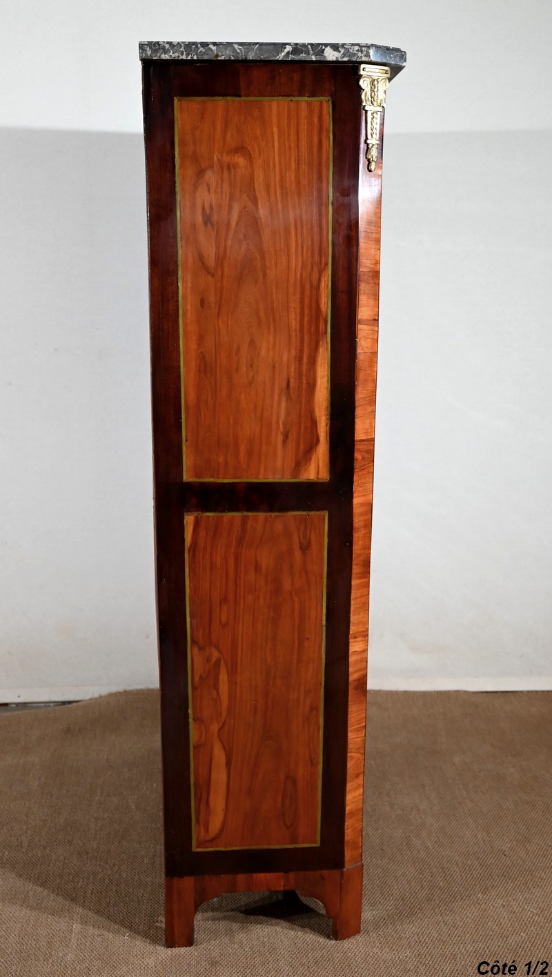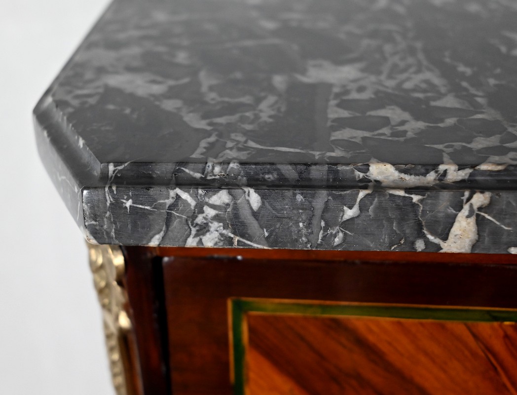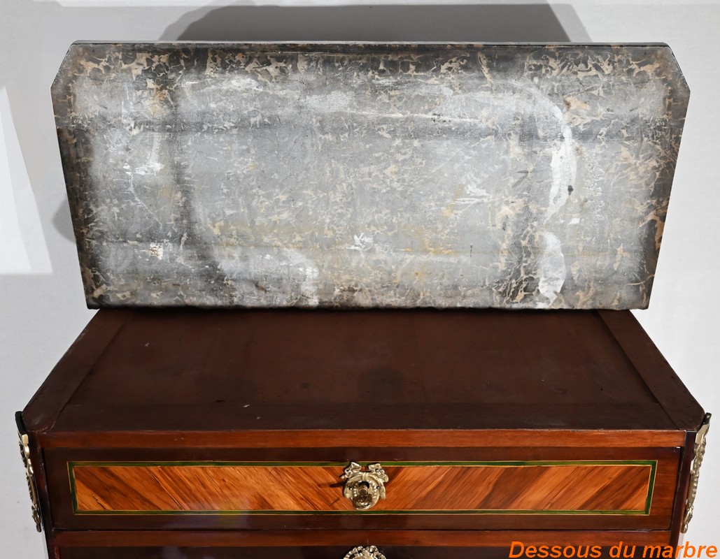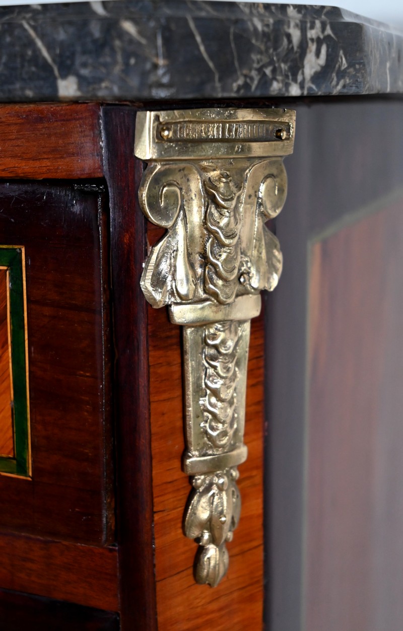 Les montants et pieds à pans coupés sont plaqués à l’horizontale et ornés de chutes de bronze.