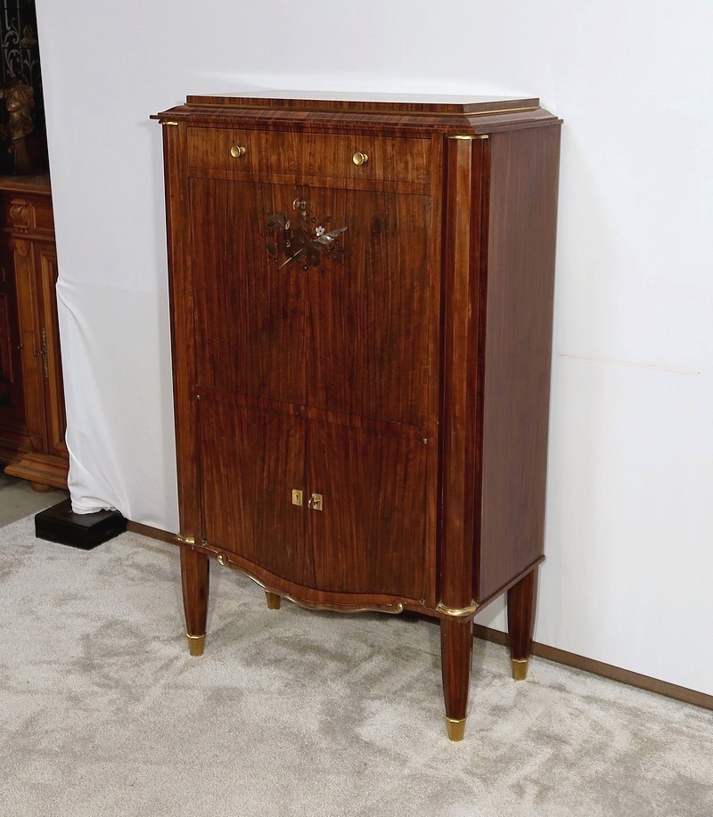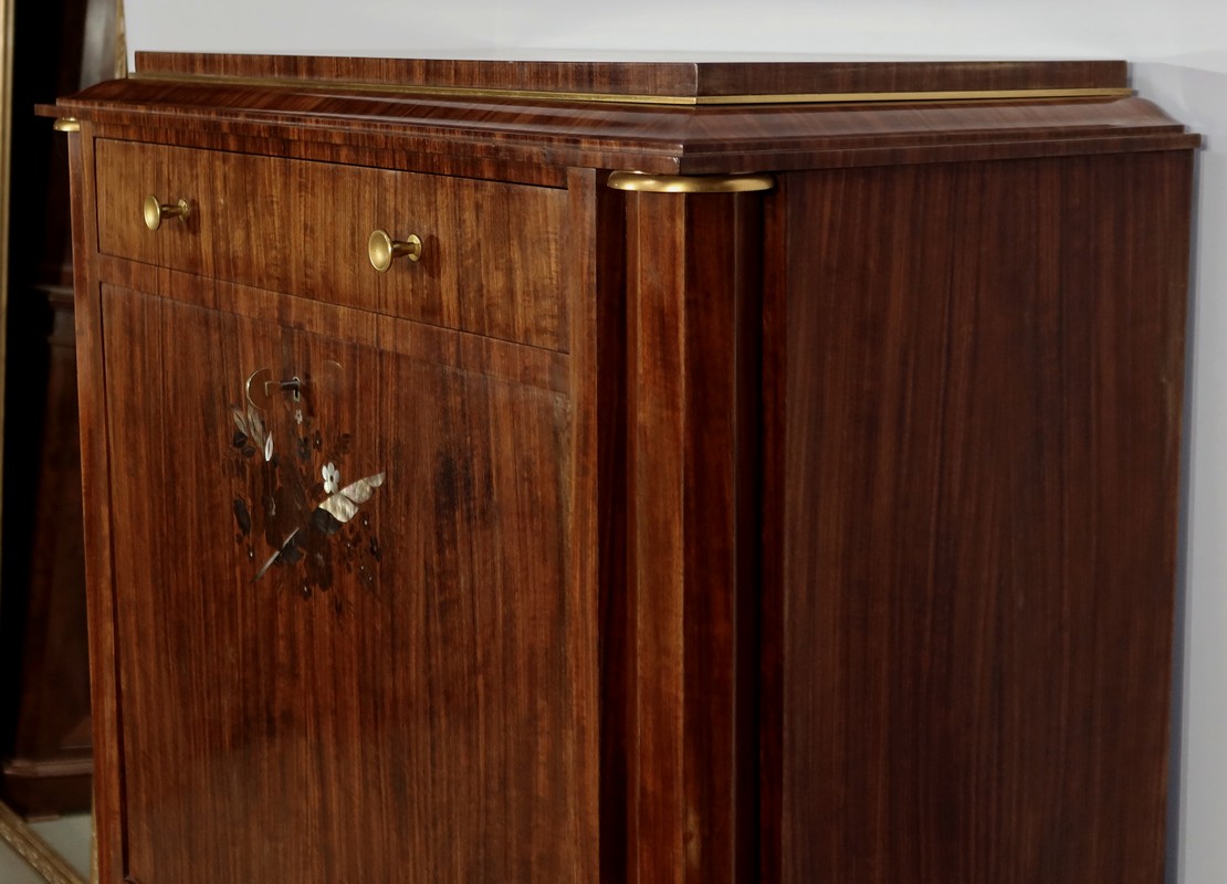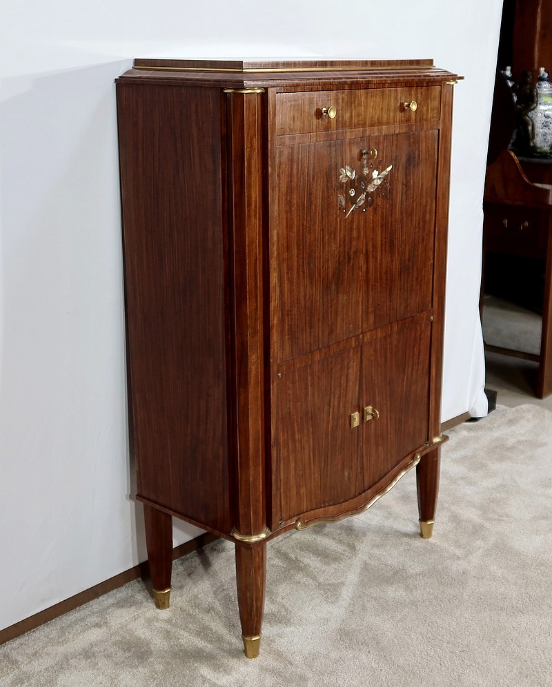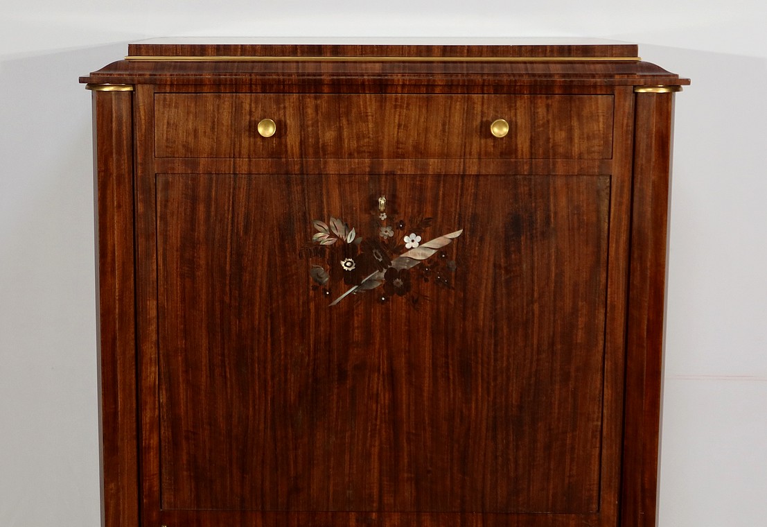 Un abattant orné d’incrustations de nacre et de bois précieux représentant une scène végétale s’ouvre à l’aide d’une clé et d’une serrure d’origine en état de fonctionnement. A l’ouverture nous découvrons un intérieur en sycomore à l’exception des devants d’étagères et des séparations. Cet espace de rangement est muni d’un petit tiroir de chaque côté, accompagné de niches.