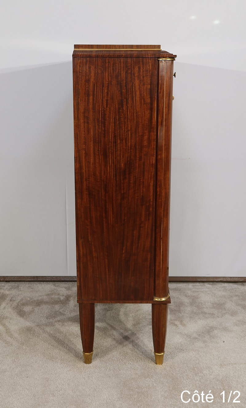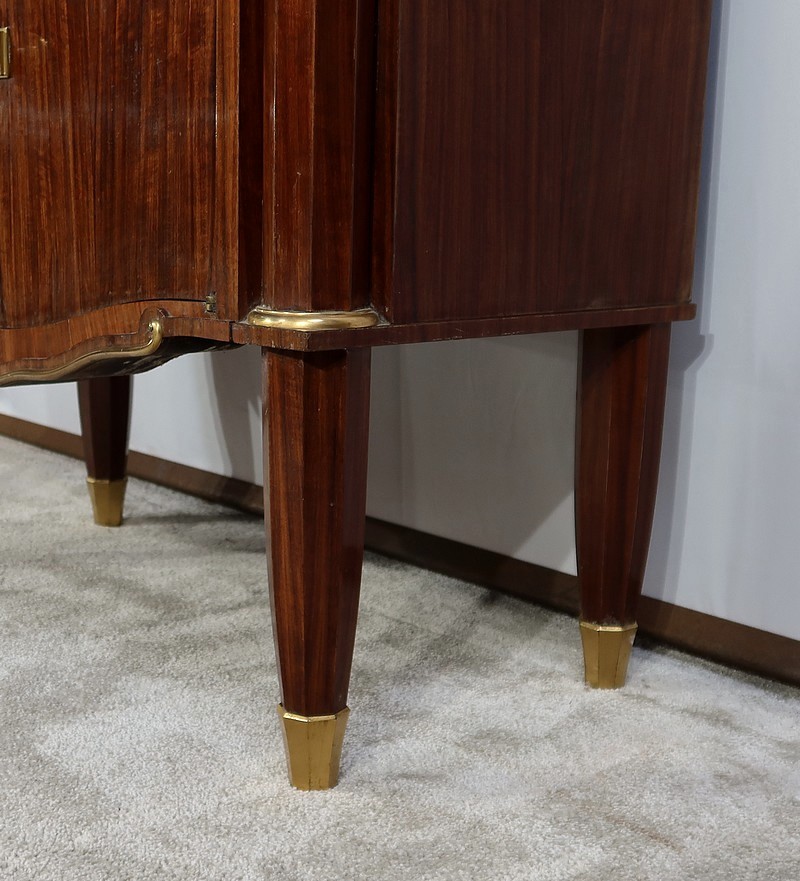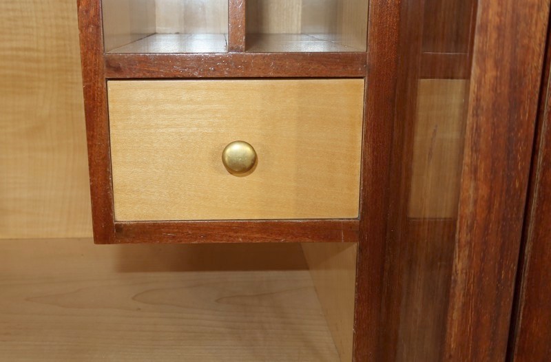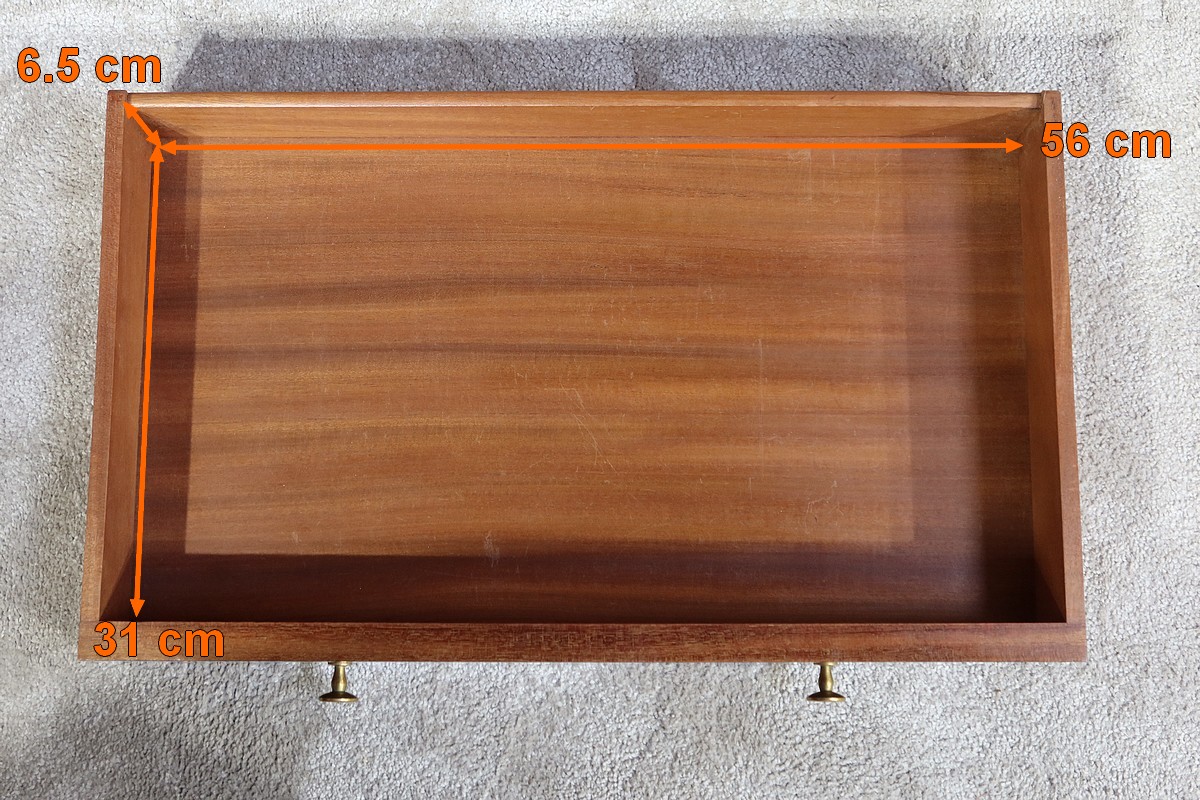 Ce mobilier de qualité aux lignes raffinées en placage d’acajou présente en partie haute un tiroir s’ouvrant avec deux boutons en laiton légèrement de forme cuvette.