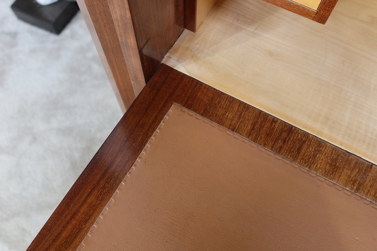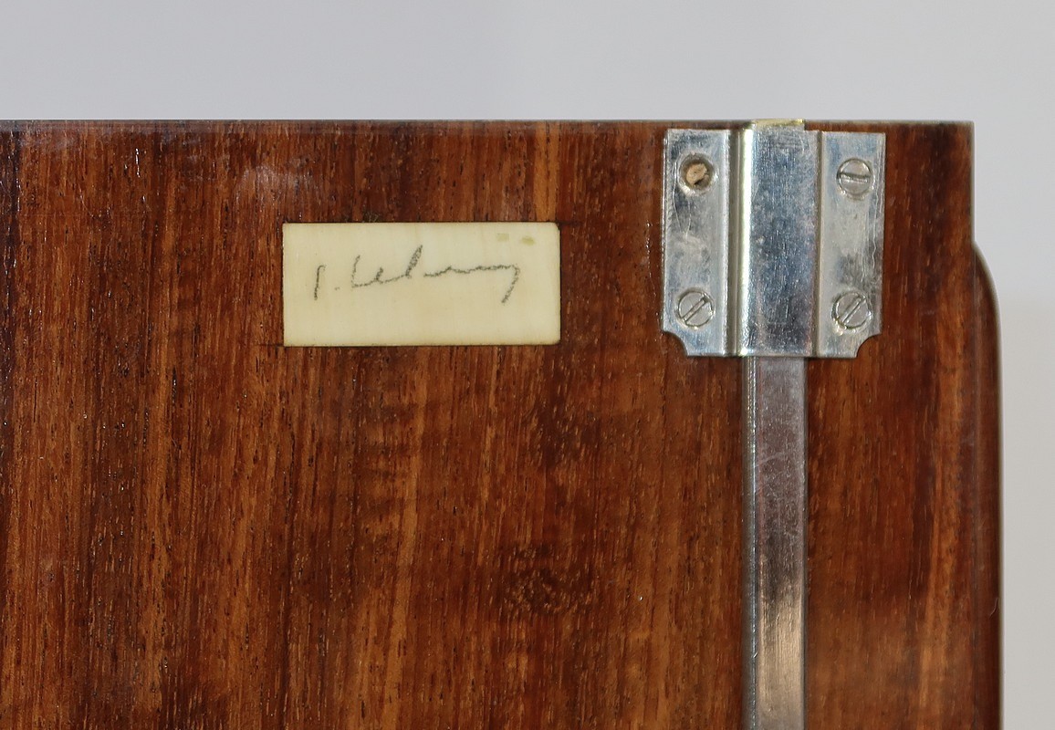 Incrustée sur l’intérieur de la porte droite, nous retrouvons la signature de Jules Leleu sur une plaque d’ivoire.