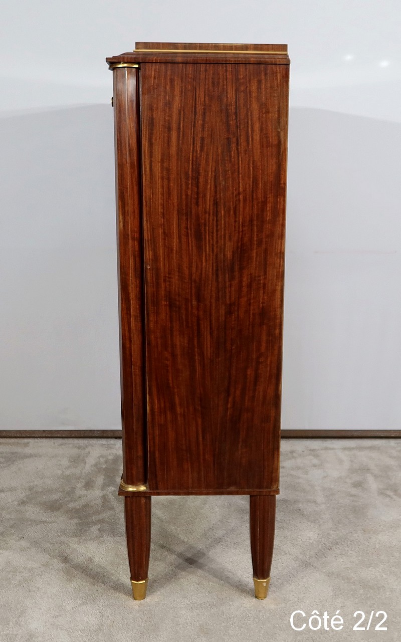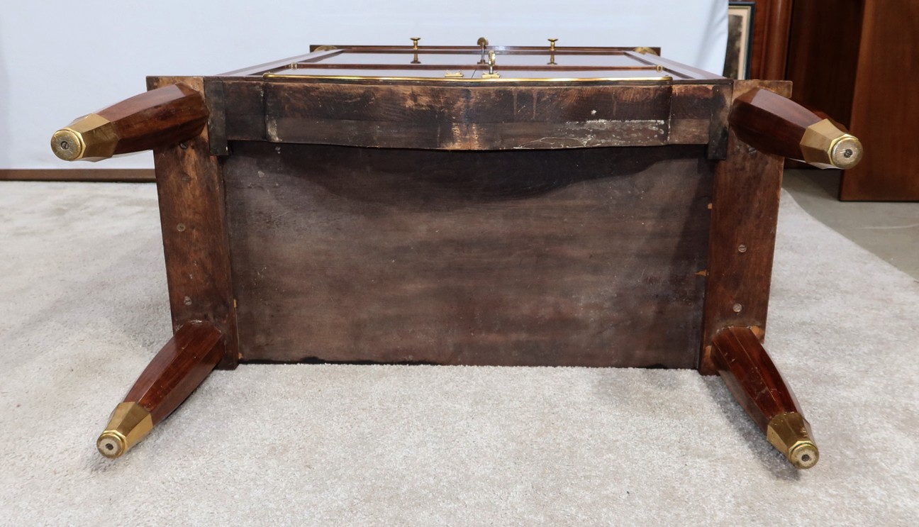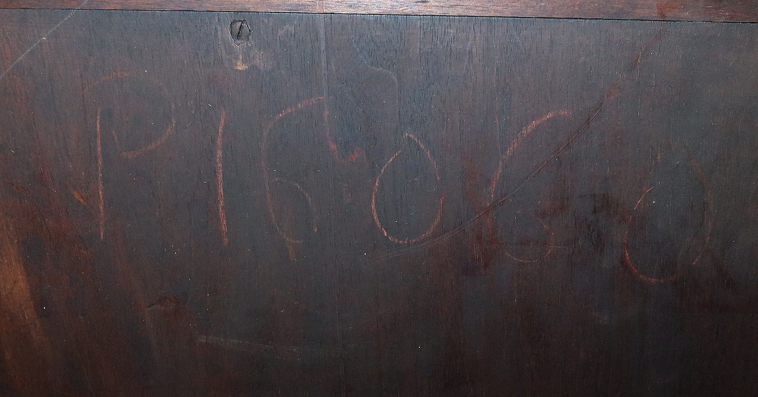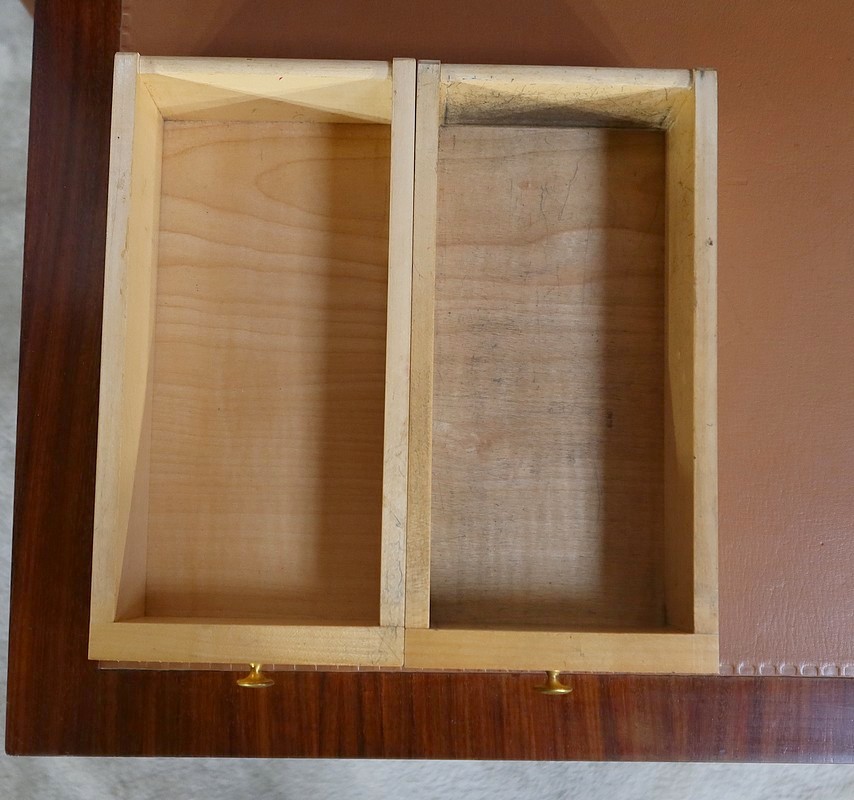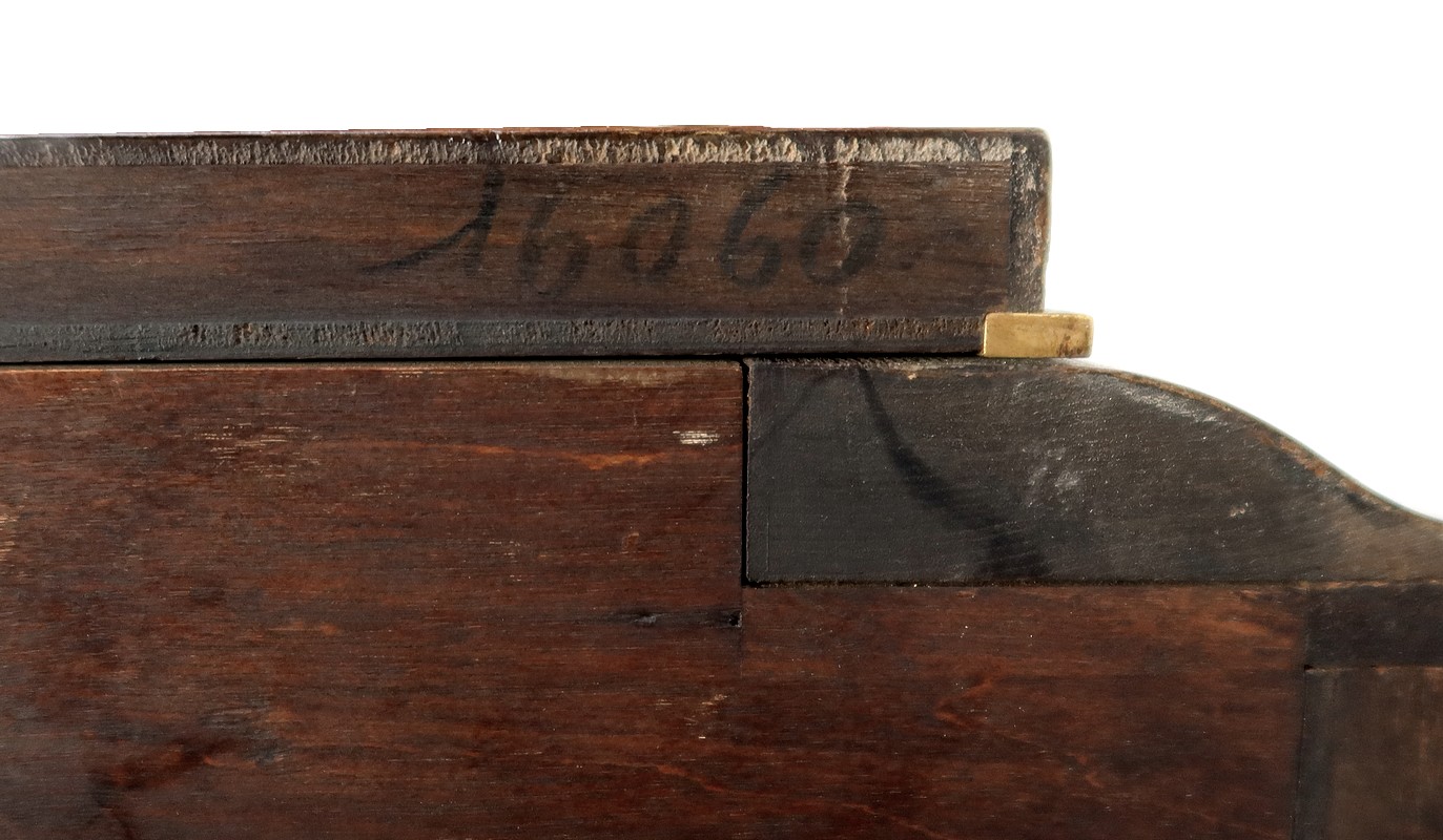 Le dessus en retrait sur le devant et les côtés sont habillés d’une baguette en bronze s’affine avec une large moulure sur le devant et les côtés. Au dos du meuble, le numéro de série – 16060 – est indiqué à plusieurs endroits.
