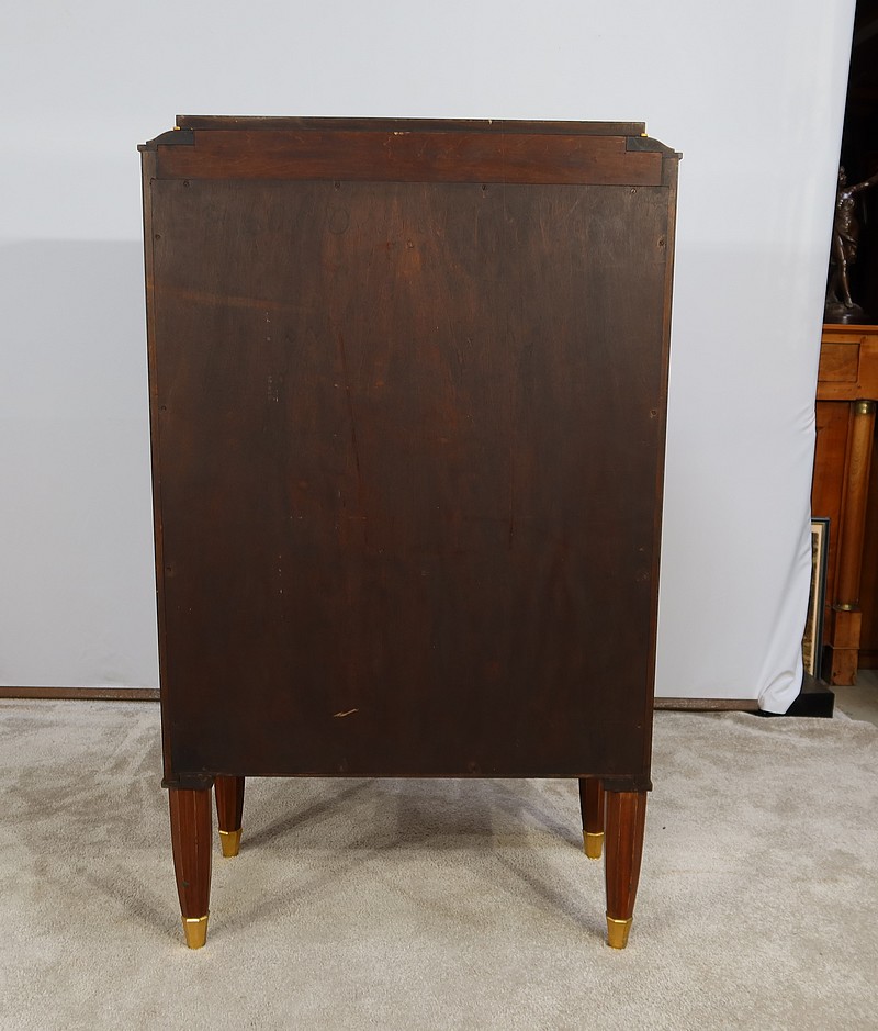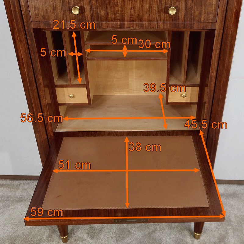 De chaque côté, ce secrétaire possède deux colonnes attachées à pans coupés, baguées en haut et en bas. Enfin, ce meuble repose sur des pieds à pan coupés également s’affinant vers le bas, accompagnés d’un sabot en bronze.