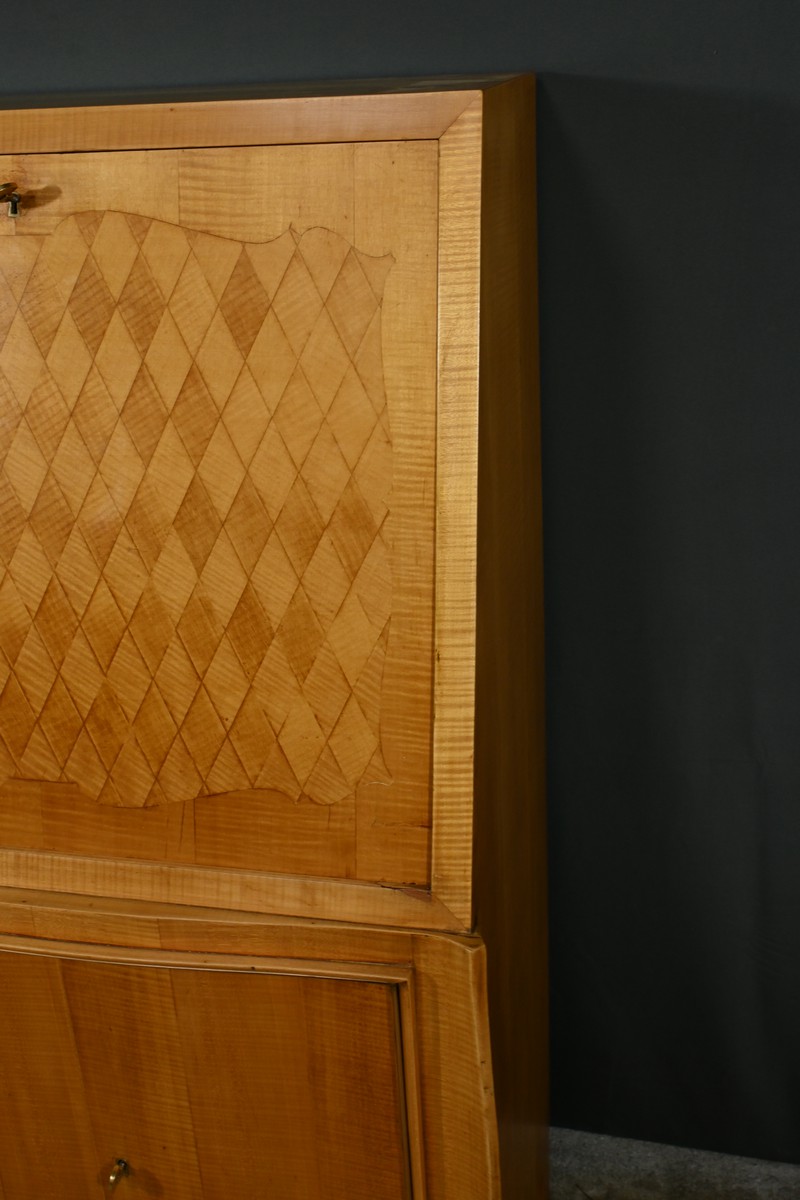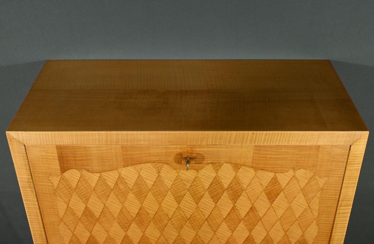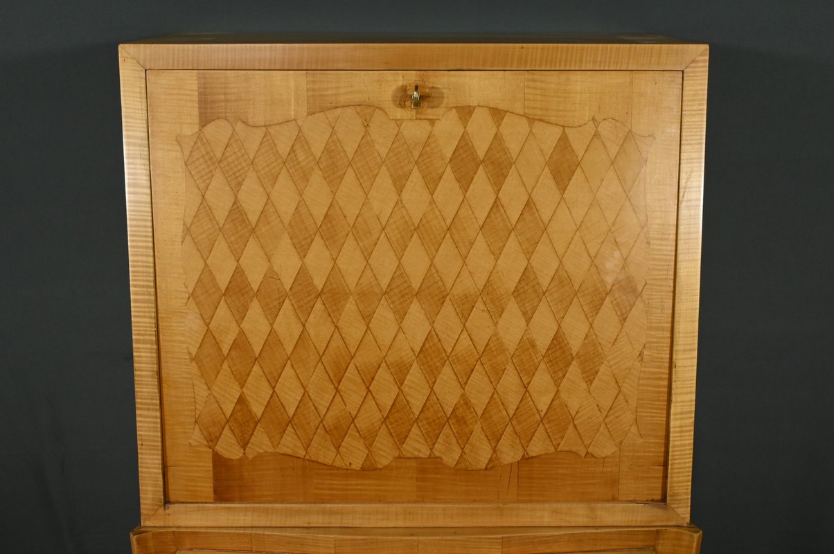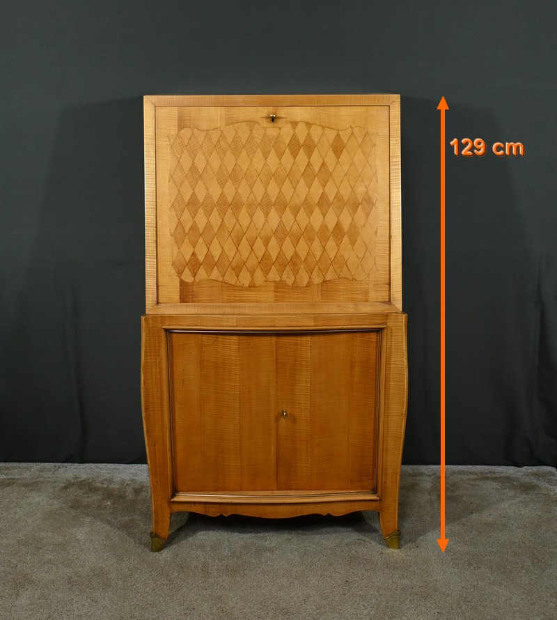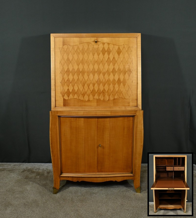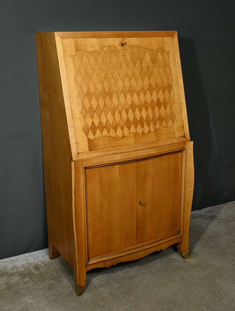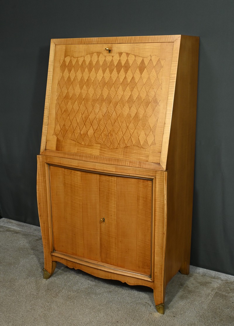 Ce secrétaire art déco, datant des années 1950, est une véritable œuvre d’art en marqueterie de citronnier.