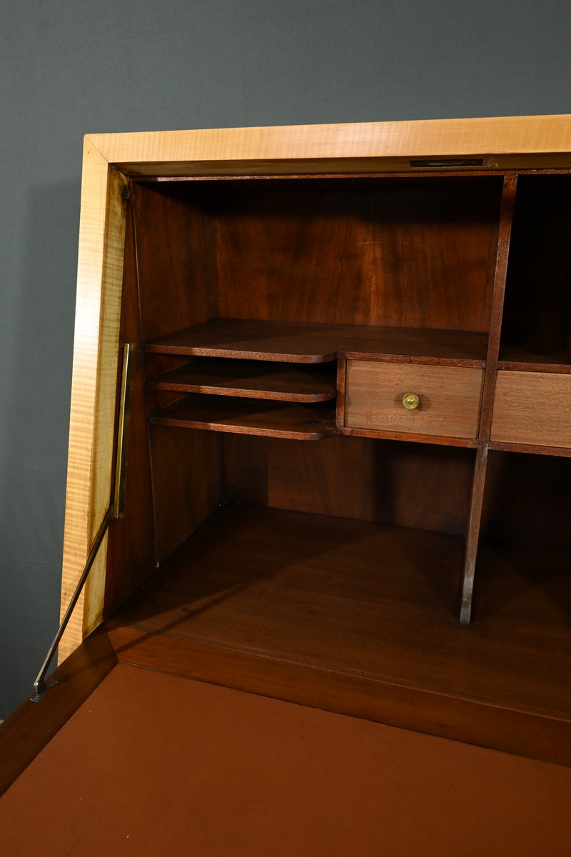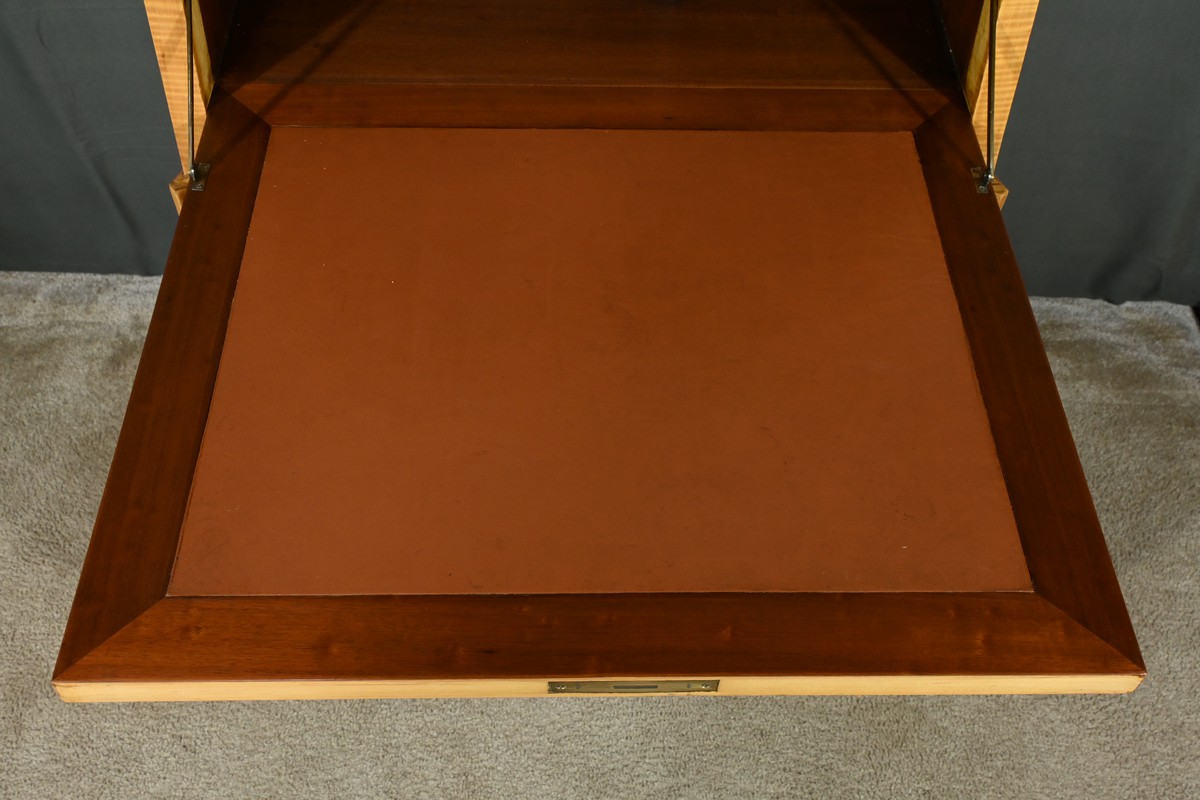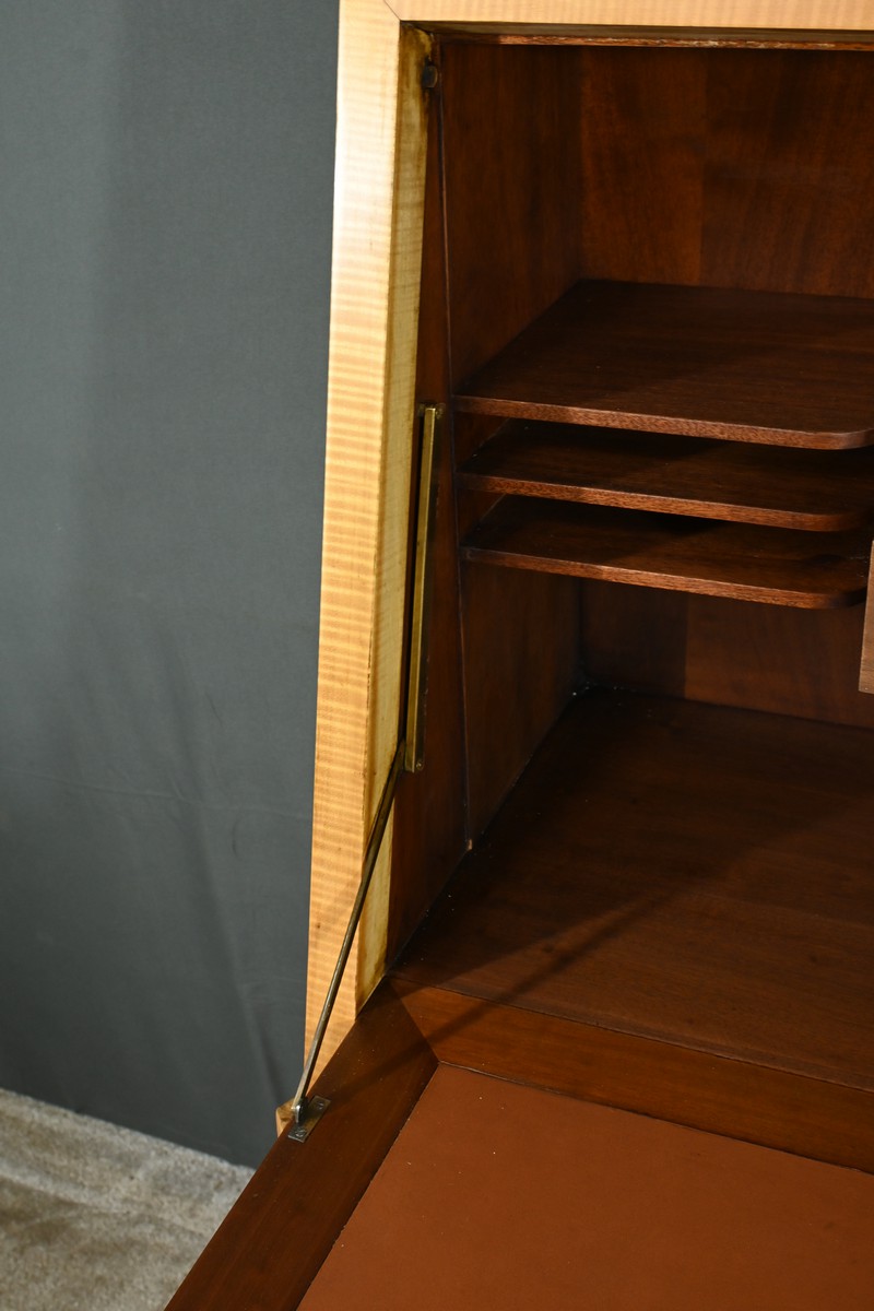 Son abattant, habillé d’un cuir marron élégant, s’ouvre, à l’aide d’une serrure, pour révéler un espace de travail raffiné.