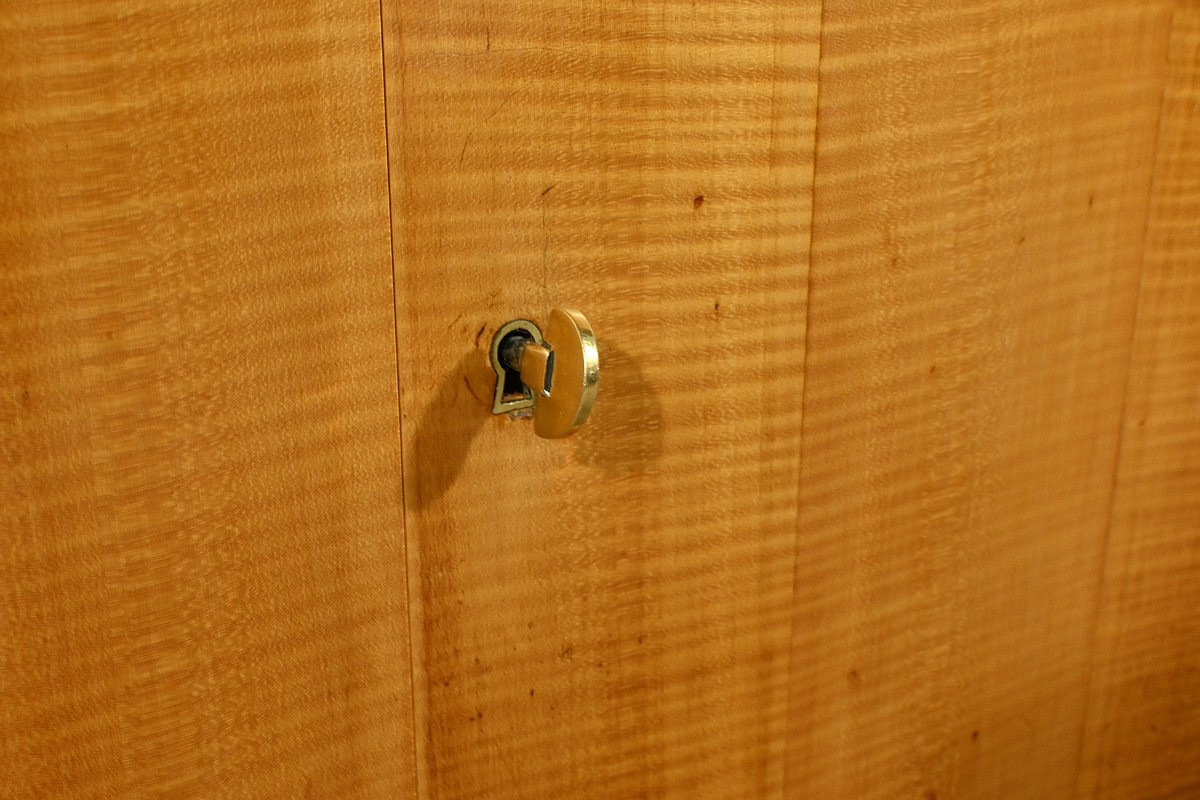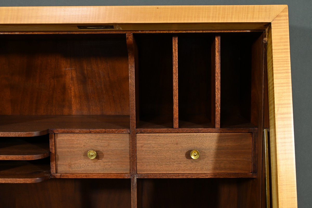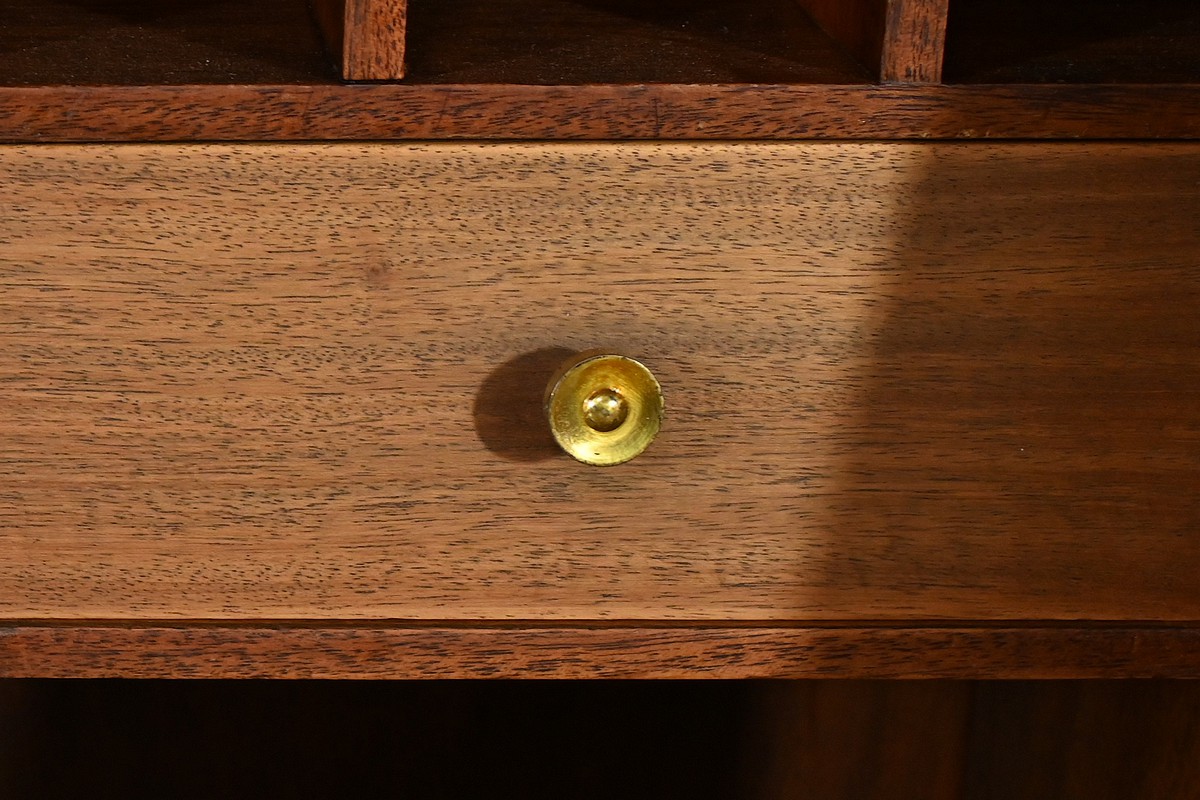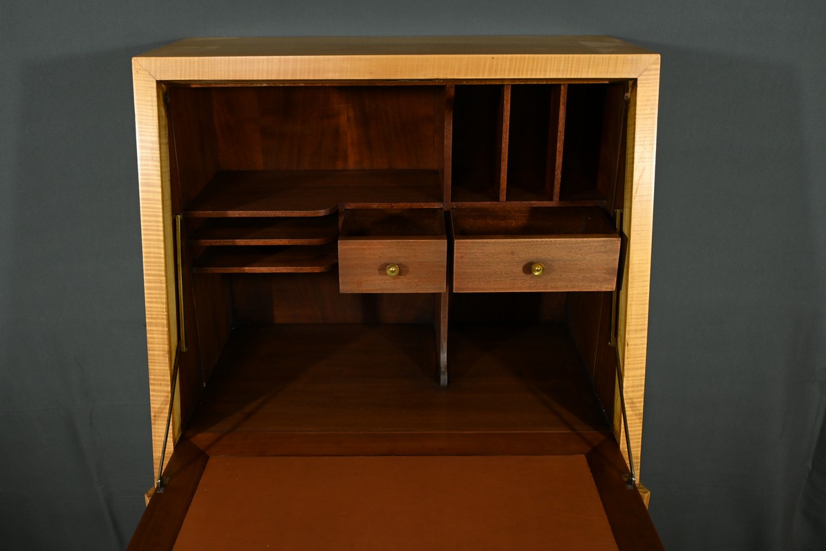 Son abattant, habillé d’un cuir marron élégant, s’ouvre, à l’aide d’une serrure, pour révéler un espace de travail raffiné.