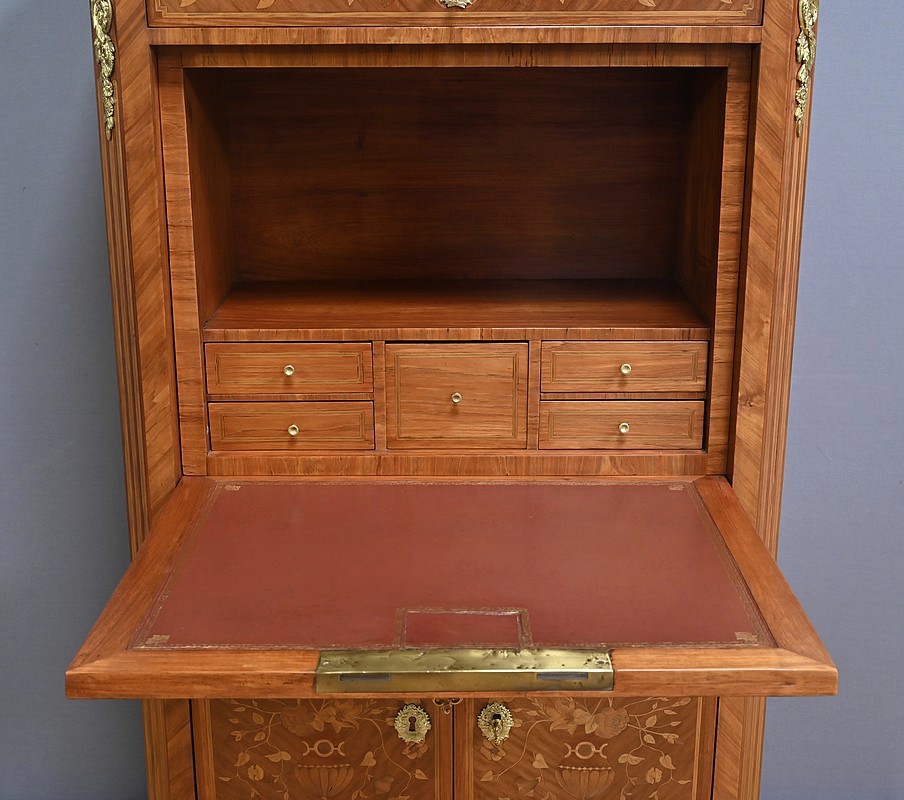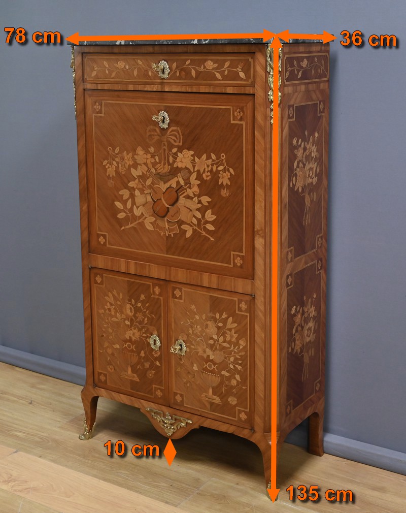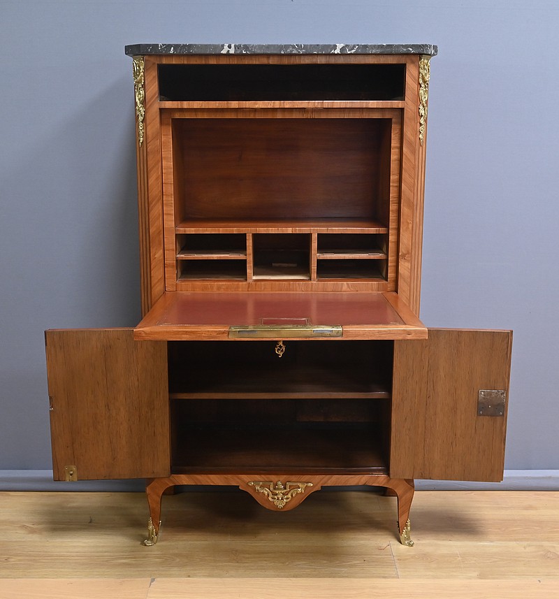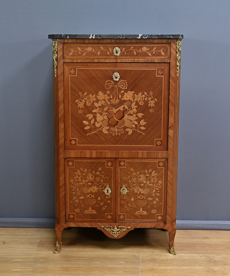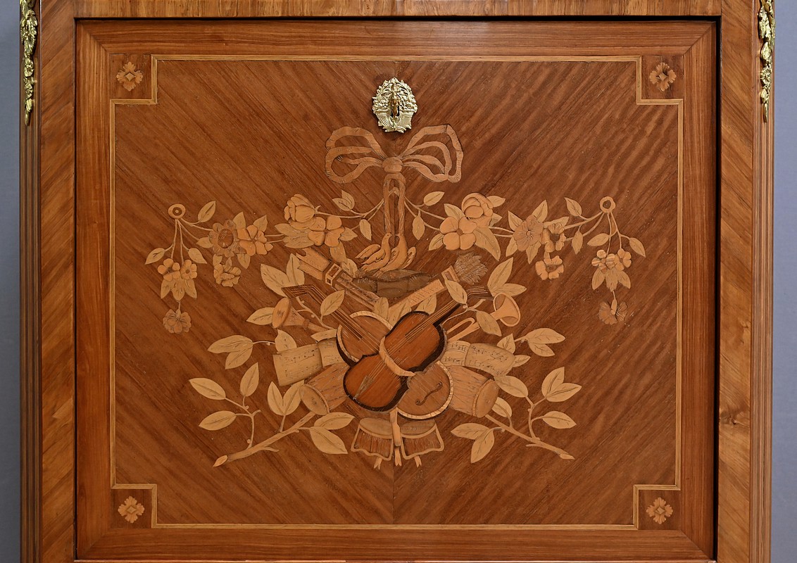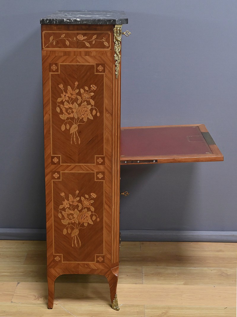 Ce charmant secrétaire de style Transition se distingue par son raffinement et son harmonie esthétique. Son tiroir en ceinture, agrémenté d’un placage de bois de rose, dévoile une marqueterie délicate de feuillage et de fleurs en bois clair, encadrée par un filet de bois teinté. Ce tiroir est équipé d’une serrure fonctionnelle avec entrée en bronze doré et clé. Juste en dessous, l’abattant, doté également de sa serrure d’origine, arbore une somptueuse marqueterie mettant en scène des instruments de musique, des partitions et des carquois, entourés de fleurs et rehaussés d’un ruban. Une fois ouvert, il révèle un intérieur habillé d’un cuir bordeaux à vignette dorée, complété par cinq tiroirs à boutons lentille et une vaste niche, offrant une organisation optimale. La partie inférieure du secrétaire est pourvue d’une double porte ornée de motifs de bouquets délicatement disposés dans des vases, dans un esprit décoratif en parfaite continuité avec l’ensemble. Elle comprend une serrure, des entrées en bronze doré et une clé, garantissant à la fois esthétisme et fonctionnalité. À l’intérieur, une étagère optimise l’espace de rangement. Les montants à pans coupés, réalisés en alternance de bois de rose et bois teinté, sont magnifiés par des chutes florales en bronze doré. Le meuble repose sur de petits pieds cambrés, eux aussi garnis de bronze, lui conférant une allure gracieuse et équilibrée. Les côtés se parent de panneaux en placage de bois de rose, disposés en ailes de papillon et rehaussés d’un décor floral en bois clair. Couronnant cette pièce d’exception, un élégant marbre gris veiné de blanc à pans coupés vient parfaire son allure sophistiquée. Ce secrétaire séduira par ses proportions harmonieuses, ses espaces de rangement ingénieux et son élégance intemporelle.