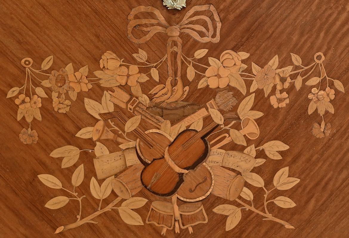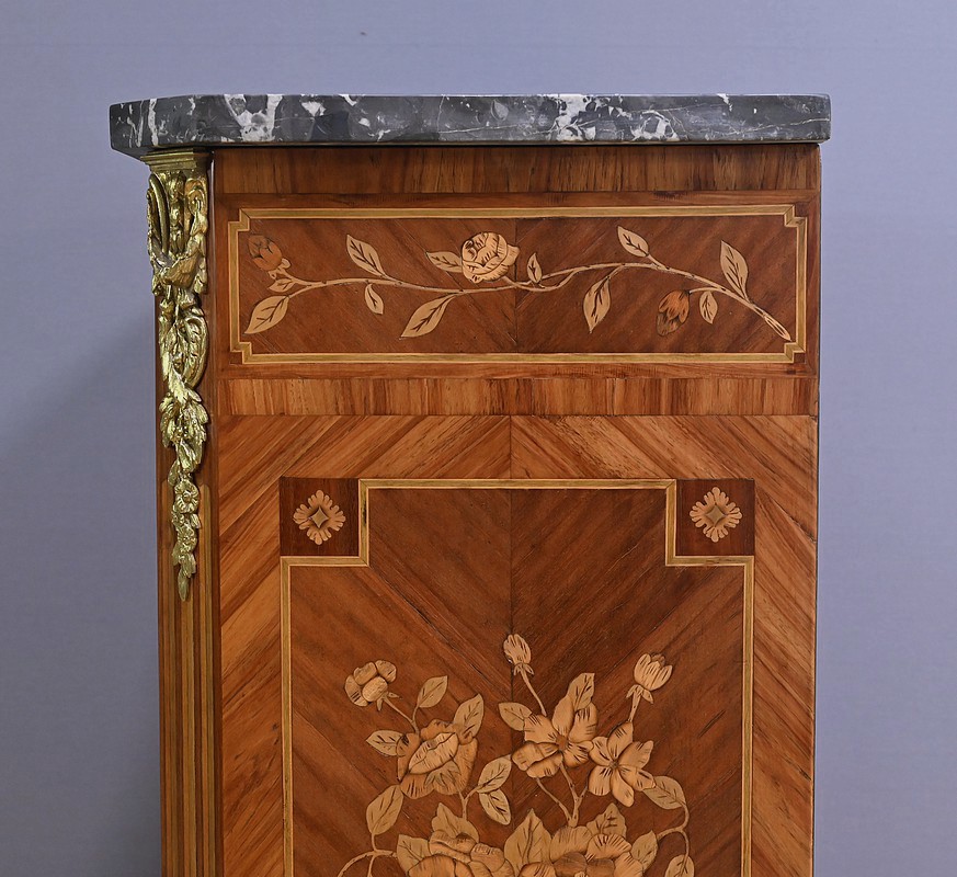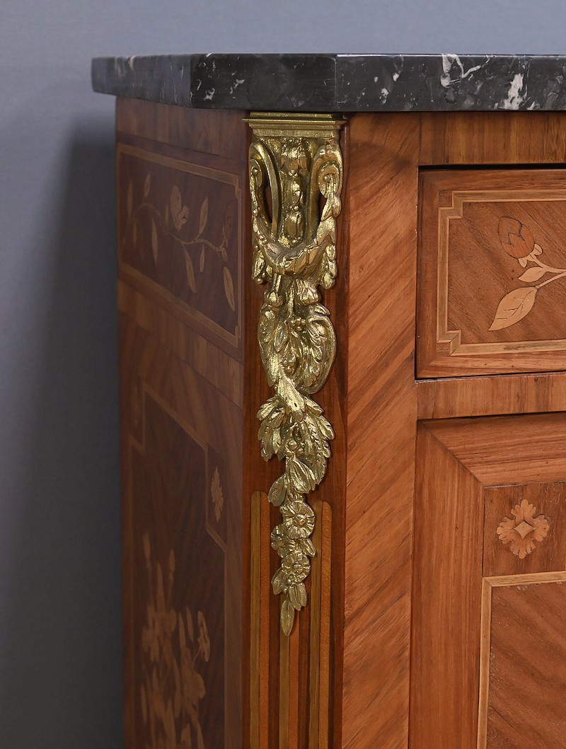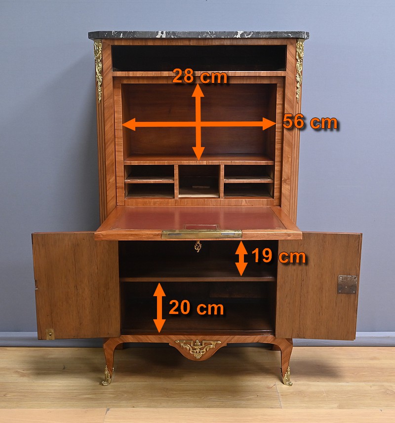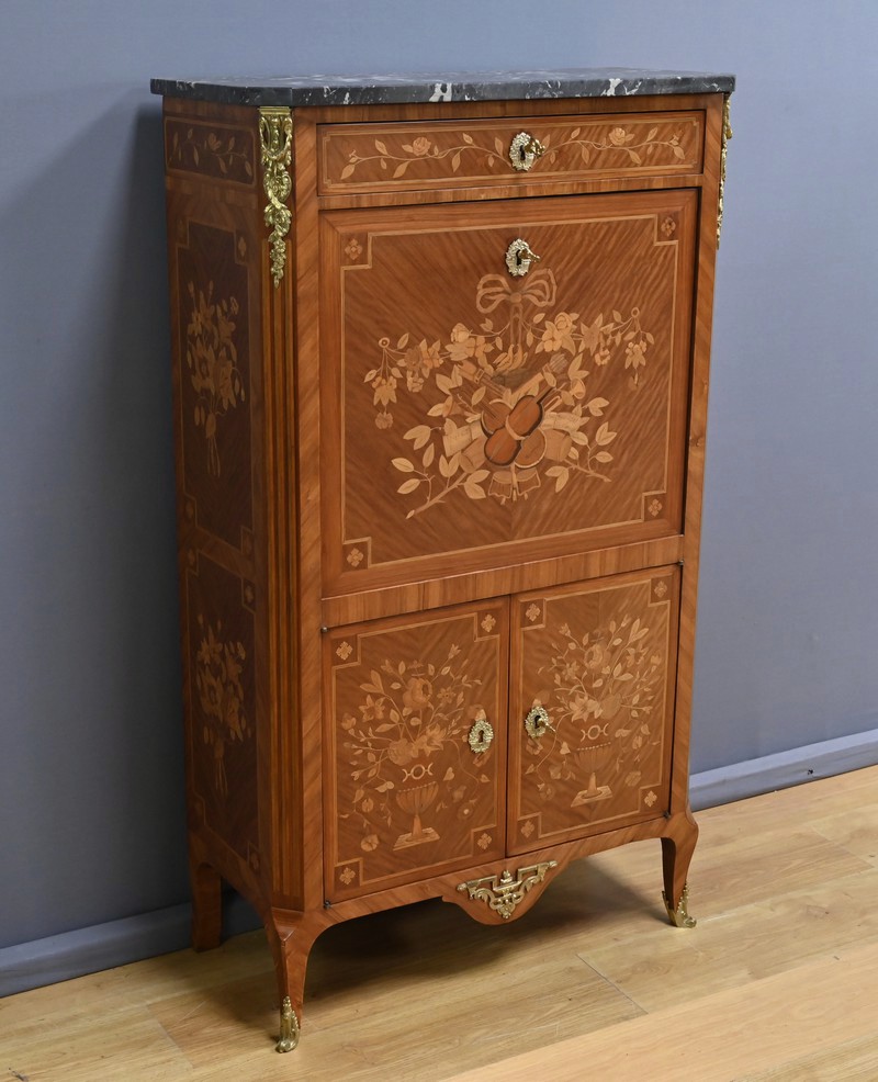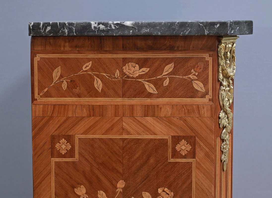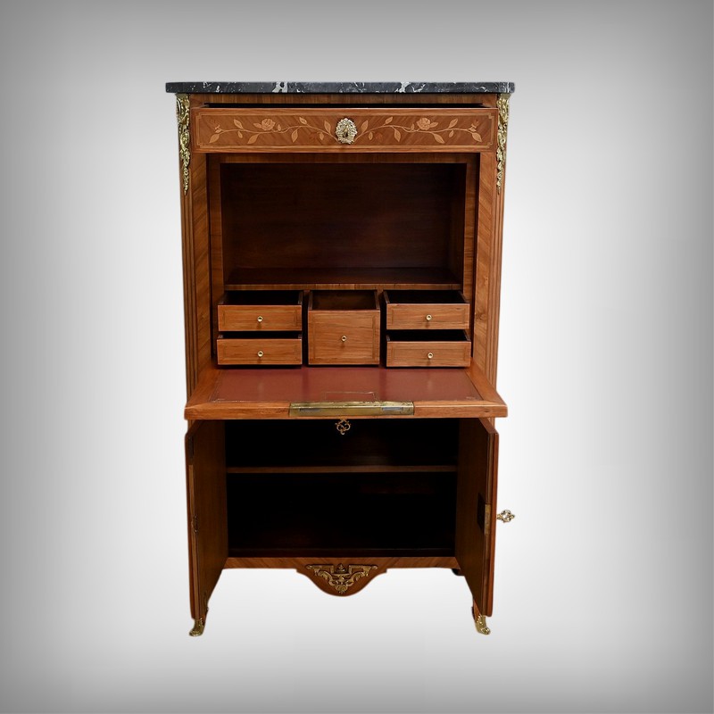 Ce charmant secrétaire de style Transition se distingue par son raffinement et son harmonie esthétique. Son tiroir en ceinture, agrémenté d’un placage de bois de rose, dévoile une marqueterie délicate de feuillage et de fleurs en bois clair, encadrée par un filet de bois teinté. Ce tiroir est équipé d’une serrure fonctionnelle avec entrée en bronze doré et clé. Juste en dessous, l’abattant, doté également de sa serrure d’origine, arbore une somptueuse marqueterie mettant en scène des instruments de musique, des partitions et des carquois, entourés de fleurs et rehaussés d’un ruban. Une fois ouvert, il révèle un intérieur habillé d’un cuir bordeaux à vignette dorée, complété par cinq tiroirs à boutons lentille et une vaste niche, offrant une organisation optimale. La partie inférieure du secrétaire est pourvue d’une double porte ornée de motifs de bouquets délicatement disposés dans des vases, dans un esprit décoratif en parfaite continuité avec l’ensemble. Elle comprend une serrure, des entrées en bronze doré et une clé, garantissant à la fois esthétisme et fonctionnalité. À l’intérieur, une étagère optimise l’espace de rangement. Les montants à pans coupés, réalisés en alternance de bois de rose et bois teinté, sont magnifiés par des chutes florales en bronze doré. Le meuble repose sur de petits pieds cambrés, eux aussi garnis de bronze, lui conférant une allure gracieuse et équilibrée. Les côtés se parent de panneaux en placage de bois de rose, disposés en ailes de papillon et rehaussés d’un décor floral en bois clair. Couronnant cette pièce d’exception, un élégant marbre gris veiné de blanc à pans coupés vient parfaire son allure sophistiquée. Ce secrétaire séduira par ses proportions harmonieuses, ses espaces de rangement ingénieux et son élégance intemporelle.