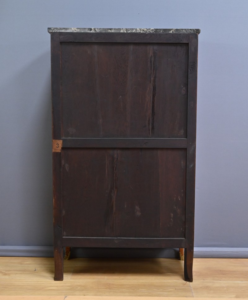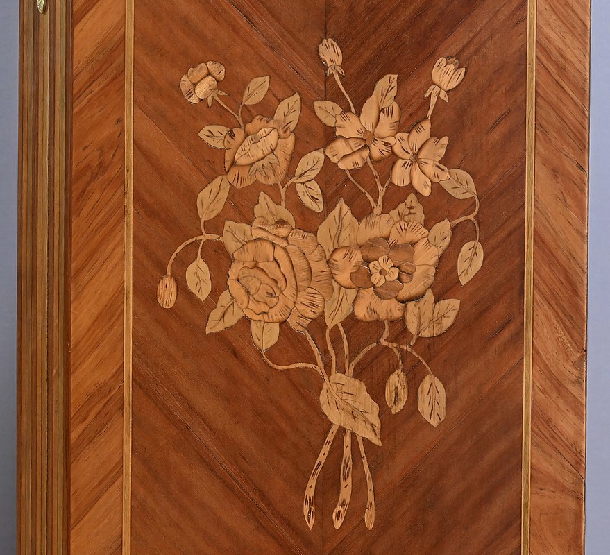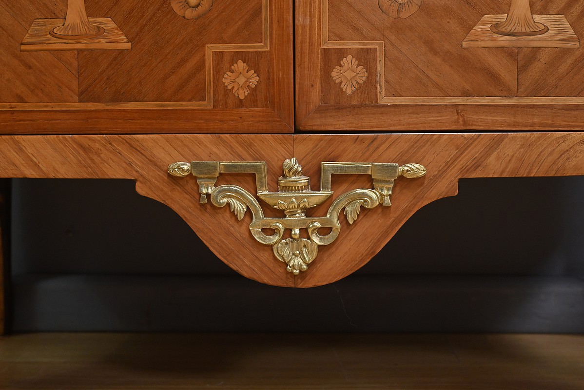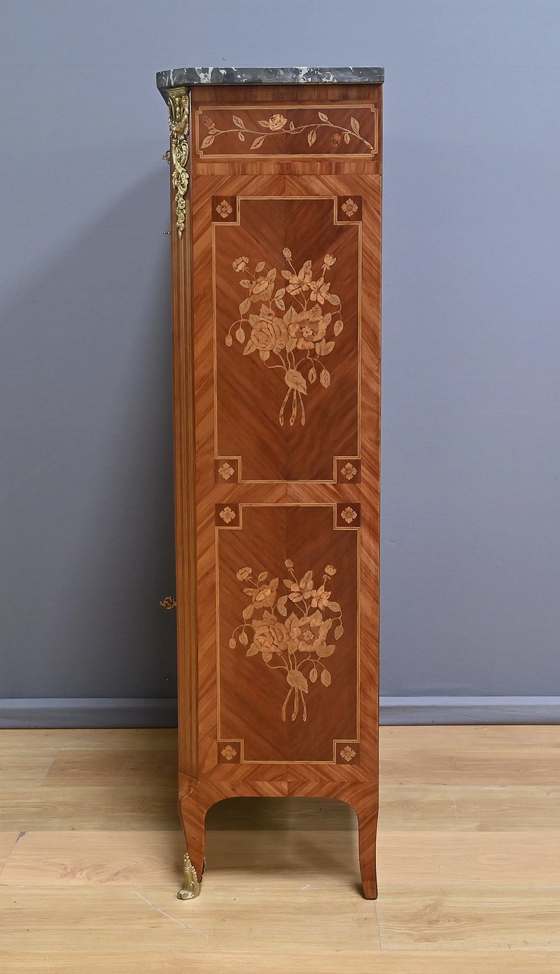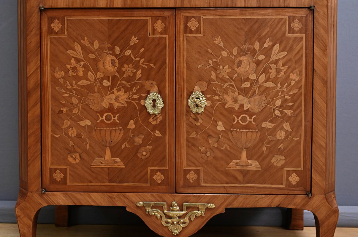 Ce charmant secrétaire de style Transition se distingue par son raffinement et son harmonie esthétique. Son tiroir en ceinture, agrémenté d’un placage de bois de rose, dévoile une marqueterie délicate de feuillage et de fleurs en bois clair, encadrée par un filet de bois teinté. Ce tiroir est équipé d’une serrure fonctionnelle avec entrée en bronze doré et clé. Juste en dessous, l’abattant, doté également de sa serrure d’origine, arbore une somptueuse marqueterie mettant en scène des instruments de musique, des partitions et des carquois, entourés de fleurs et rehaussés d’un ruban. Une fois ouvert, il révèle un intérieur habillé d’un cuir bordeaux à vignette dorée, complété par cinq tiroirs à boutons lentille et une vaste niche, offrant une organisation optimale. La partie inférieure du secrétaire est pourvue d’une double porte ornée de motifs de bouquets délicatement disposés dans des vases, dans un esprit décoratif en parfaite continuité avec l’ensemble. Elle comprend une serrure, des entrées en bronze doré et une clé, garantissant à la fois esthétisme et fonctionnalité. À l’intérieur, une étagère optimise l’espace de rangement. Les montants à pans coupés, réalisés en alternance de bois de rose et bois teinté, sont magnifiés par des chutes florales en bronze doré. Le meuble repose sur de petits pieds cambrés, eux aussi garnis de bronze, lui conférant une allure gracieuse et équilibrée. Les côtés se parent de panneaux en placage de bois de rose, disposés en ailes de papillon et rehaussés d’un décor floral en bois clair. Couronnant cette pièce d’exception, un élégant marbre gris veiné de blanc à pans coupés vient parfaire son allure sophistiquée. Ce secrétaire séduira par ses proportions harmonieuses, ses espaces de rangement ingénieux et son élégance intemporelle.