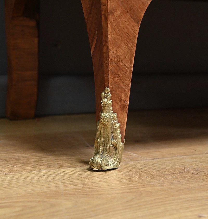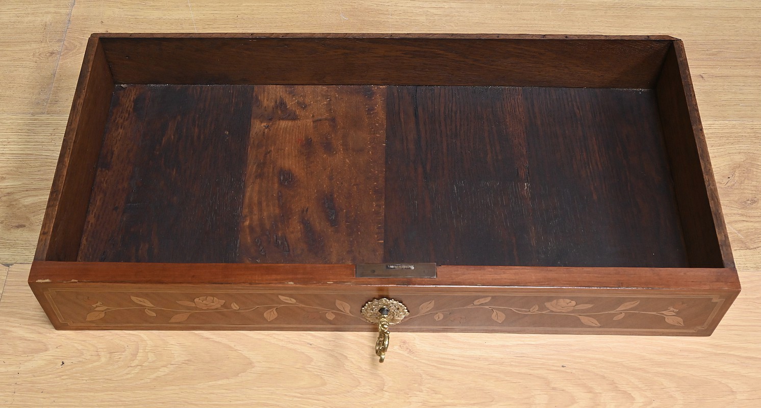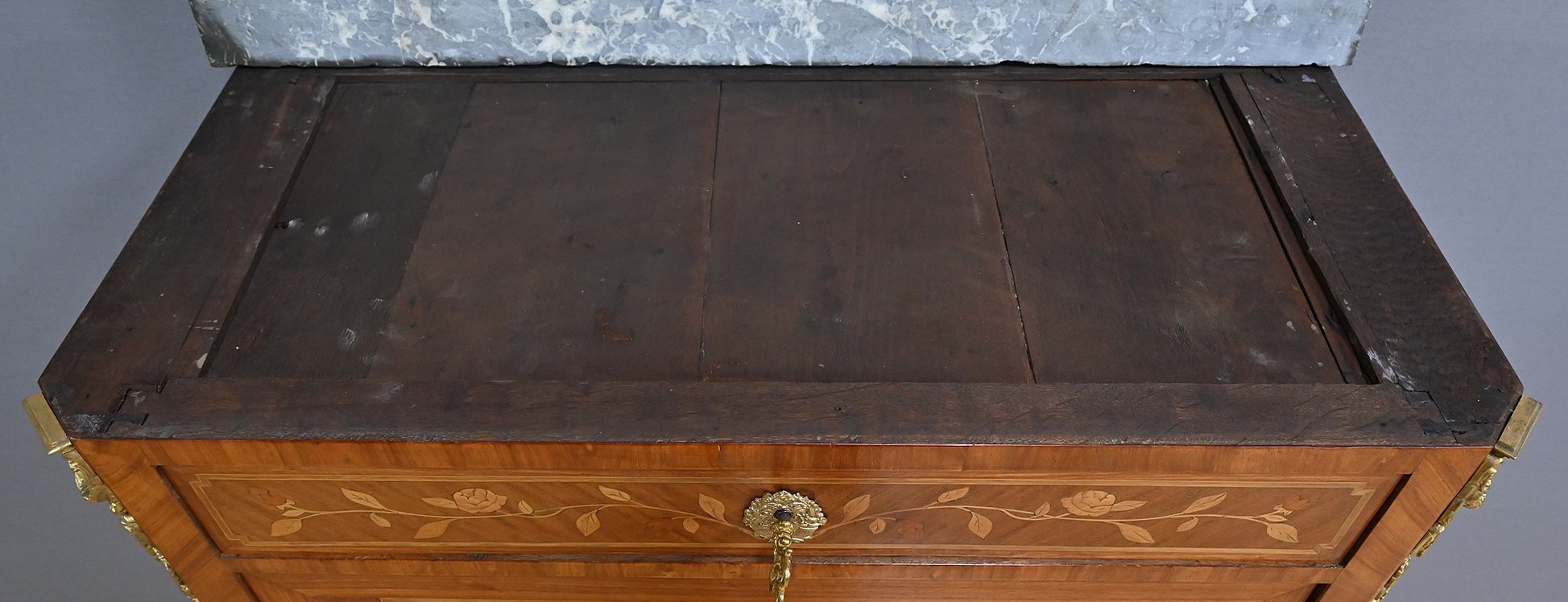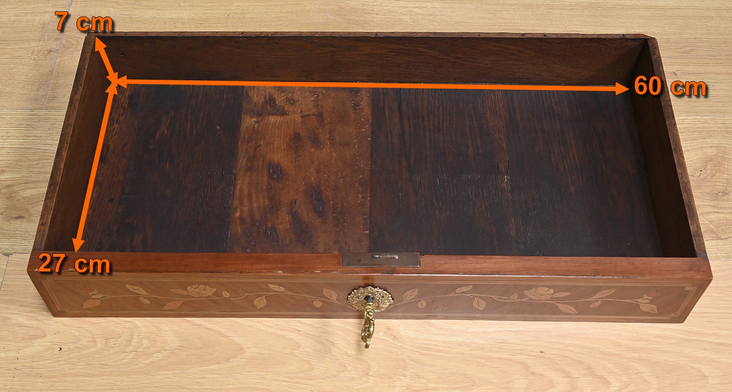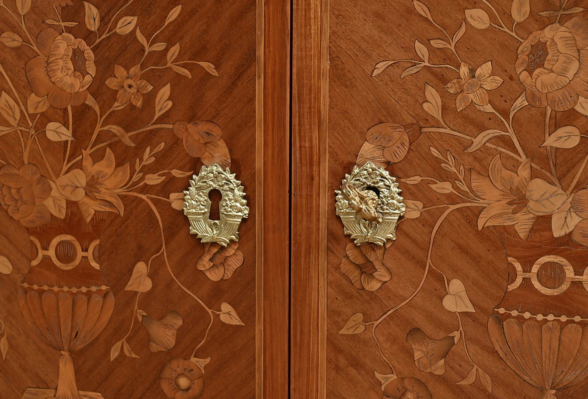 Ce charmant secrétaire de style Transition se distingue par son raffinement et son harmonie esthétique. Son tiroir en ceinture, agrémenté d’un placage de bois de rose, dévoile une marqueterie délicate de feuillage et de fleurs en bois clair, encadrée par un filet de bois teinté. Ce tiroir est équipé d’une serrure fonctionnelle avec entrée en bronze doré et clé. Juste en dessous, l’abattant, doté également de sa serrure d’origine, arbore une somptueuse marqueterie mettant en scène des instruments de musique, des partitions et des carquois, entourés de fleurs et rehaussés d’un ruban. Une fois ouvert, il révèle un intérieur habillé d’un cuir bordeaux à vignette dorée, complété par cinq tiroirs à boutons lentille et une vaste niche, offrant une organisation optimale. La partie inférieure du secrétaire est pourvue d’une double porte ornée de motifs de bouquets délicatement disposés dans des vases, dans un esprit décoratif en parfaite continuité avec l’ensemble. Elle comprend une serrure, des entrées en bronze doré et une clé, garantissant à la fois esthétisme et fonctionnalité. À l’intérieur, une étagère optimise l’espace de rangement. Les montants à pans coupés, réalisés en alternance de bois de rose et bois teinté, sont magnifiés par des chutes florales en bronze doré. Le meuble repose sur de petits pieds cambrés, eux aussi garnis de bronze, lui conférant une allure gracieuse et équilibrée. Les côtés se parent de panneaux en placage de bois de rose, disposés en ailes de papillon et rehaussés d’un décor floral en bois clair. Couronnant cette pièce d’exception, un élégant marbre gris veiné de blanc à pans coupés vient parfaire son allure sophistiquée. Ce secrétaire séduira par ses proportions harmonieuses, ses espaces de rangement ingénieux et son élégance intemporelle.