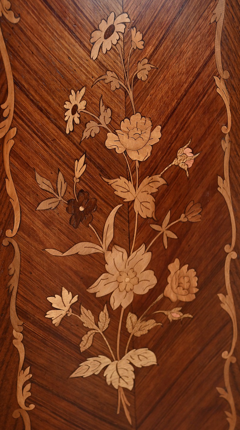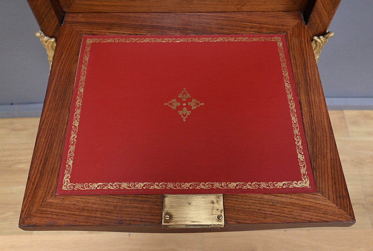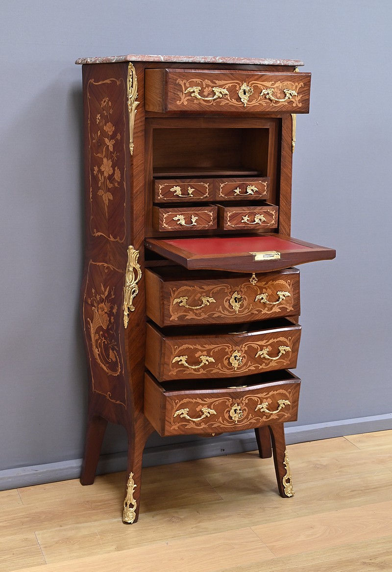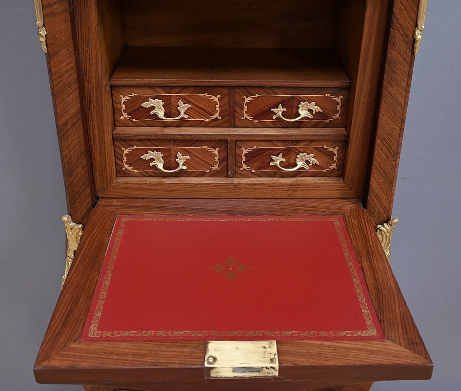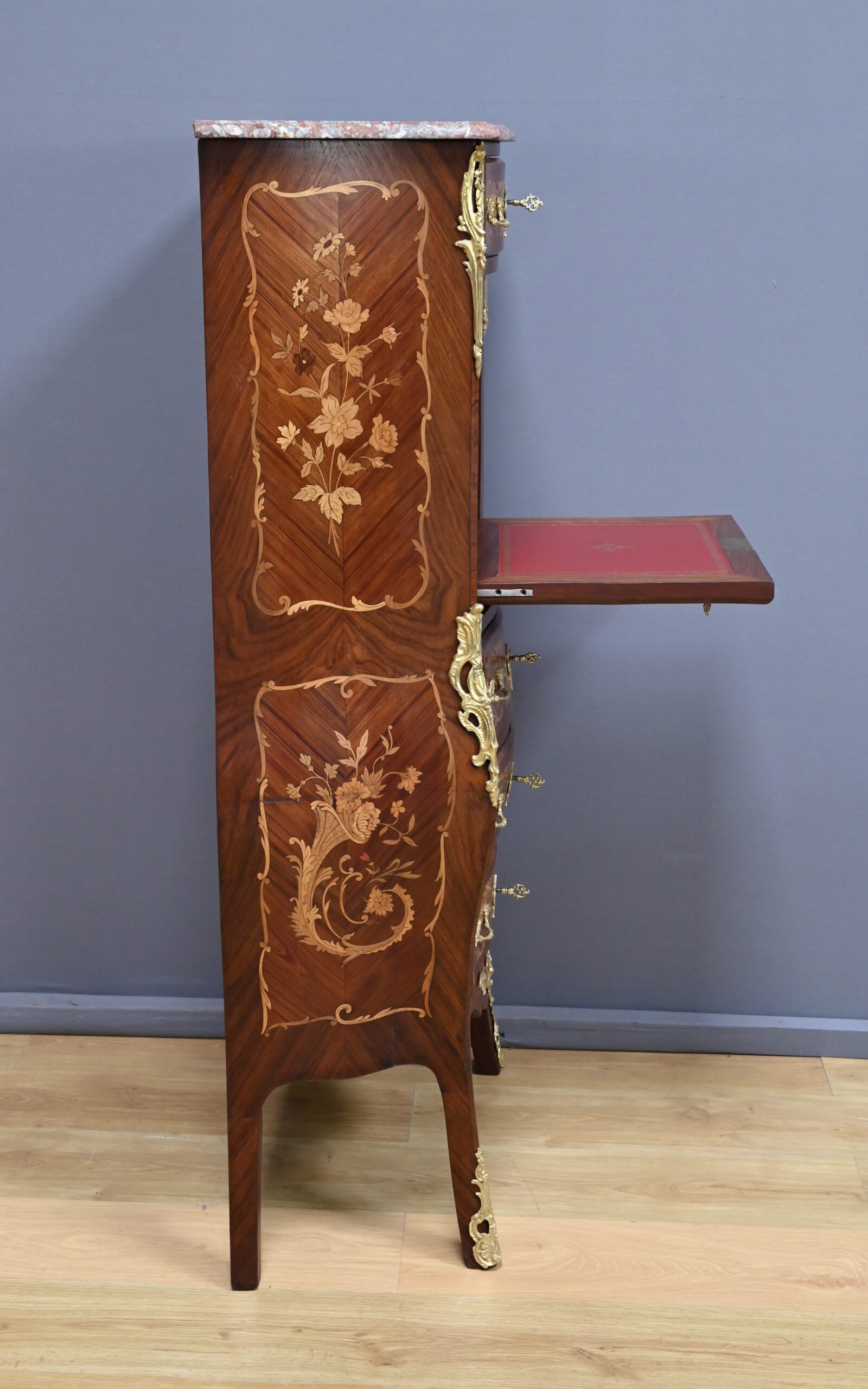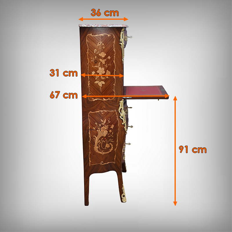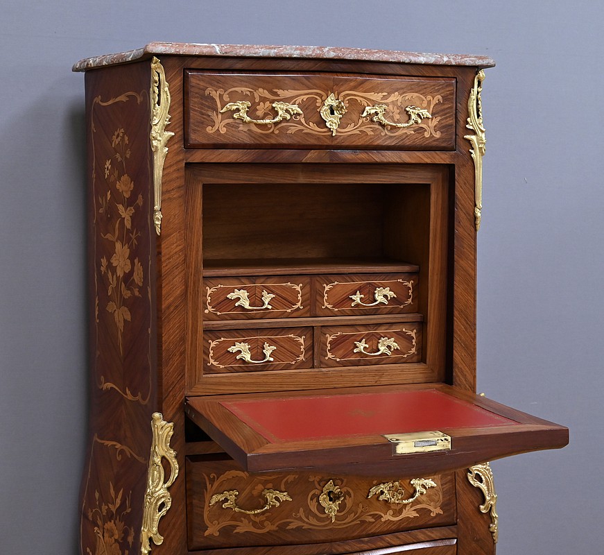 Superbe secrétaire d’époque Napoléon III, de style Transition, en placage de palissandre sublimé par une marqueterie de bois de rose et de bois clair à décor floral. Il s’organise en quatre tiroirs à traverses apparentes et un abattant central découvrant une niche et trois tiroirs. L’abattant, revêtu d’un cuir rouge neuf orné d’une vignette à froid et d’un élégant motif doré central, allie confort d’écriture et prestige esthétique. Les montants et pieds galbés sont rehaussés de chutes et de garnitures en bronze finement ciselées, tandis qu’une parure en bronze souligne la traverse basse du meuble. L’ensemble est couronné d’un marbre rouge royal, qui épouse avec grâce les lignes galbées du meuble. Toutes les serrures sont d’origine, parfaitement fonctionnelles, accompagnées de superbes entrées ouvragées et de clés finement travaillées. Une pièce remarquable, témoin de la qualité de l’artisanat français du XIXe siècle.