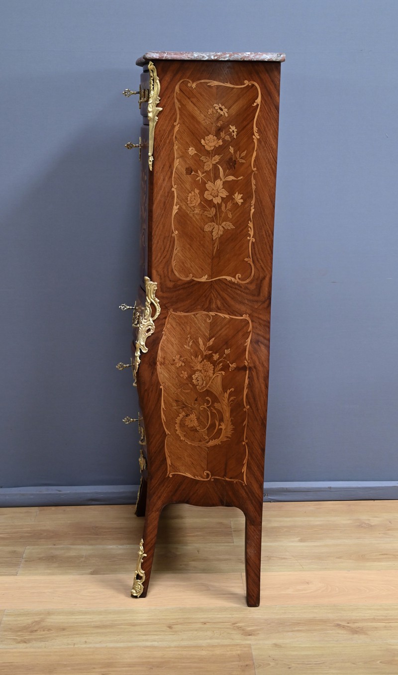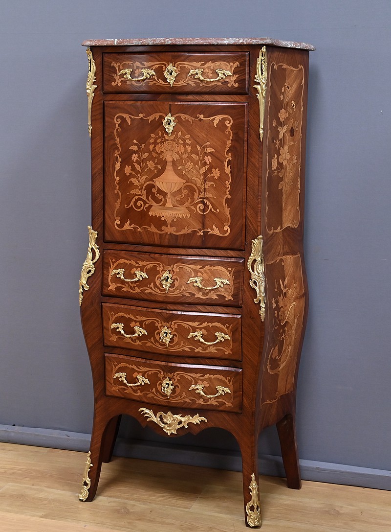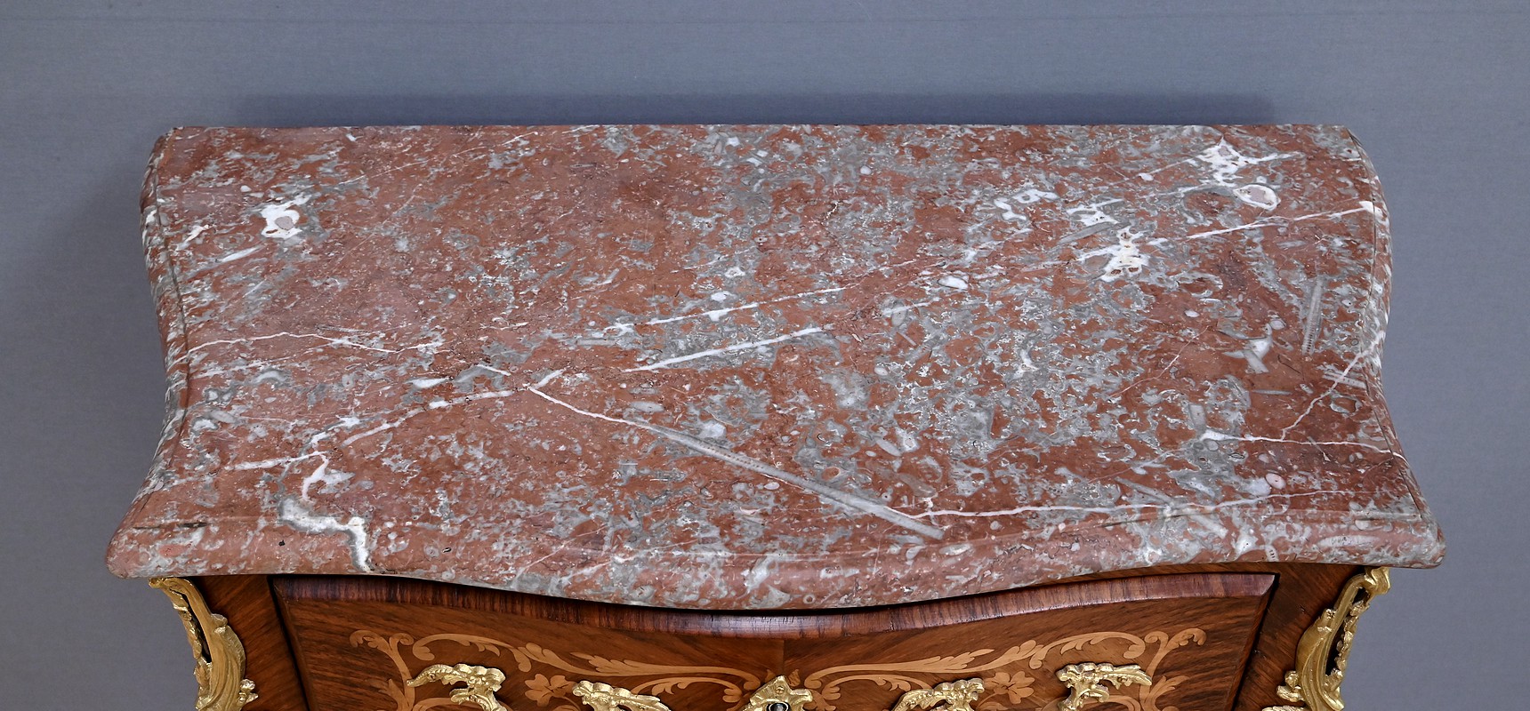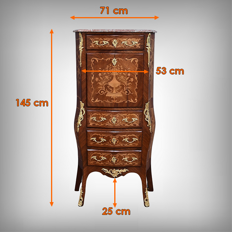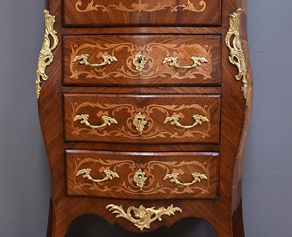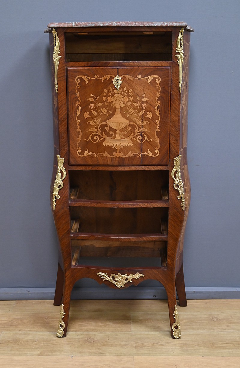 Superbe secrétaire d’époque Napoléon III, de style Transition, en placage de palissandre sublimé par une marqueterie de bois de rose et de bois clair à décor floral. Il s’organise en quatre tiroirs à traverses apparentes et un abattant central découvrant une niche et trois tiroirs. L’abattant, revêtu d’un cuir rouge neuf orné d’une vignette à froid et d’un élégant motif doré central, allie confort d’écriture et prestige esthétique. Les montants et pieds galbés sont rehaussés de chutes et de garnitures en bronze finement ciselées, tandis qu’une parure en bronze souligne la traverse basse du meuble. L’ensemble est couronné d’un marbre rouge royal, qui épouse avec grâce les lignes galbées du meuble. Toutes les serrures sont d’origine, parfaitement fonctionnelles, accompagnées de superbes entrées ouvragées et de clés finement travaillées. Une pièce remarquable, témoin de la qualité de l’artisanat français du XIXe siècle.