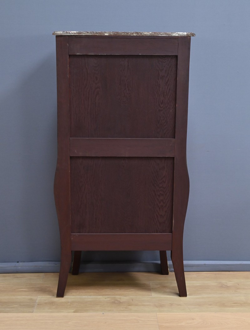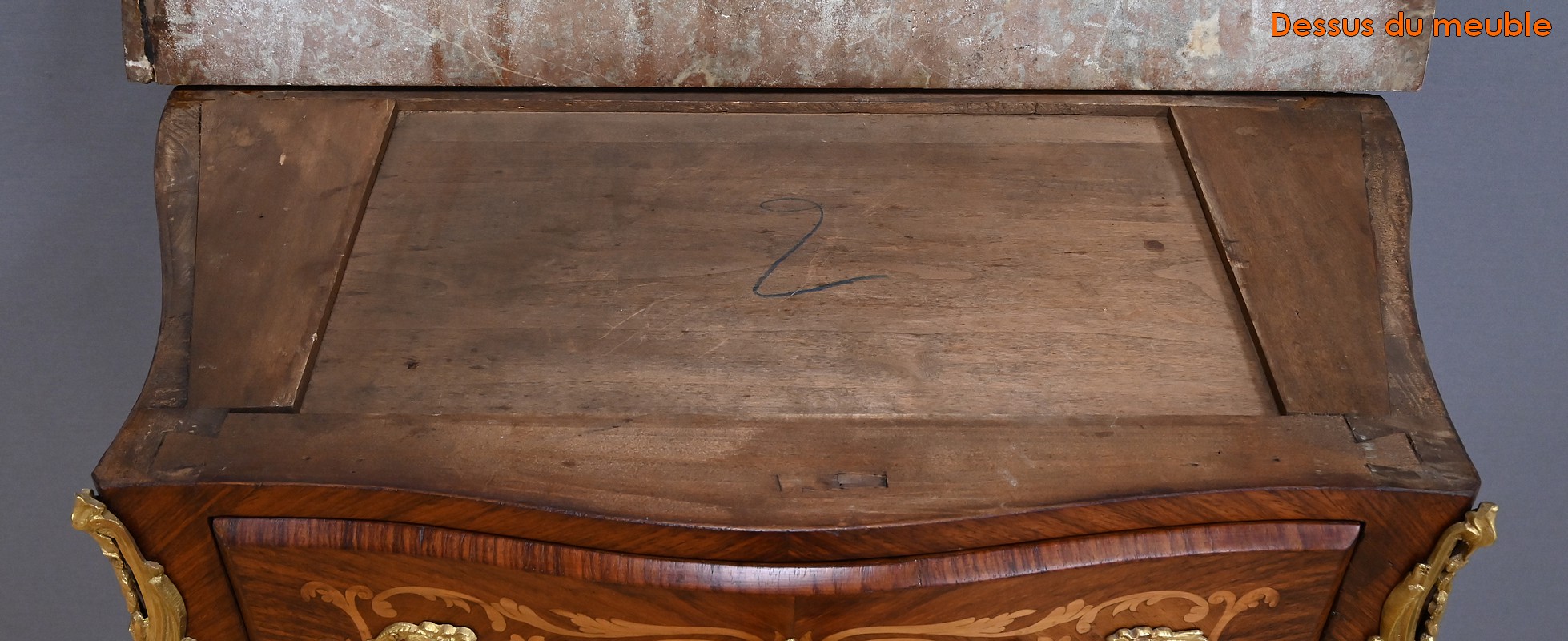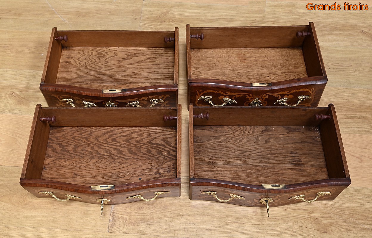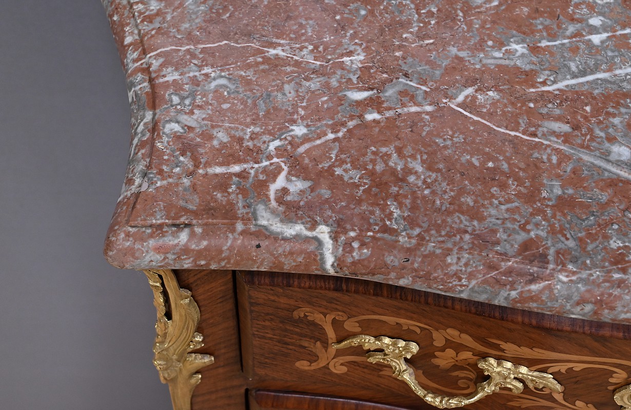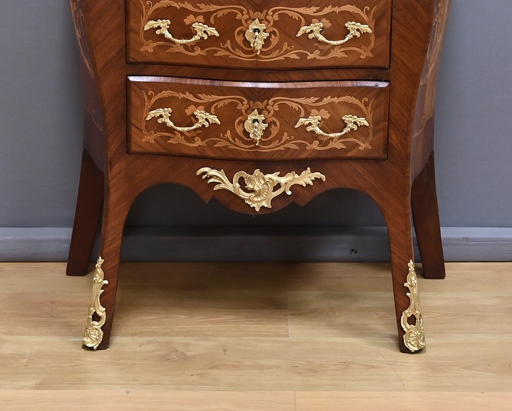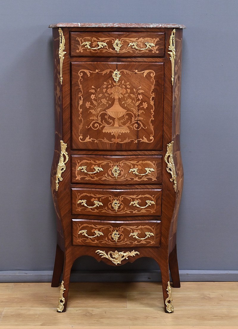 Superbe secrétaire d’époque Napoléon III, de style Transition, en placage de palissandre sublimé par une marqueterie de bois de rose et de bois clair à décor floral. Il s’organise en quatre tiroirs à traverses apparentes et un abattant central découvrant une niche et trois tiroirs. L’abattant, revêtu d’un cuir rouge neuf orné d’une vignette à froid et d’un élégant motif doré central, allie confort d’écriture et prestige esthétique. Les montants et pieds galbés sont rehaussés de chutes et de garnitures en bronze finement ciselées, tandis qu’une parure en bronze souligne la traverse basse du meuble. L’ensemble est couronné d’un marbre rouge royal, qui épouse avec grâce les lignes galbées du meuble. Toutes les serrures sont d’origine, parfaitement fonctionnelles, accompagnées de superbes entrées ouvragées et de clés finement travaillées. Une pièce remarquable, témoin de la qualité de l’artisanat français du XIXe siècle.