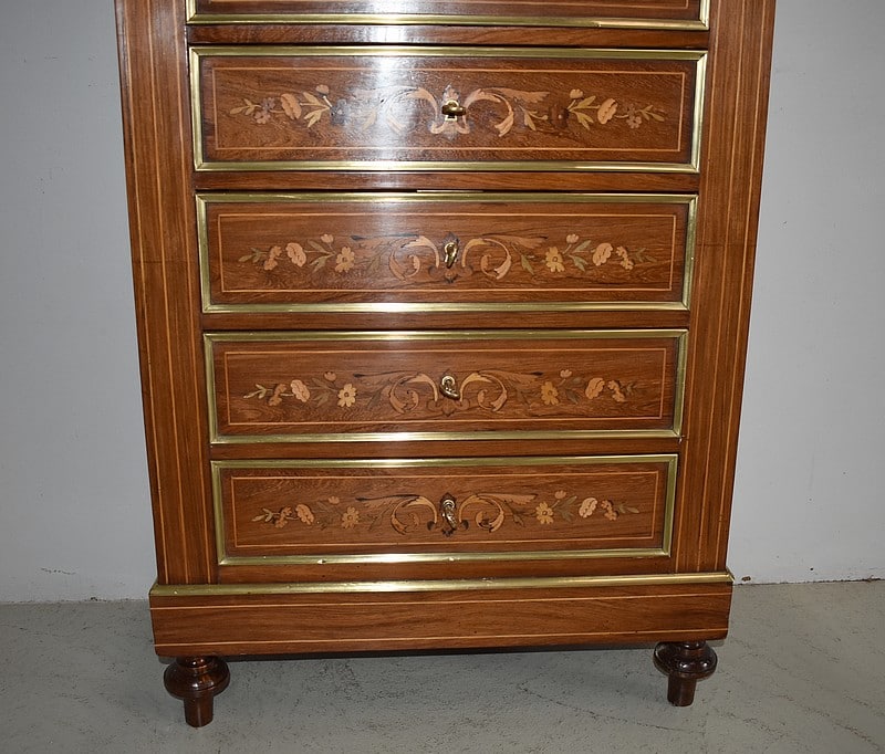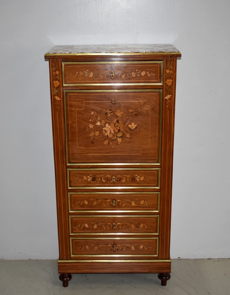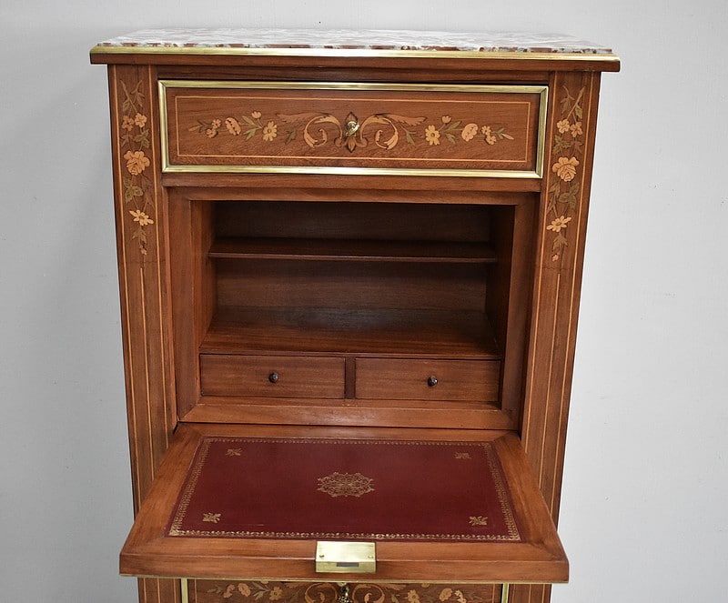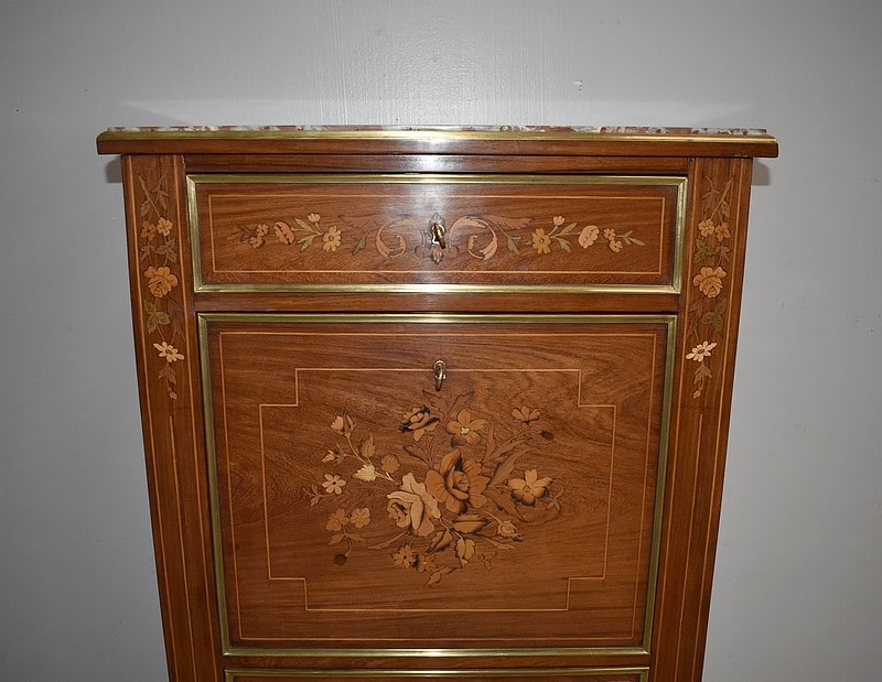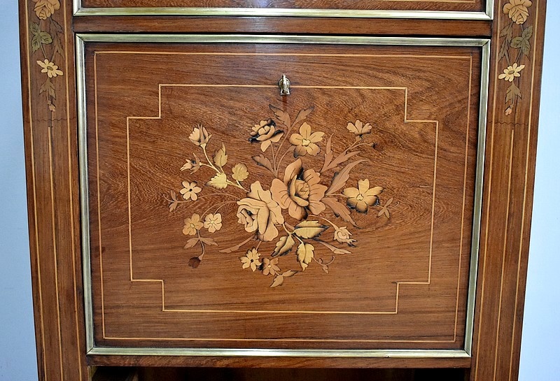 Petit Secrétaire en palissandre très clair souligné de filets de citronnier. Il est orné de marqueteries de fleurs, d’un bouquet et de rinceaux en citronnier et bois teintés dans le goût Charles X.
