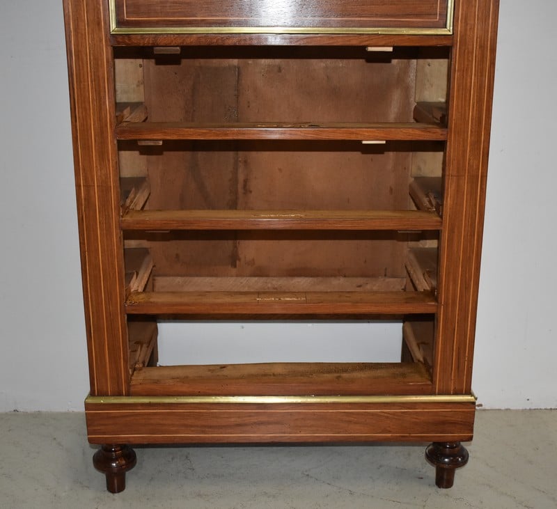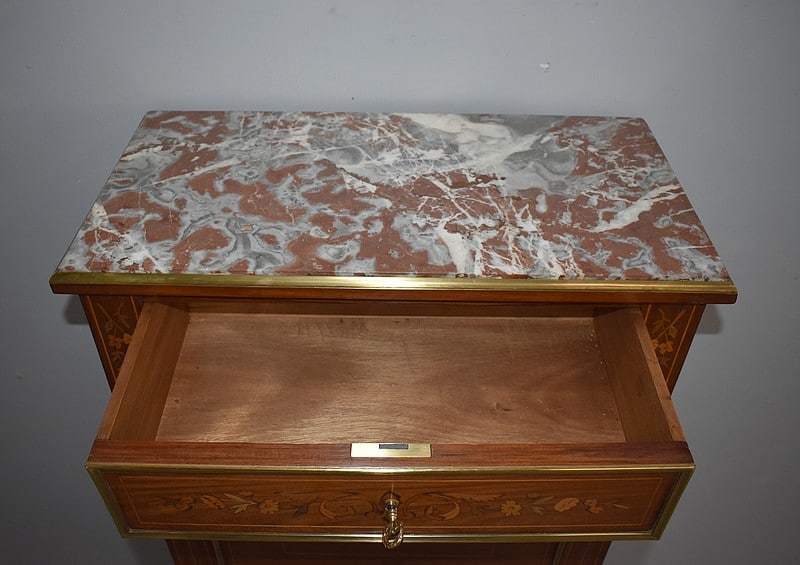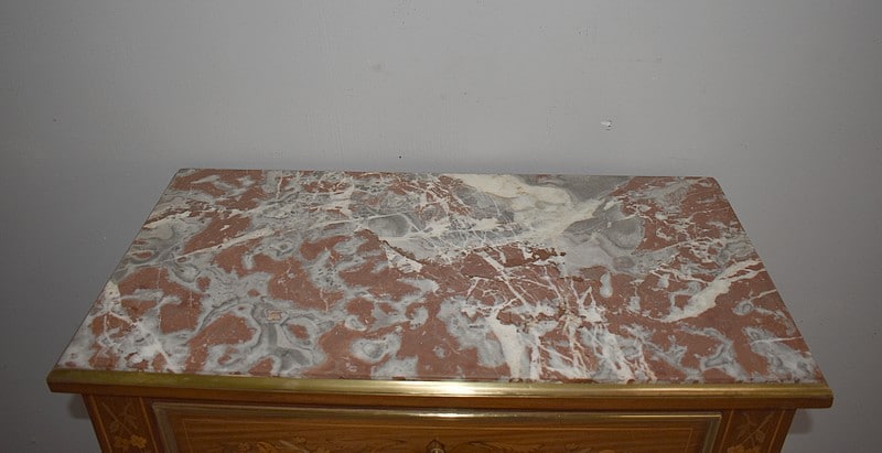 Le dessus , en marbre ‘rouge griotte des Pyrénées’ est également serti d’une baguette en laiton.