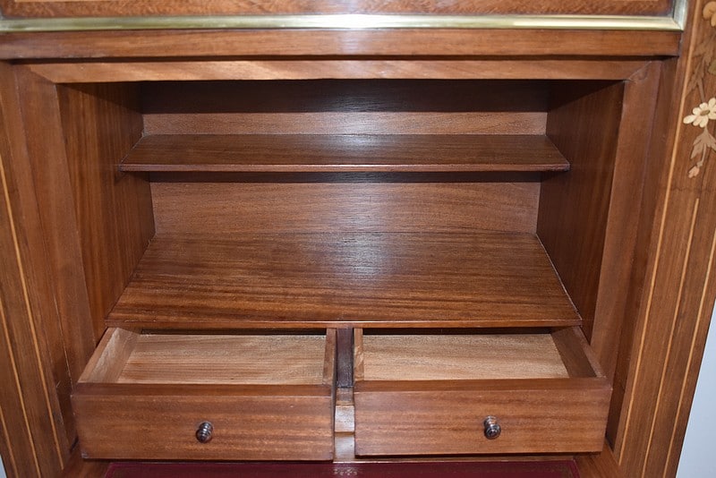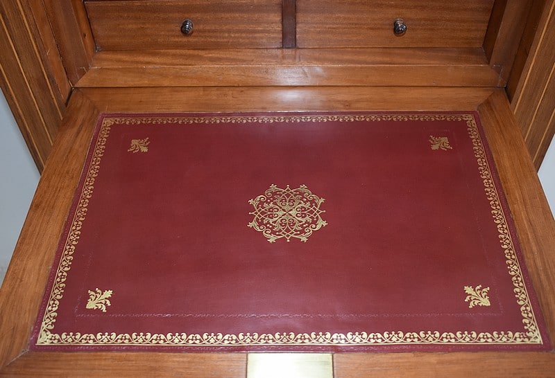 L’abattant, gainé d’un cuir rouge bordeaux, changé, découvre un tabernacle en acajou composé de 2 casiers et de 2 tiroirs.
