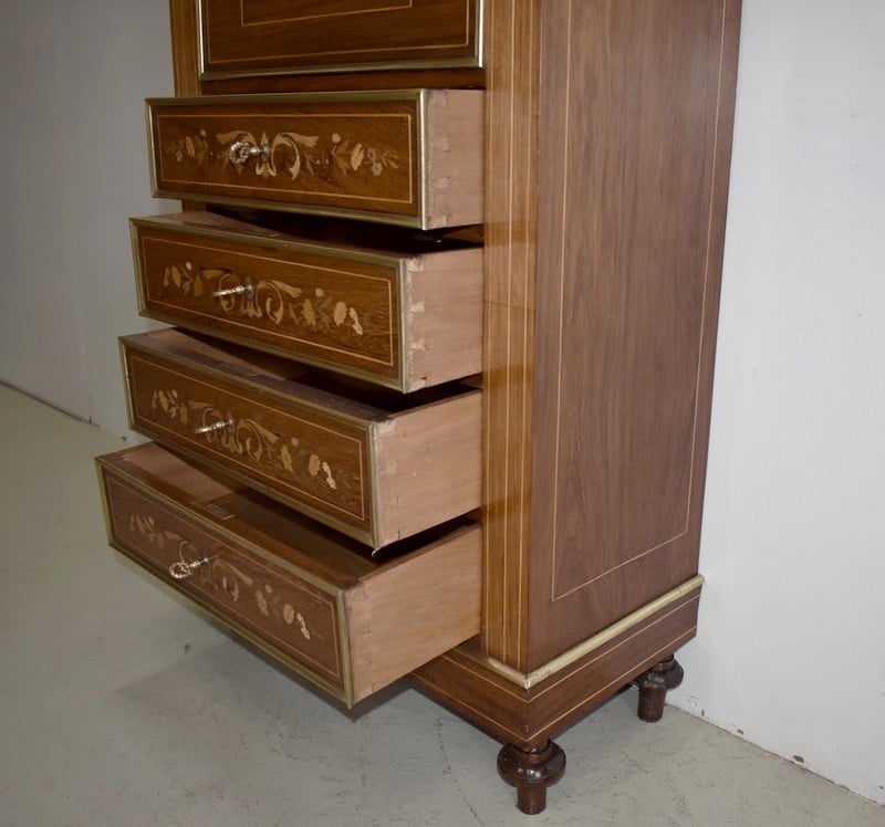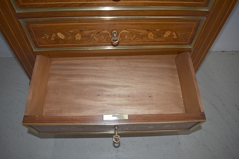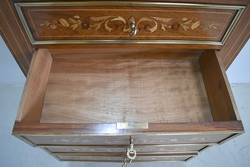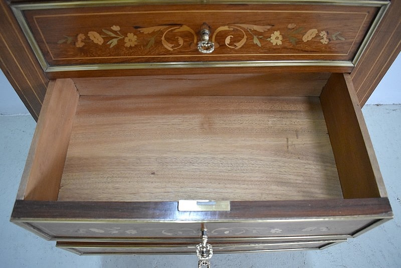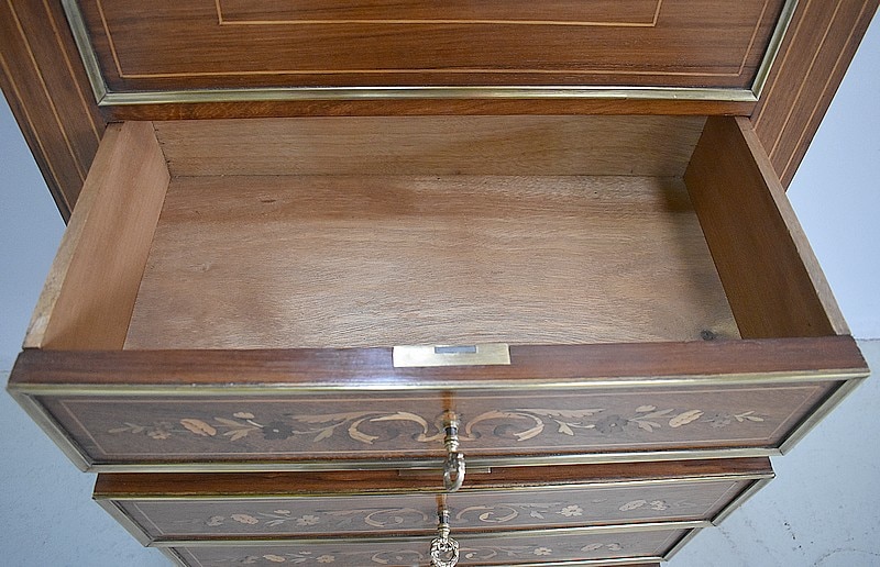 Il ouvre par un tiroir en partie haute, un abattant et 4 tiroirs en partie basse dont les intérieurs sont en acajou , chaque élément est encadré d’une moulure en laiton.