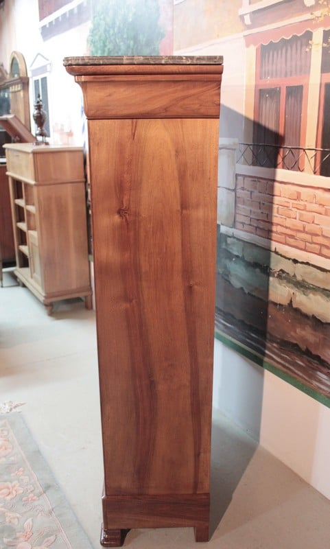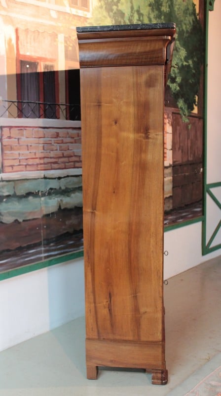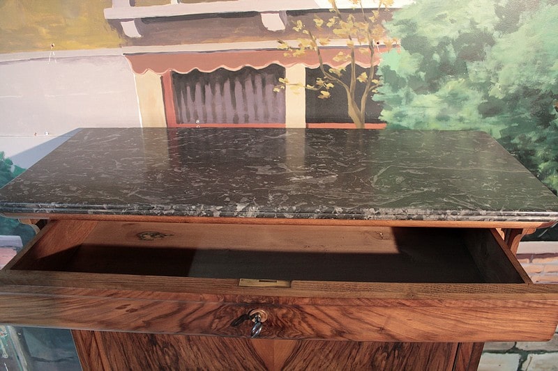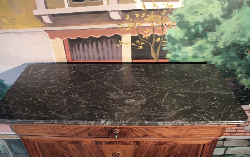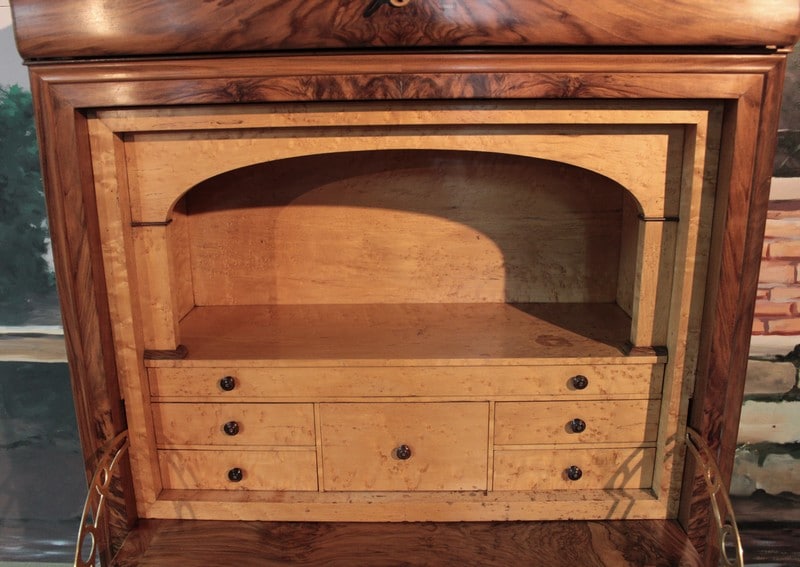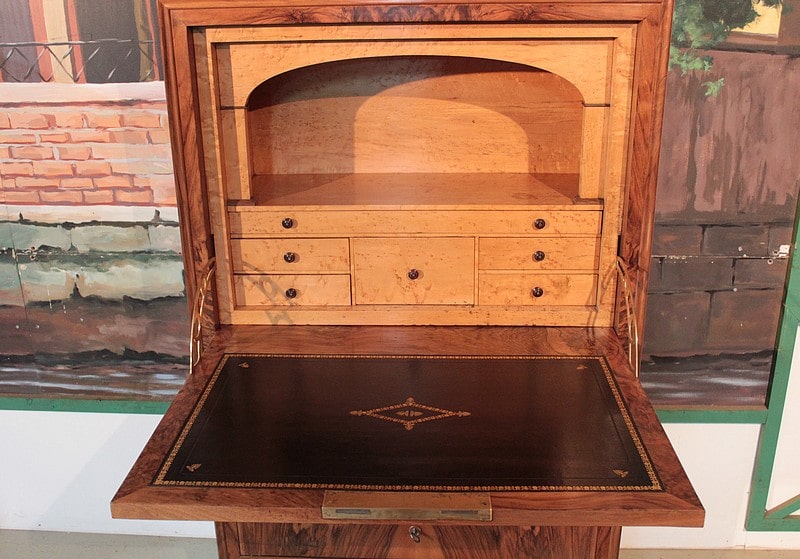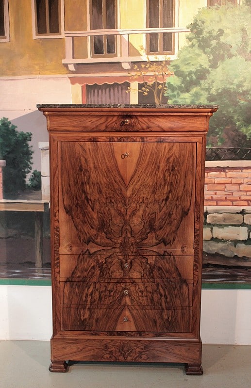 Secrétaire Louis-Philippe en noyer massif pour les côtés et placage de noyer veiné pour la façade. Son dessus est en marbre gris foncé veiné et il ouvre par 1 tiroir à doucine, 1 abattant et 3 tiroirs en partie basse,.