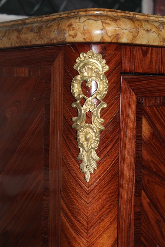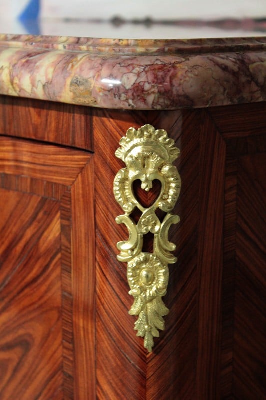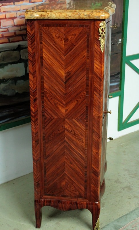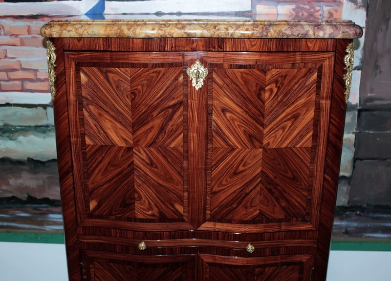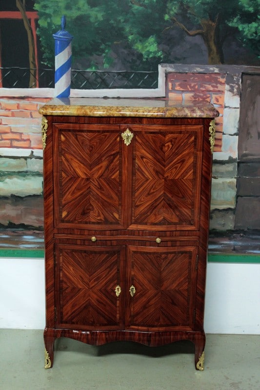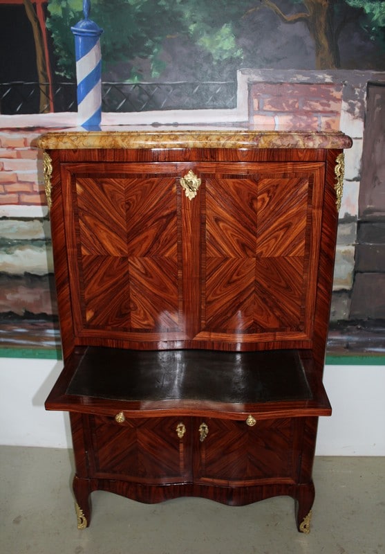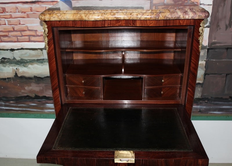 Petit secrétaire de dame de style Louis XV en bois de rose avec filet d’amarante sur les portes. Sa façade est légèrement mouvementée et il ouvre par un abattant, une tirette recouverte de cuir d’origine, et deux petites portes. L’abattant, recouvert de son cuir d’origine, découvre un intérieur en acajou avec casiers et 4 petits tiroirs. Il repose sur des pieds cambrés et est garni de bronzes dorés et ciselés de fleurs. Son dessus est en marbre mouluré très épais de couleur ocre. Sur le haut de deux montants, en diagonale, sous le marbre, une signature ‘LE FLOCH’. Finition verni au tampon. Époque : milieu du XIXe.