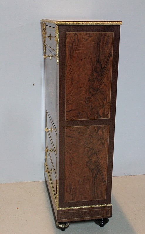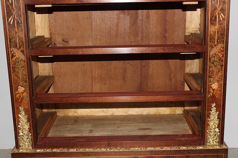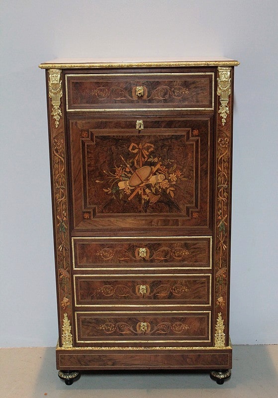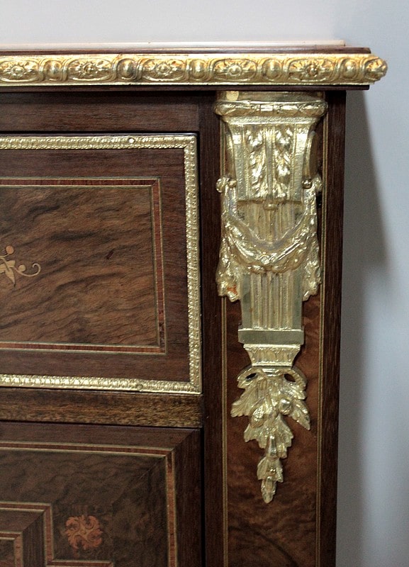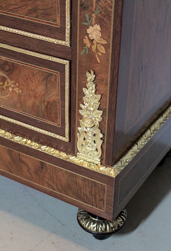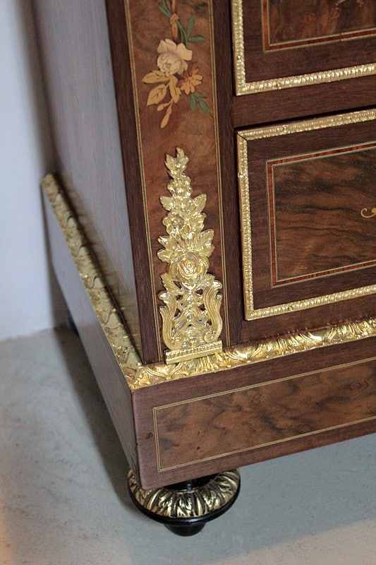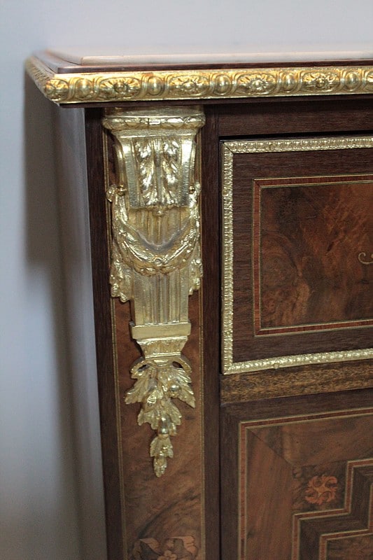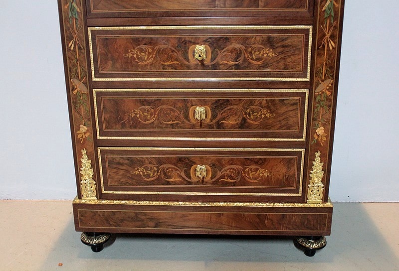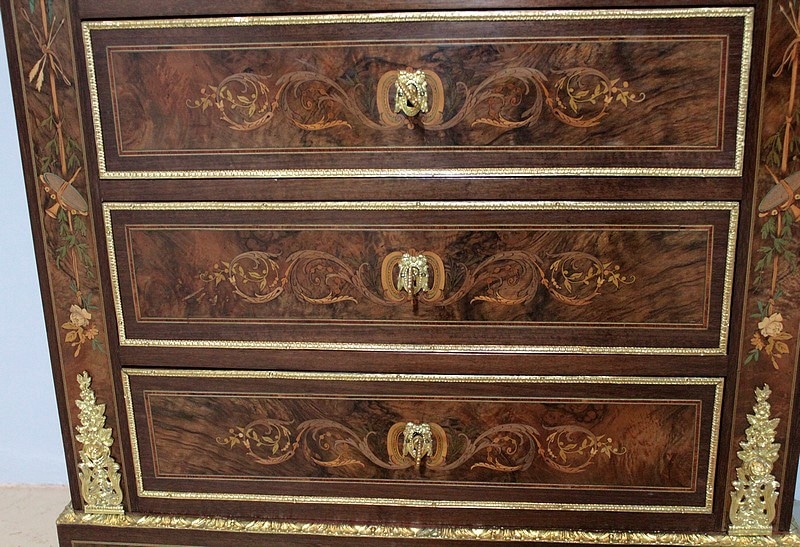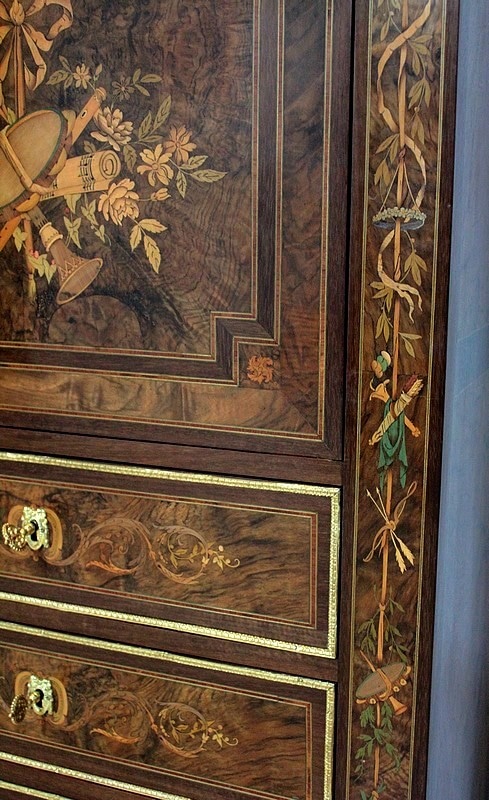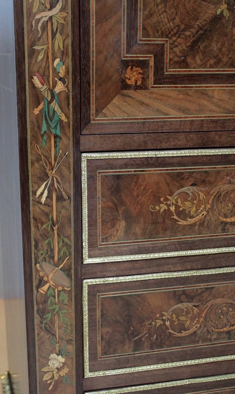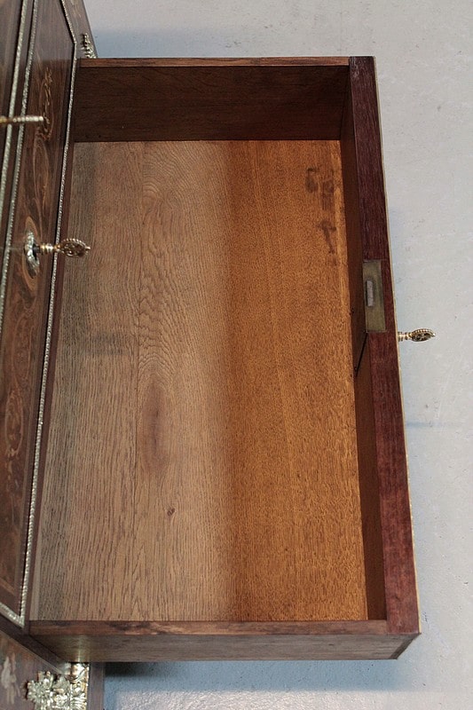 Ce modèle très riche en bronzes et marqueteries de rinceaux, fleurs, feuilles, instruments de musique et carquois est étiqueté à l’arrière du nom du fabricant : ‘Rue de la Roquette, 21 – SCHAMBER – Fabrique et Magasin de Meubles de Luxe – Genre Boule et Bois de Rose – PARIS’