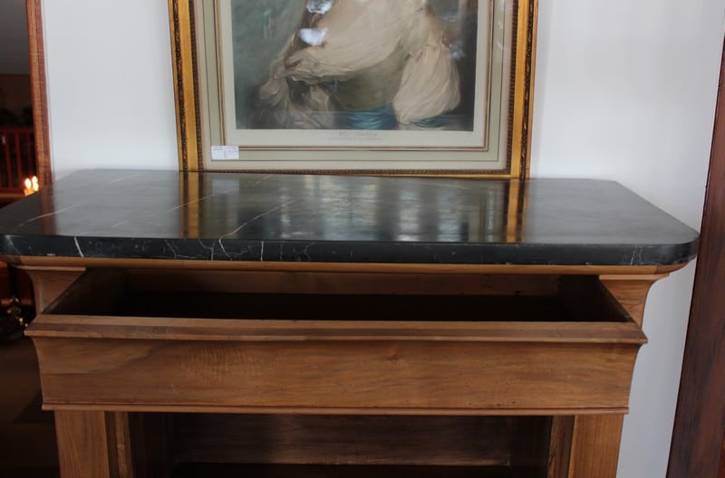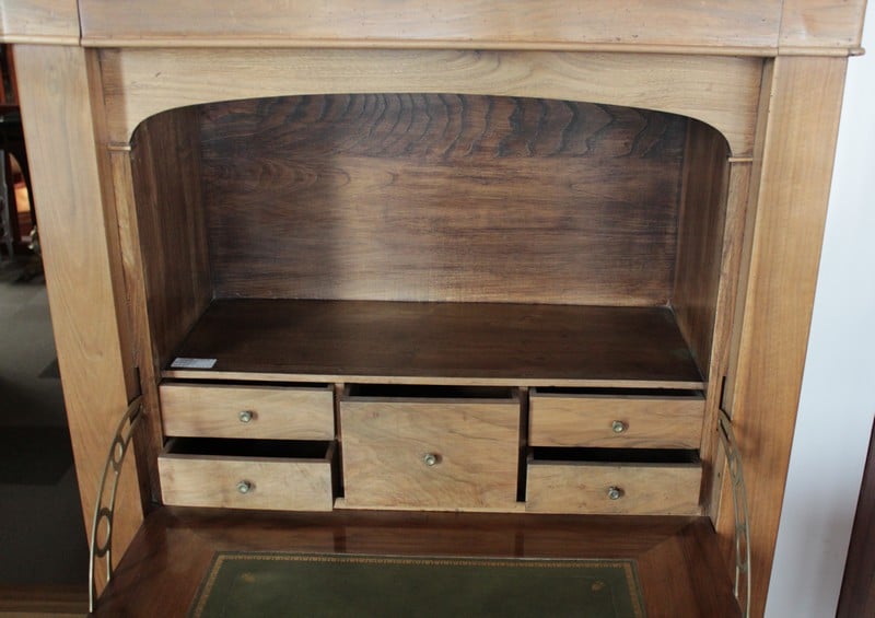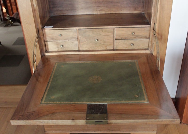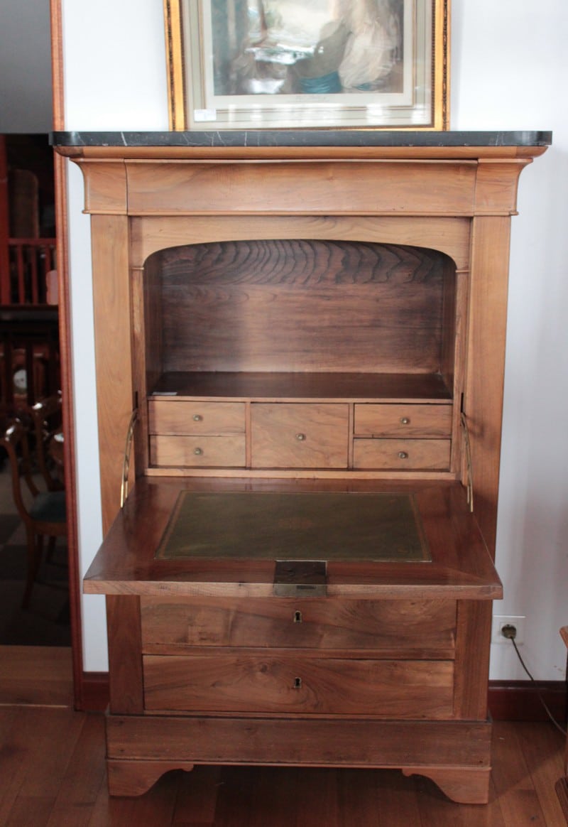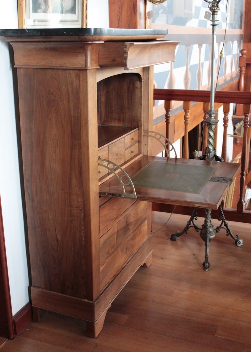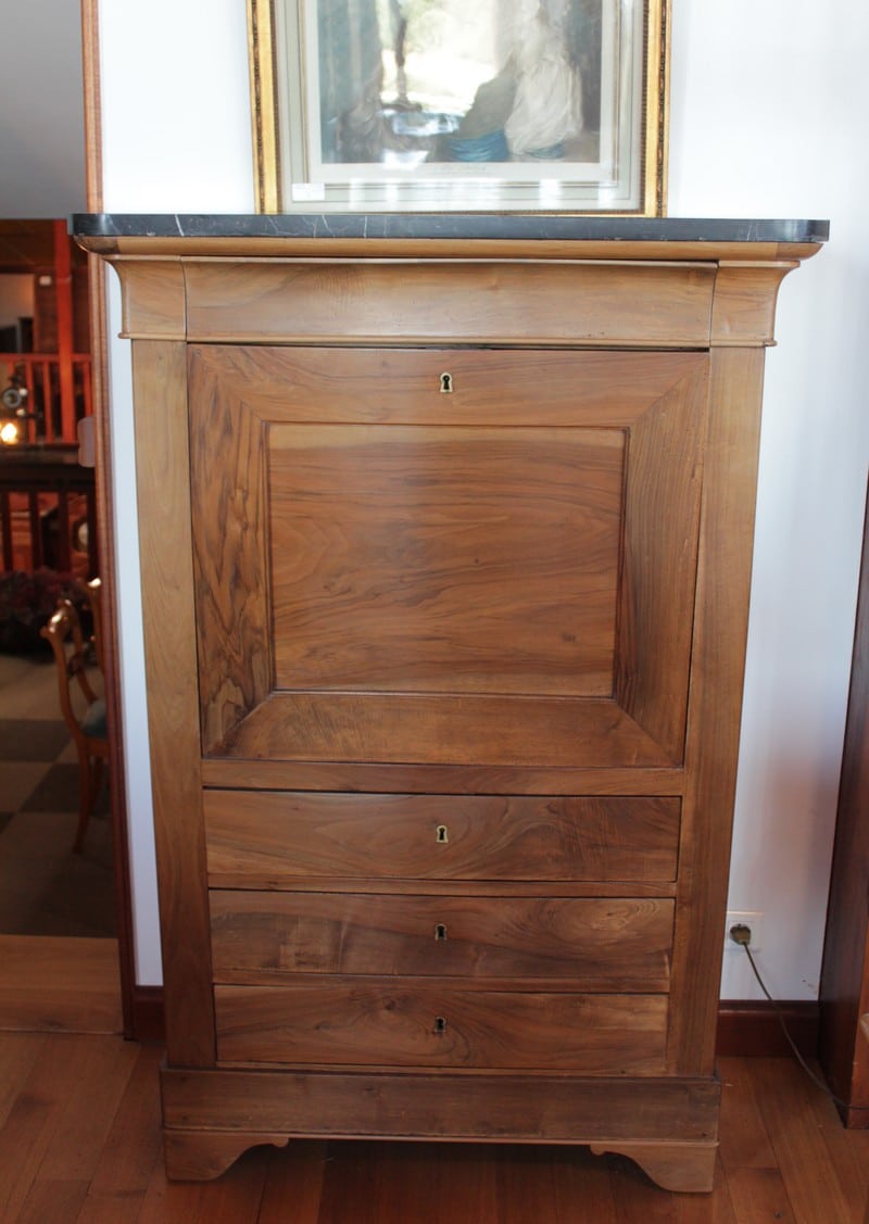 Secrétaire Restauration en noyer massif avec dessus en marbre noir. Il ouvre par 1 tiroir en partie haute, 1 abattant recouvert d’un cuir vert (changé) et 3 tiroirs en partie basse. Le théâtre est garni de 4 petits tiroirs et 1 double au milieu. Époque Restauration 1830.