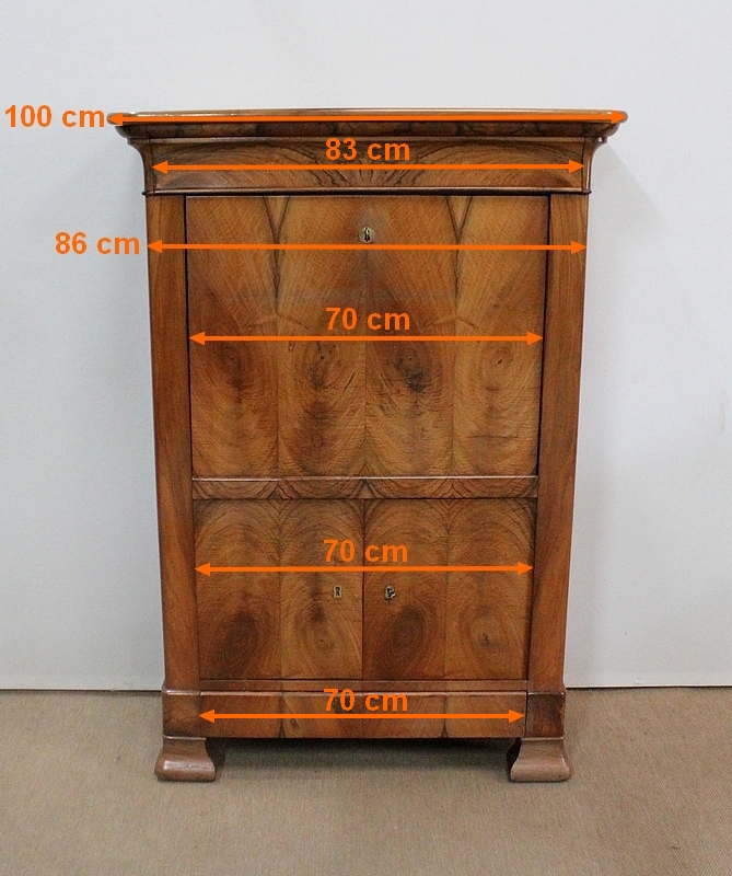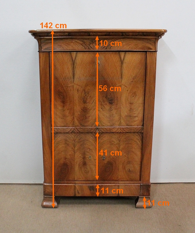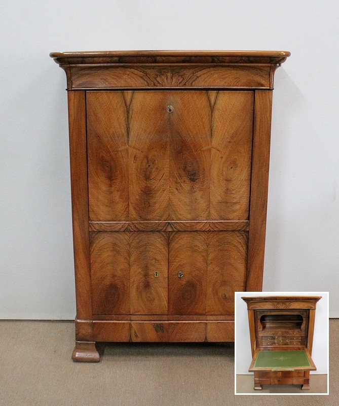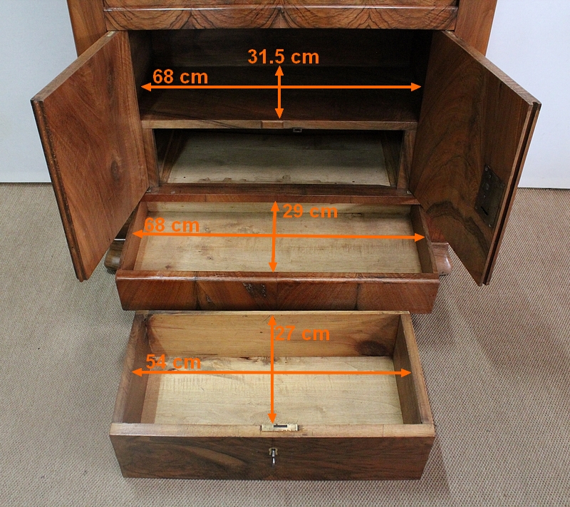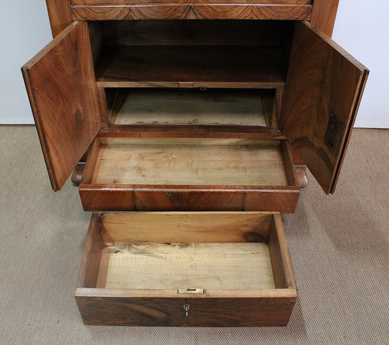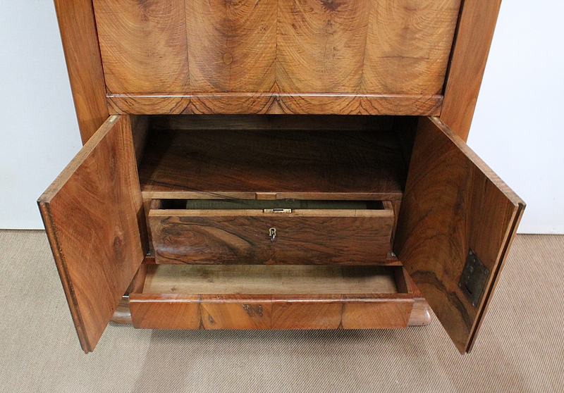 En partie basse de ce secrétaire, deux portes dont la fermeture se fait à noix avec serrure sur crochet d’origine, révèlent une étagère et un grand tiroir se fermant à clé. La plinthe quant à elle dissimule un autre tiroir muni de quatre feuilles de ronce de noyer également.