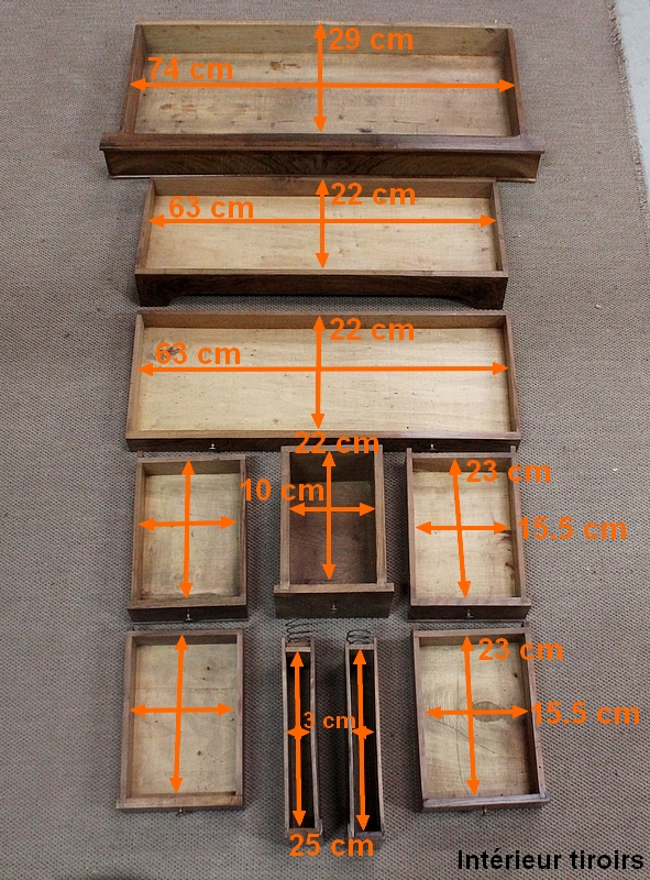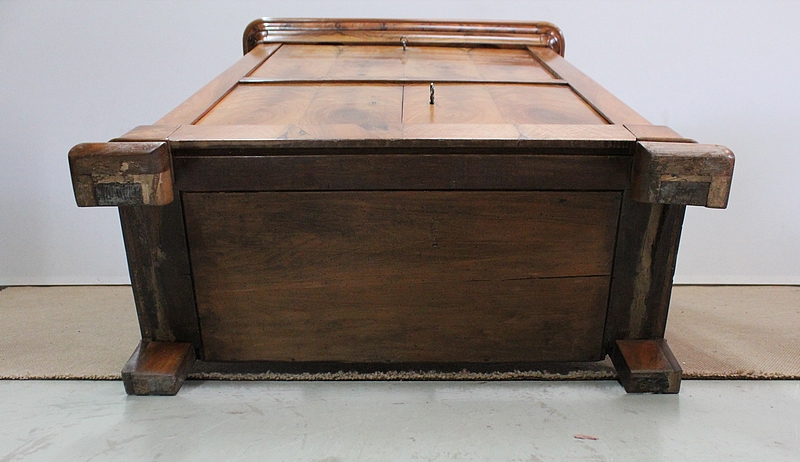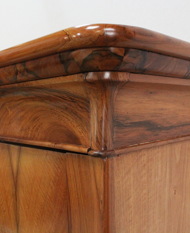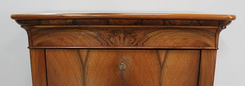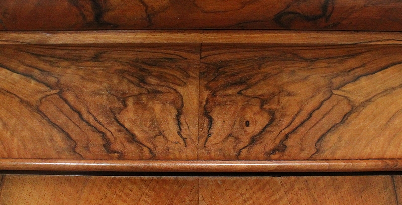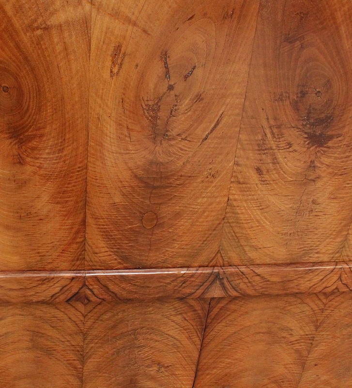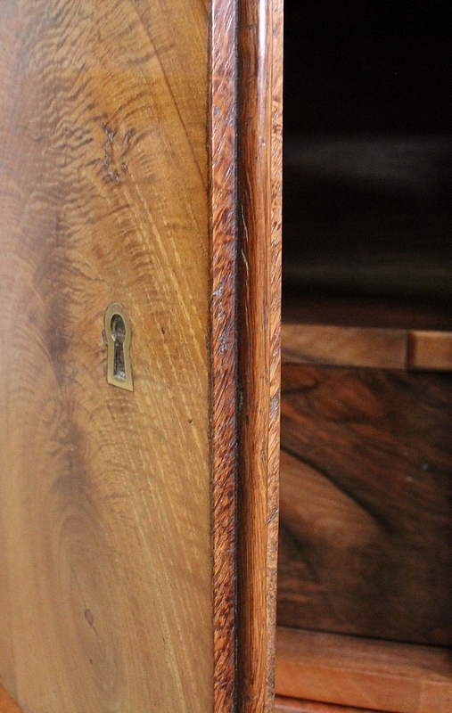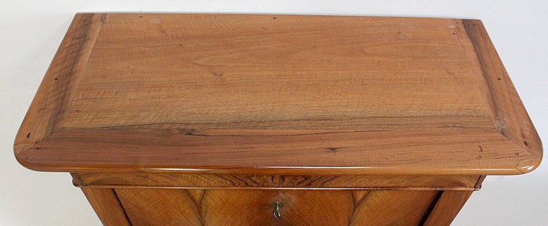 En partie basse de ce secrétaire, deux portes dont la fermeture se fait à noix avec serrure sur crochet d’origine, révèlent une étagère et un grand tiroir se fermant à clé. La plinthe quant à elle dissimule un autre tiroir muni de quatre feuilles de ronce de noyer également.