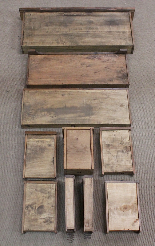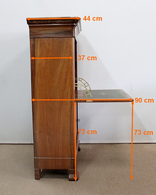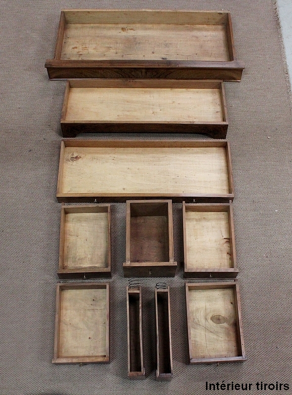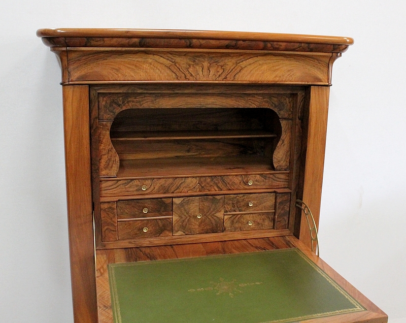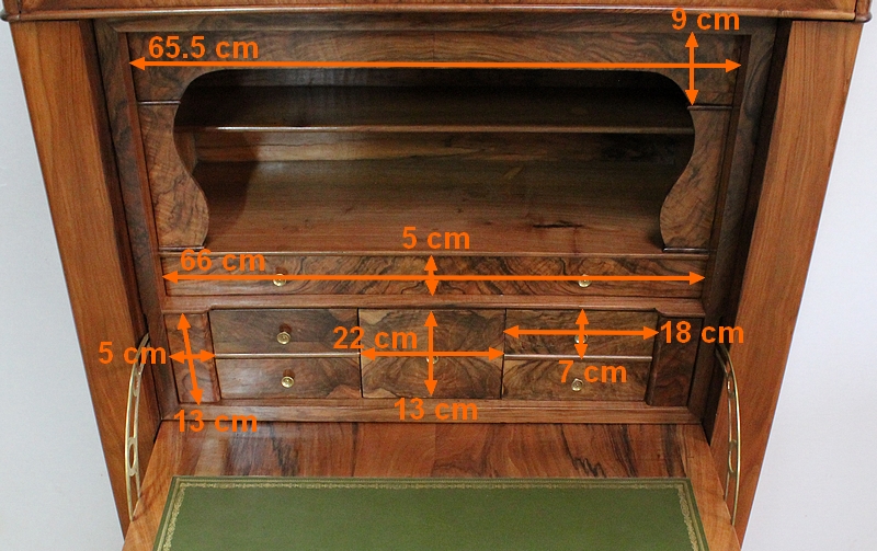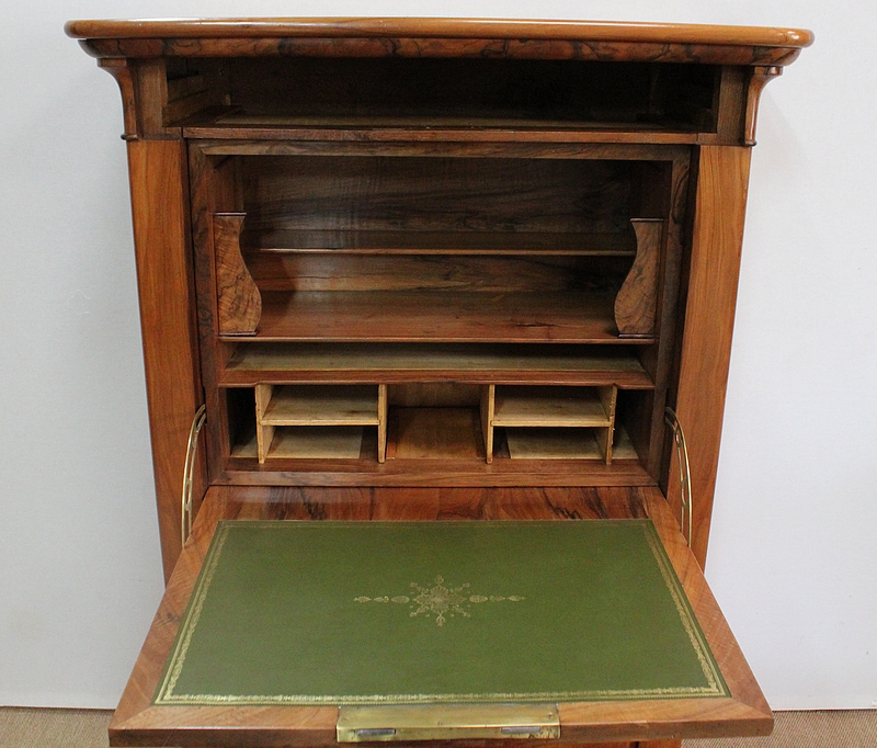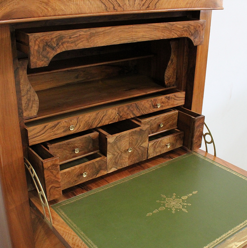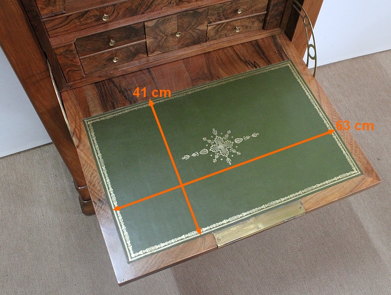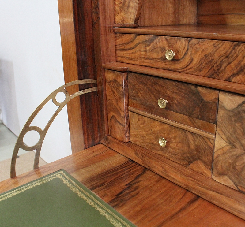 Ce meuble propose également un abattant composé de quatre feuilles de placage épais à développé en ronce de Noyer. A l’ouverture, cet abattant garni d’un cuir vert à vignette et motif central dorés révèle un tabernacle doté en partie haute d’un tiroir suivi d’une ouverture avec tablette en retrait et d’un ensemble de tiroirs de différentes tailles. A noter, deux tiroirs secrets sont présents aux extrémités et se déverrouillent par un mécanisme intérieur.