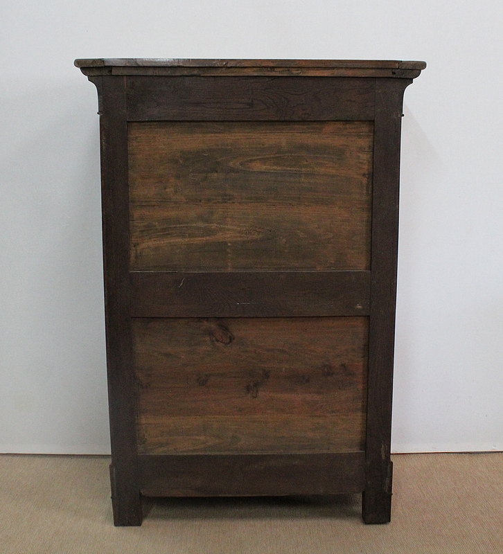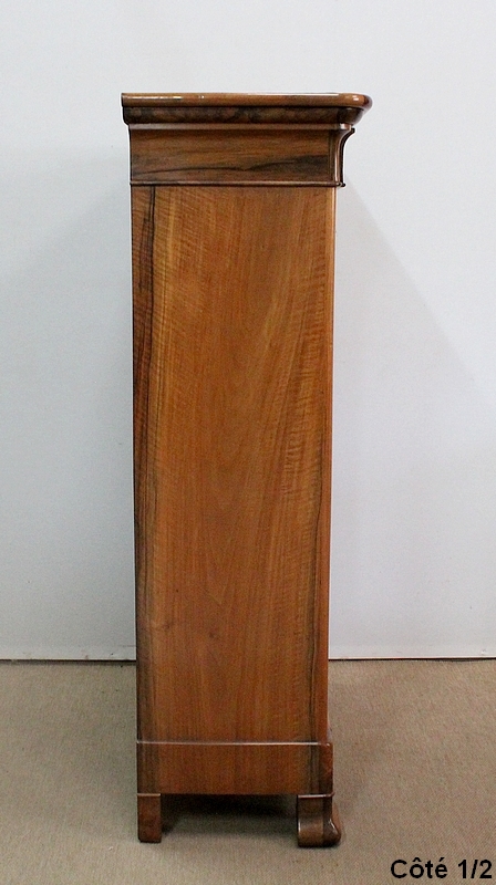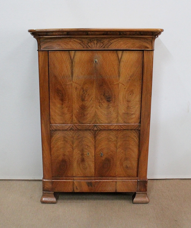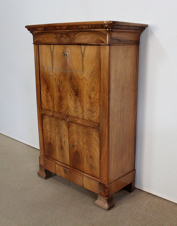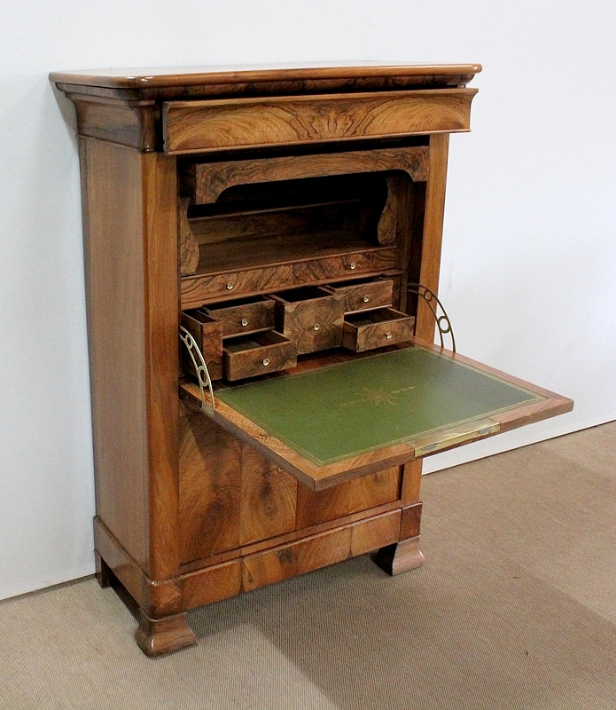 Secrétaire d’époque Restauration en placage de Ronce de Noyer et Noyer Massif doté en partie haute d’un tiroir en ceinture s’ouvrant par deux encoches en dessous.