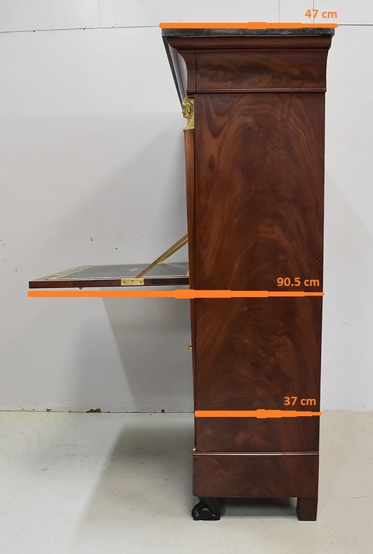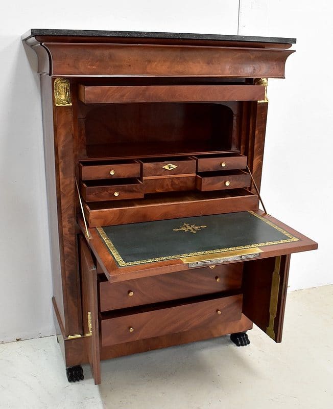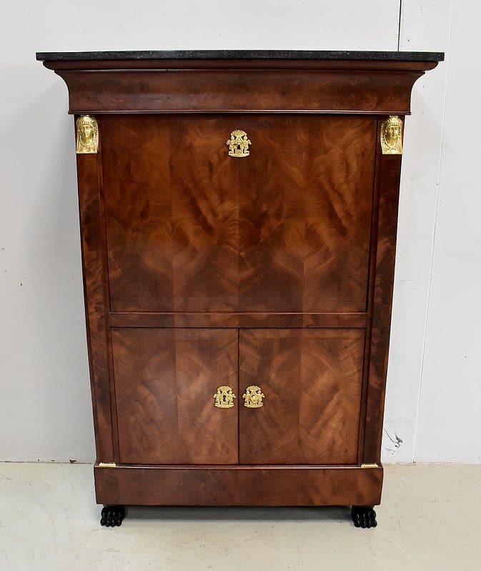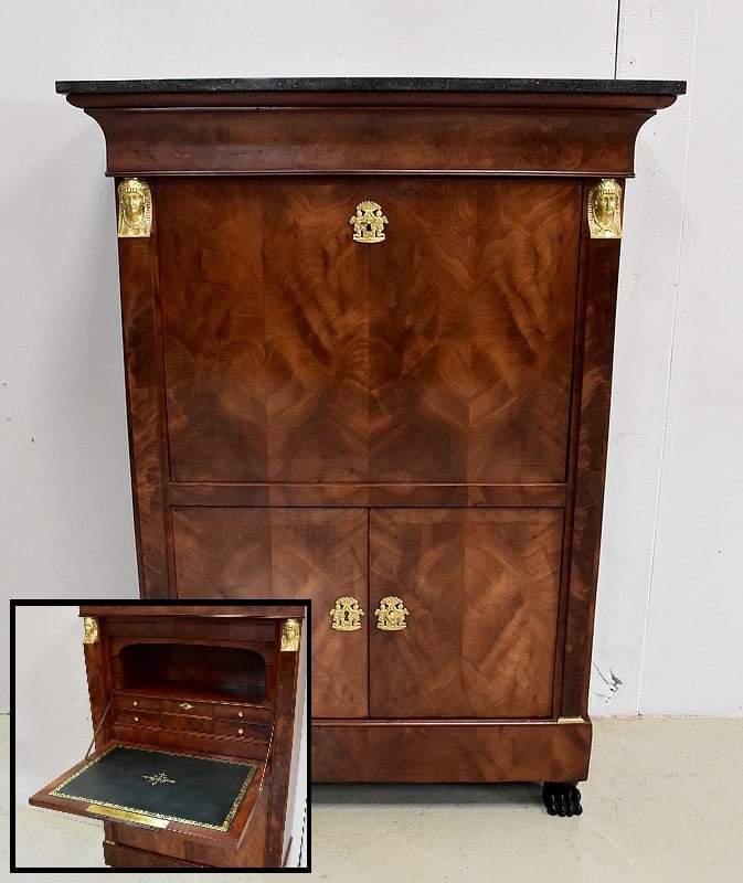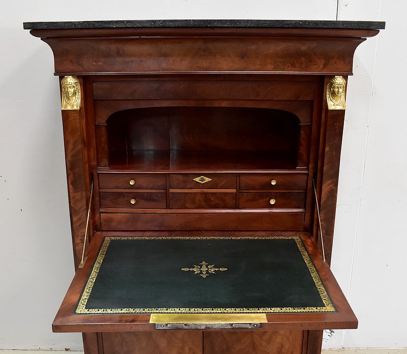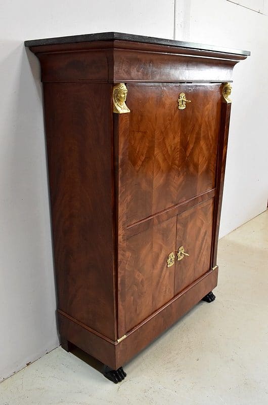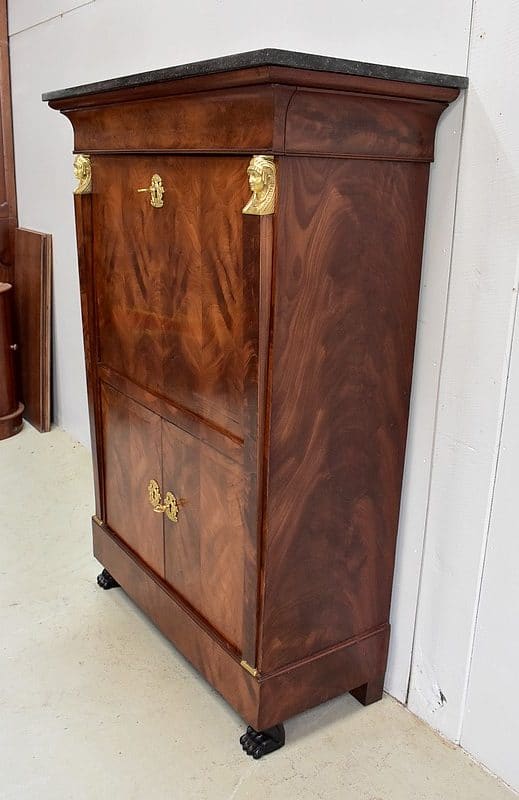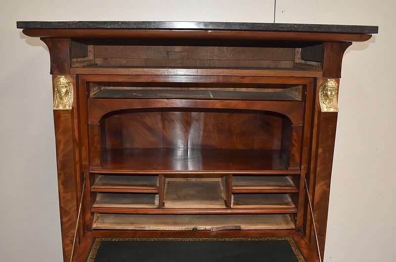Secrétaire ‘Retour d’Égypte’, en Placage de Ronce d’Acajou, avec dessus Marbre à dominante Gris foncé discrètement nuancé de Noir et de Blanc.