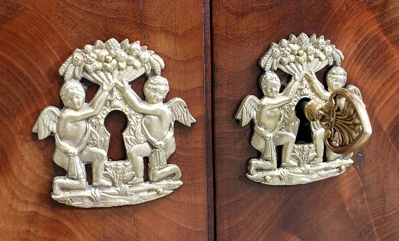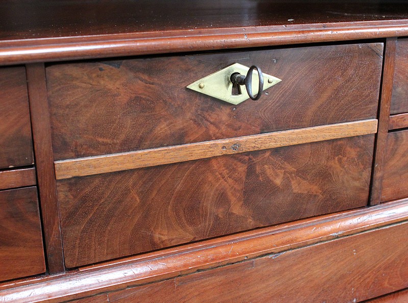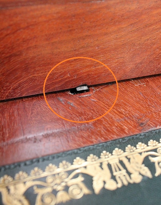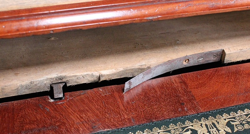Ce Secrétaire est fourni avec ses deux clés récentes, ajustées aux Généreuses entrées de serrures d’Origine, toutes en Laiton finement ouvragé. On remarquera la Fiabilité des Verrous, à points d’accroches doubles pour l’abattant, haut et bas pour la porte de droite.