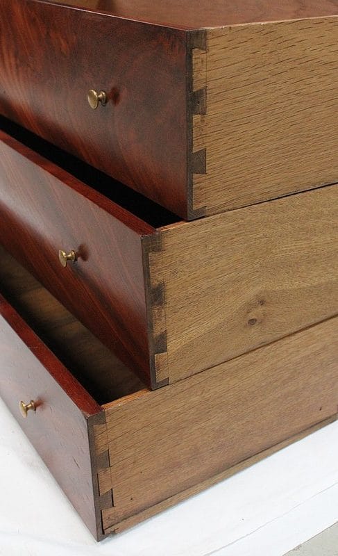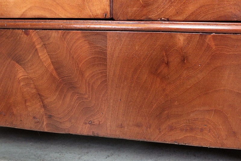 En partie basse, ce Meuble ouvre par deux portes. Elles abritent trois autres tiroirs, disposés sur trois rangs et assemblés en Queues d’Arondes.
