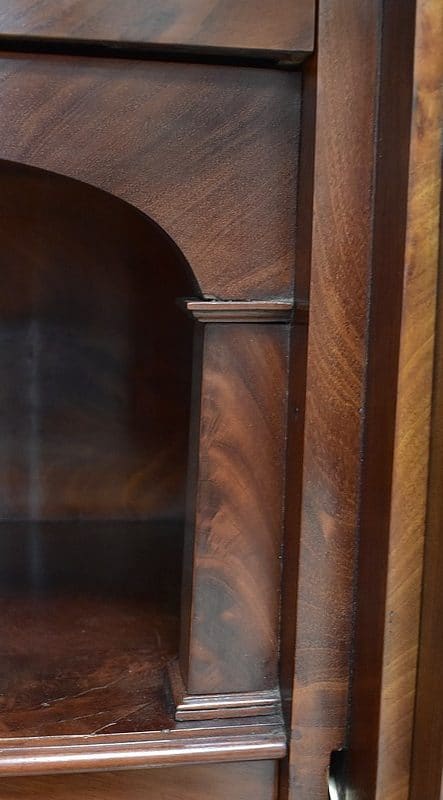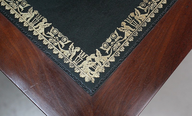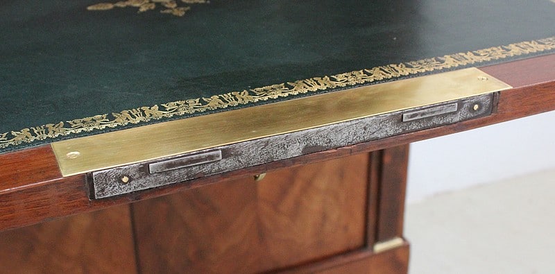 En dessous, ce Secrétaire offre un abattant à quatre feuilles de Placage symétriques. Il découvre un Tabernacle composé d’une Niche, enjolivée par un panneau découpé en Arche et Colonnes factices. Ce Théâtre propose également sept tiroirs aux capacités diverses, dont le dernier est à ouverture Secrète. L’espace de travail, Solidement maintenu à l’horizontal par une Paire de Compas Droits, est recouvert d’un Cuir de couleur Verte, à Vignette Centrale et Frise Dorée.