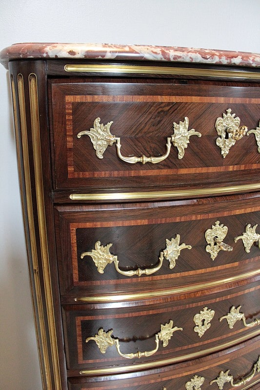 Les tiroirs sont ornés de poignées de tirage et d’entrées de serrures en bronze.
