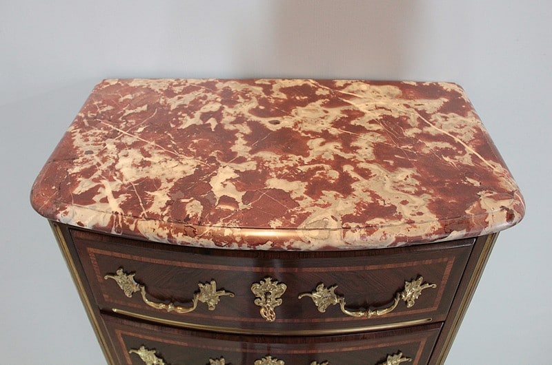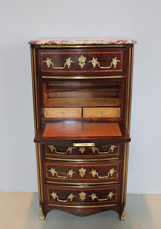 Secrétaire formant Semainier de style Régence en placage de bois de violette avec filets de bois de rose. Dessus en marbre rouge des Pyrénées.